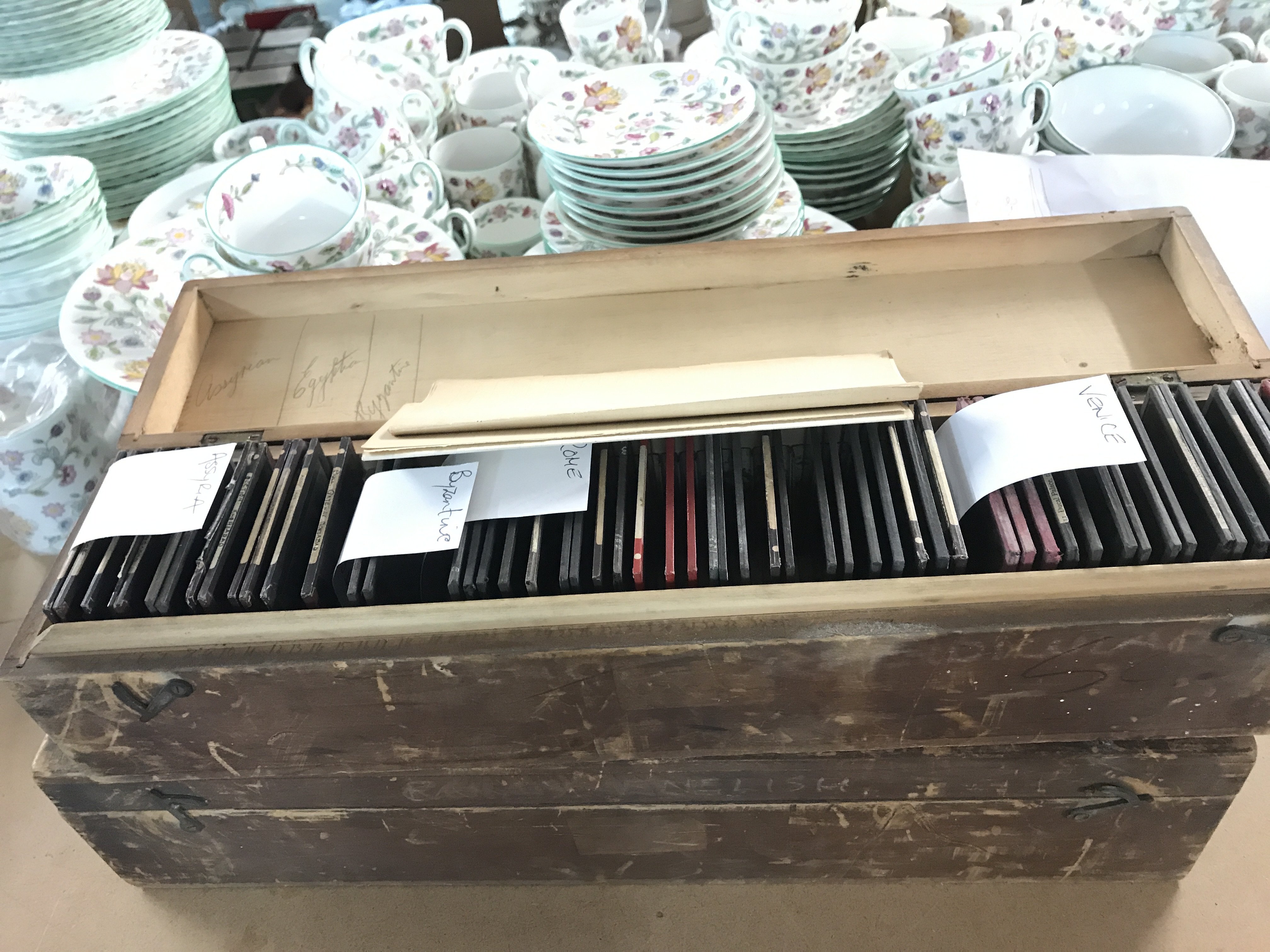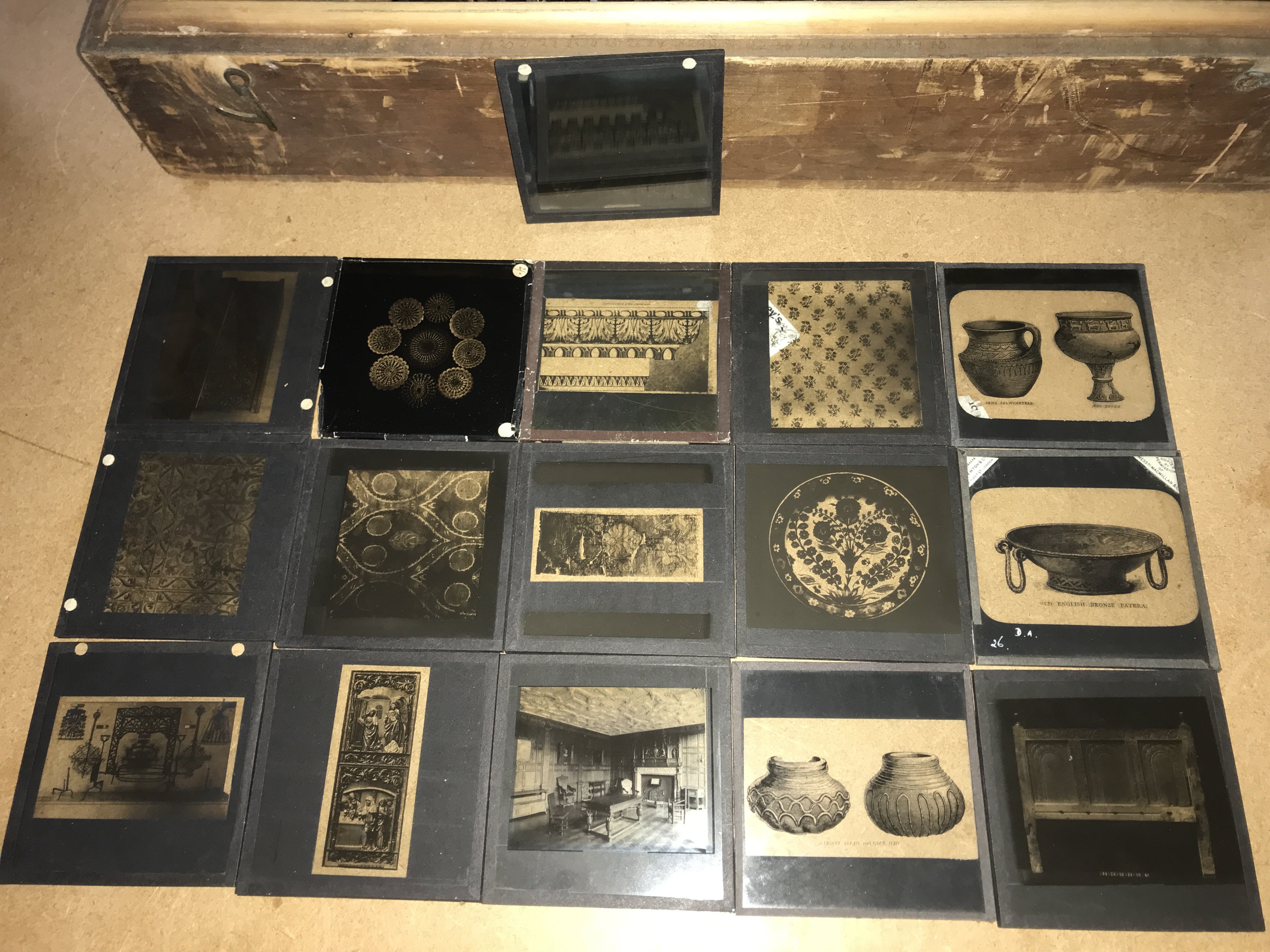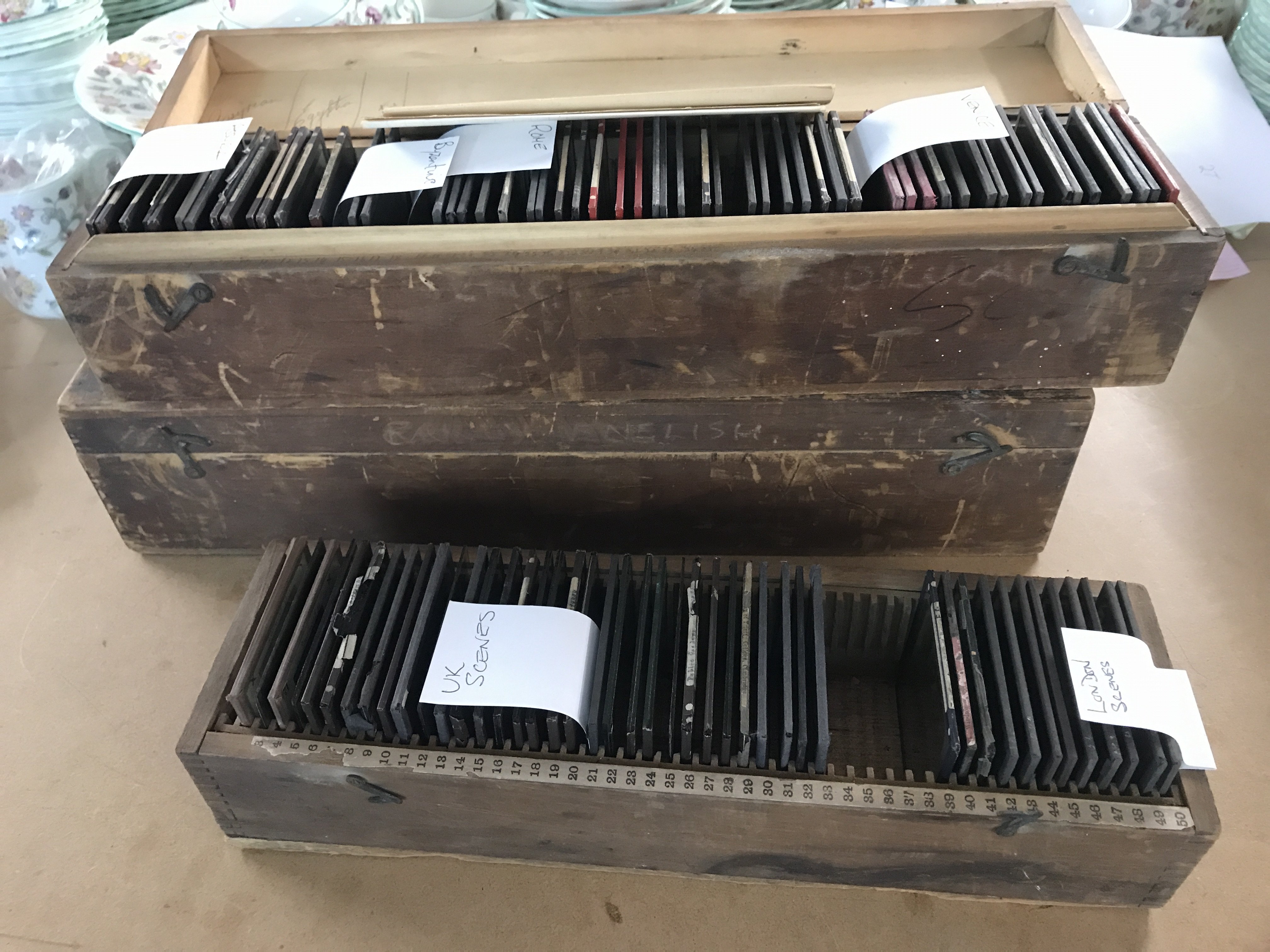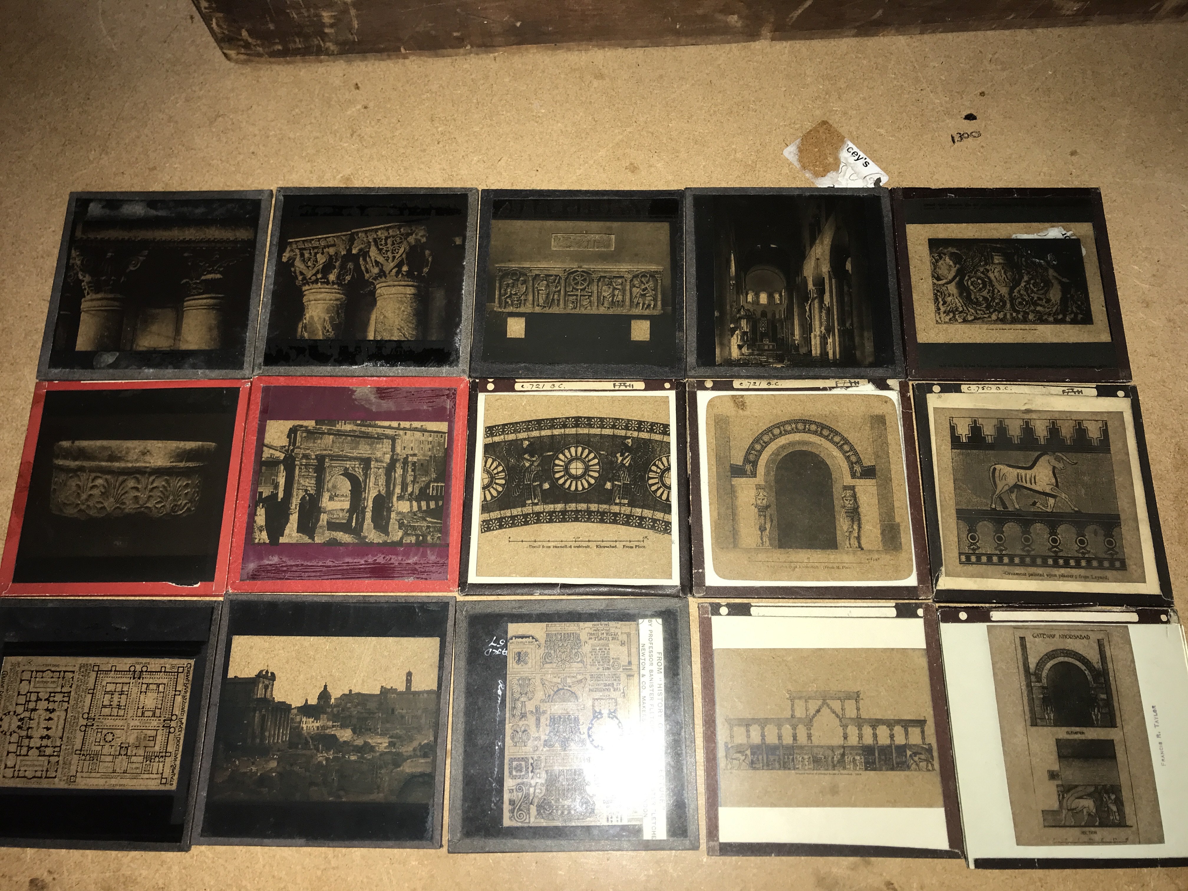 Cases of vintage magic lantern slides of various subjects including British scene photographs , Rome, Venice etc. this lot cannot be posted