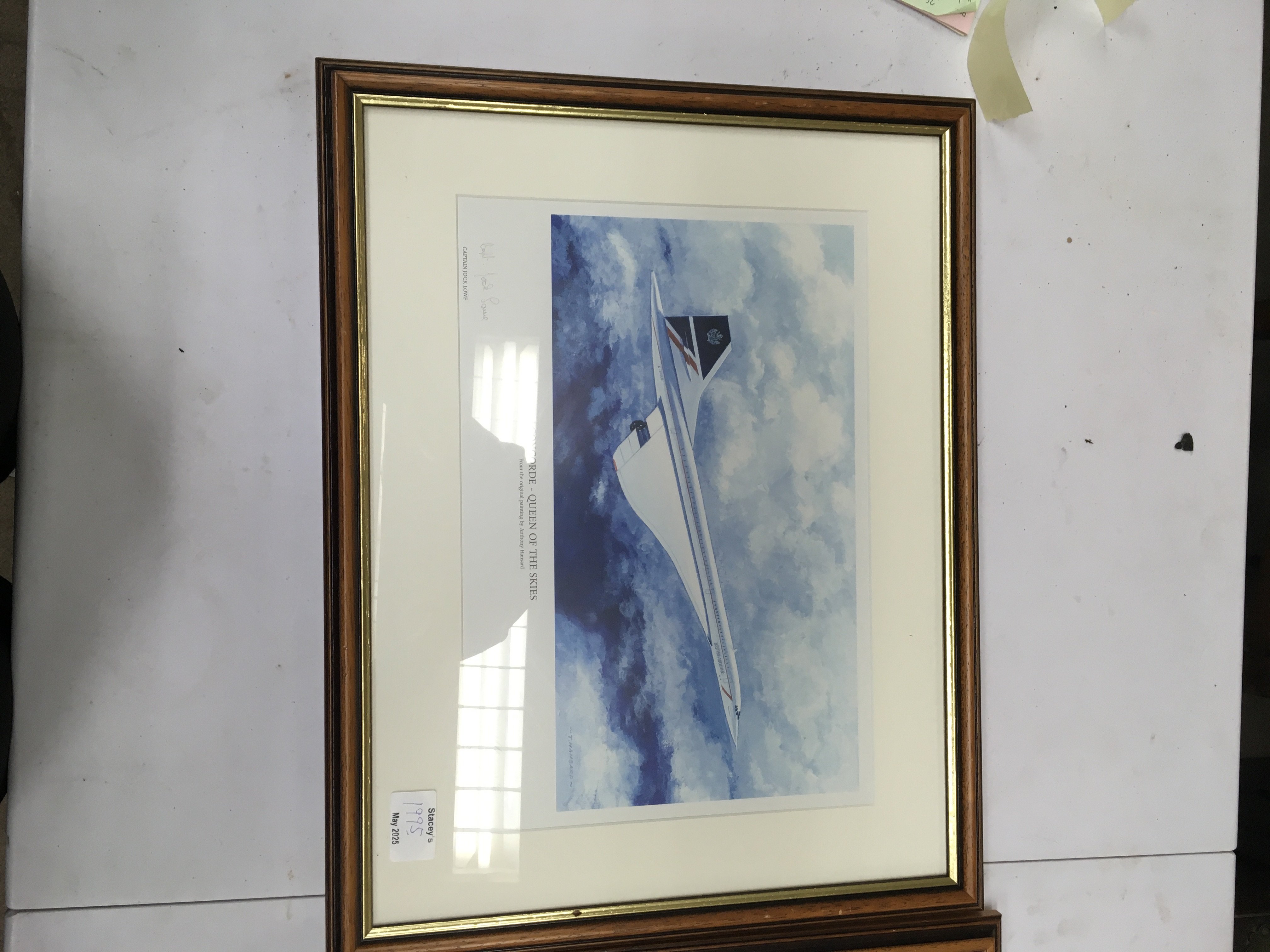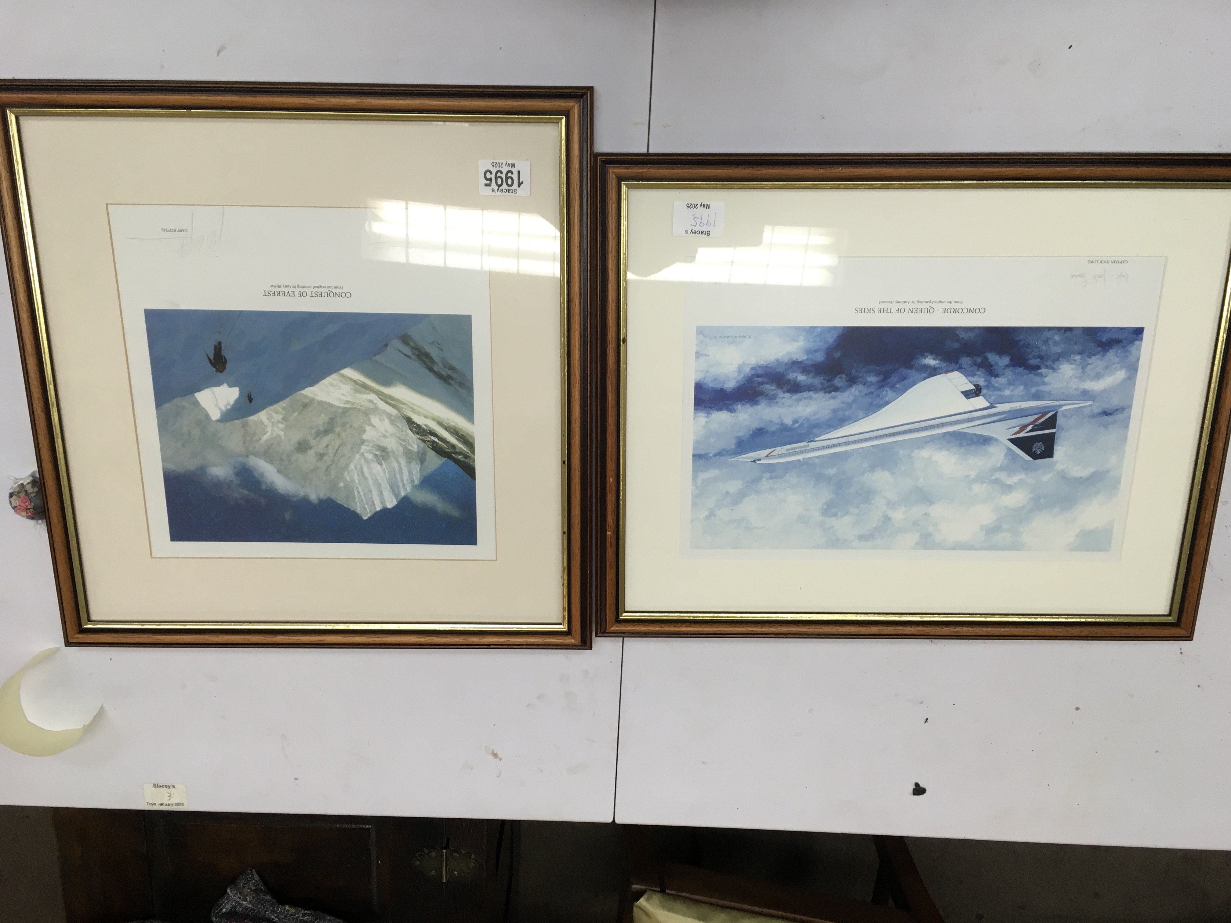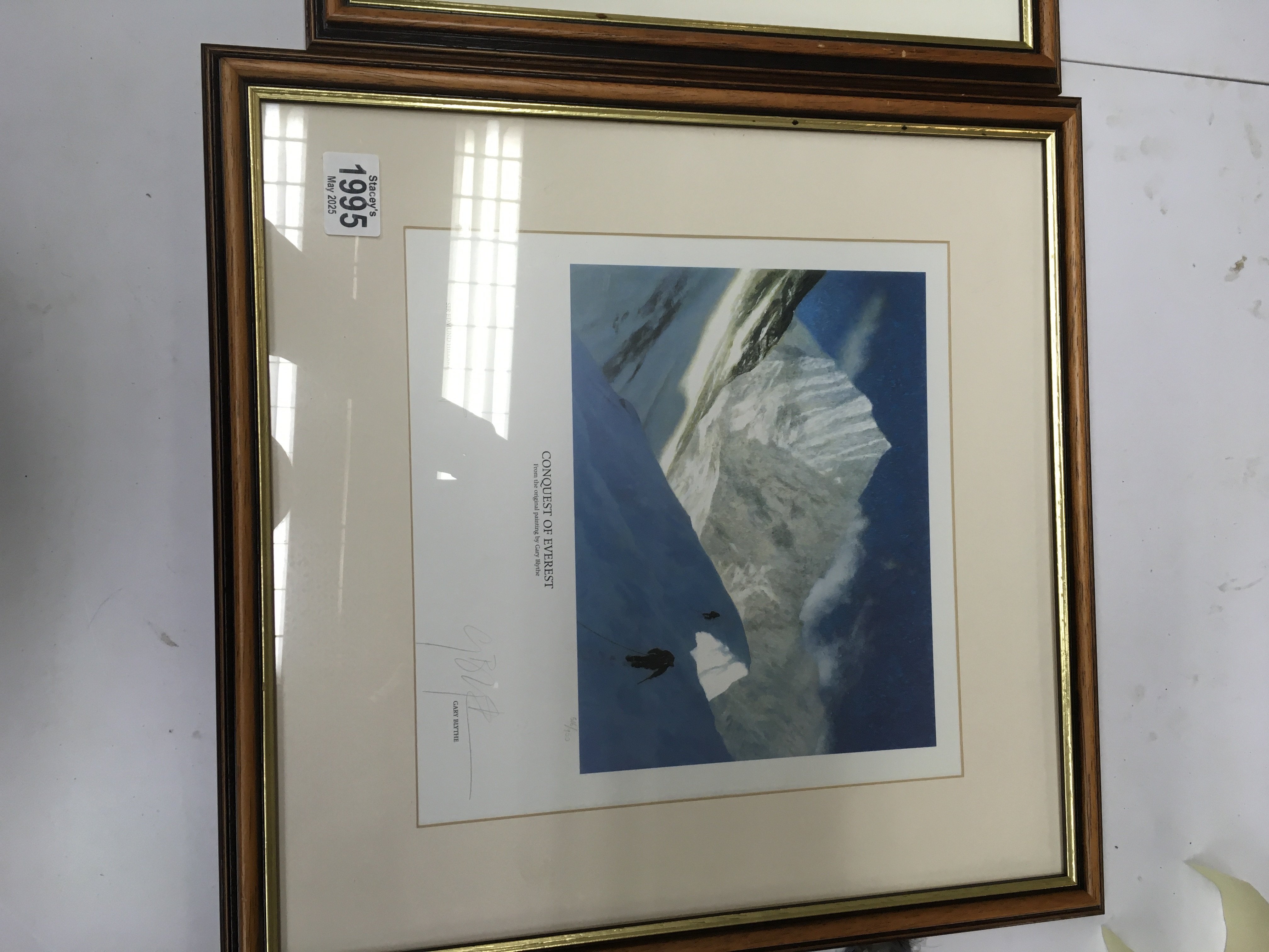 2 framed prints depicting the concorde-queen of the skies and conquest of everest signed by captin jack lowe, anthony hansard, sir edmund hillary and gary blythe