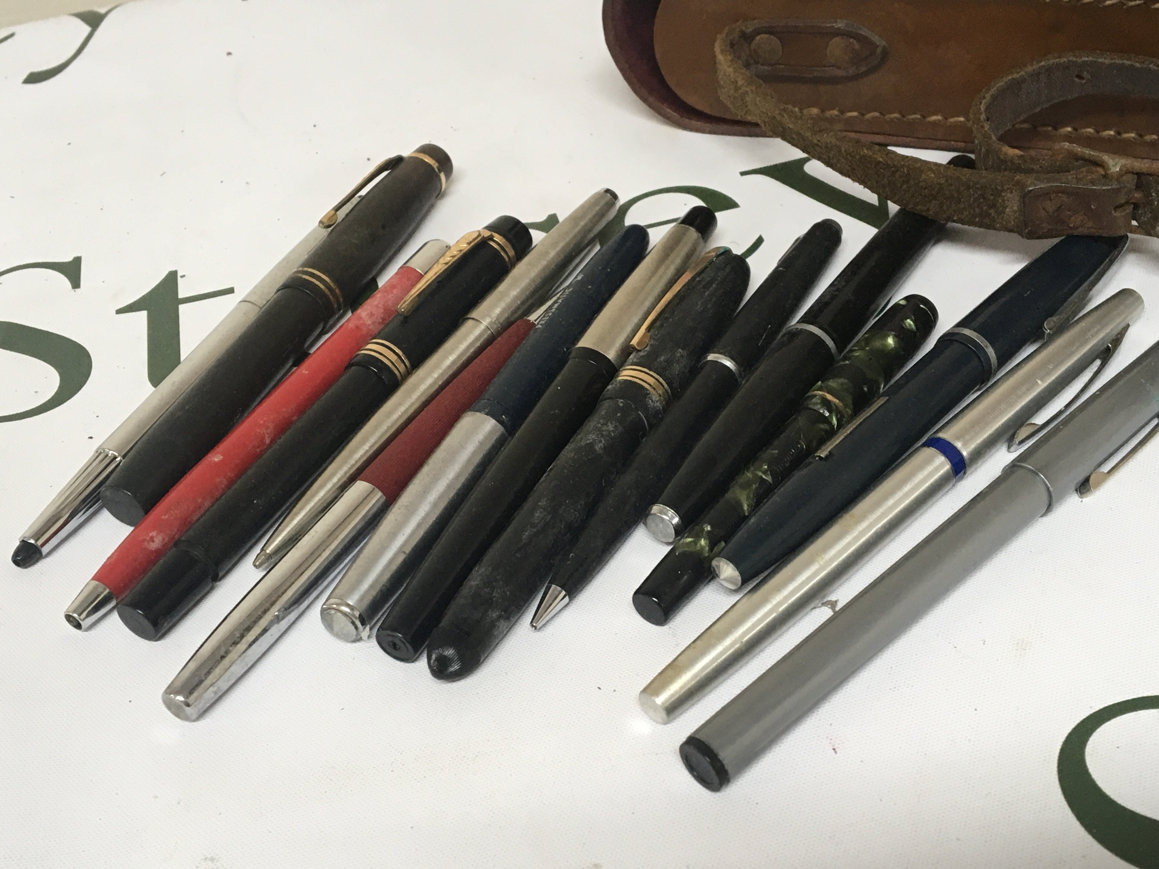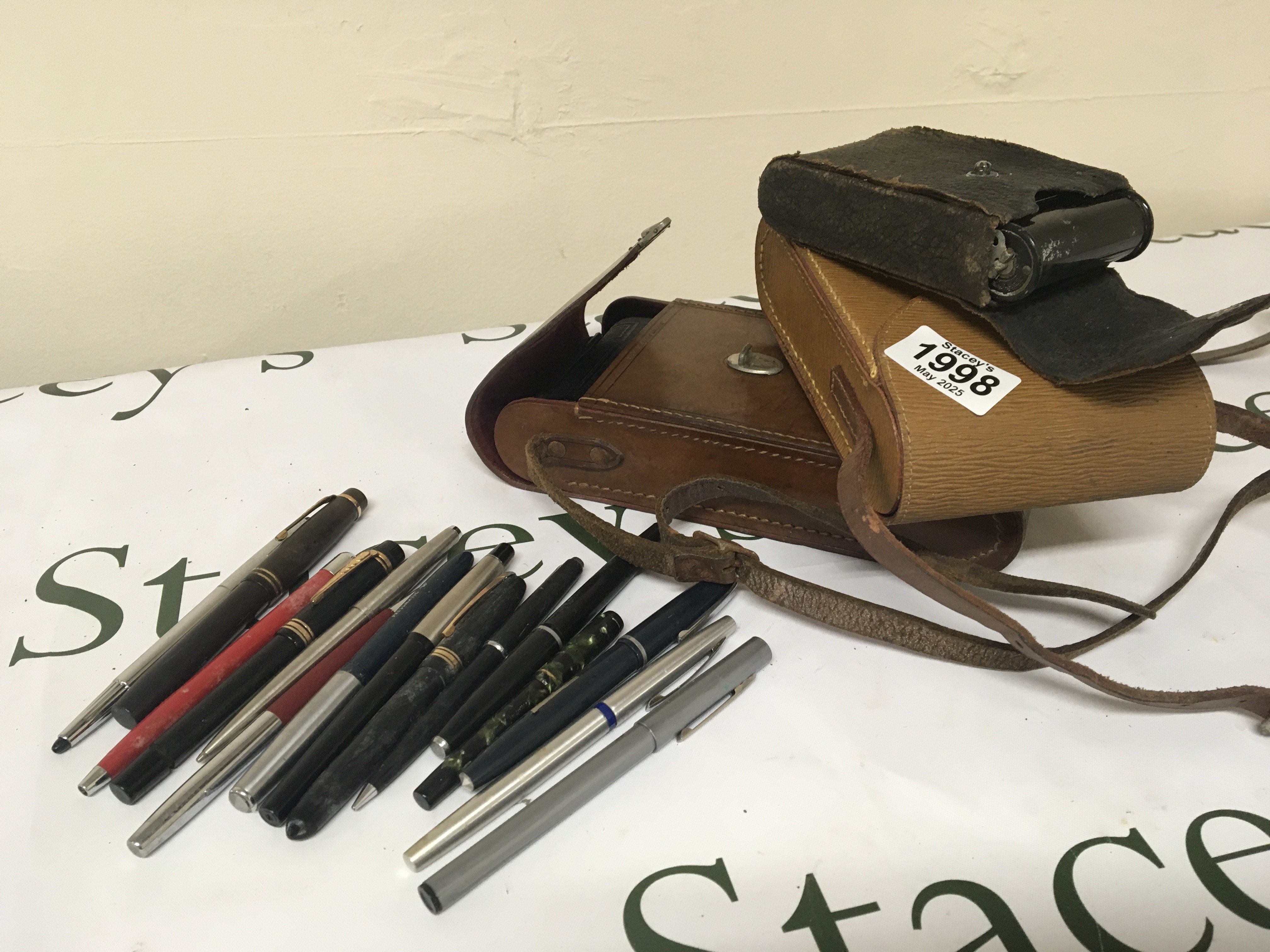 A collection of fountain pens some coloured cases and other pens and three vintage cameras.