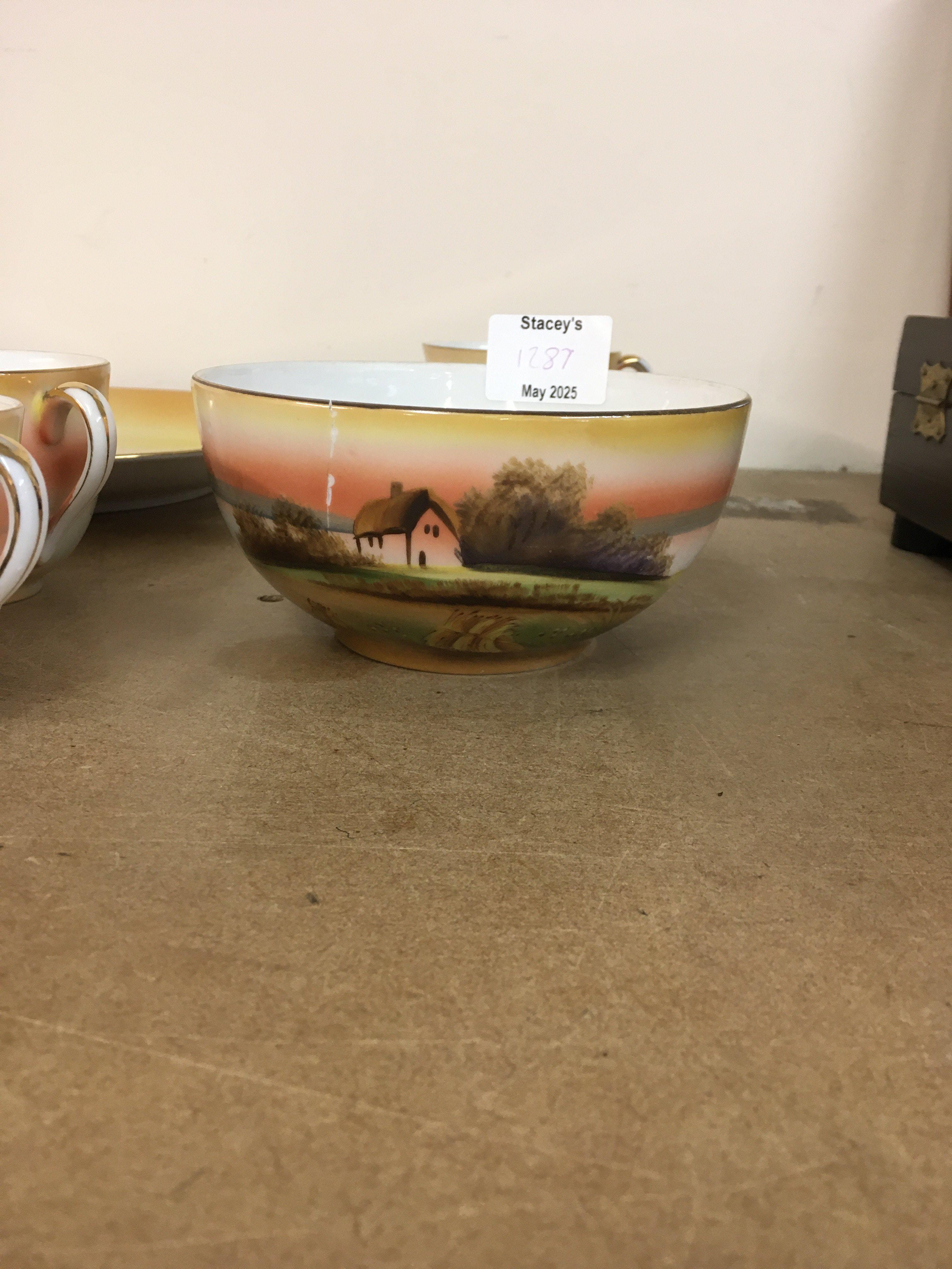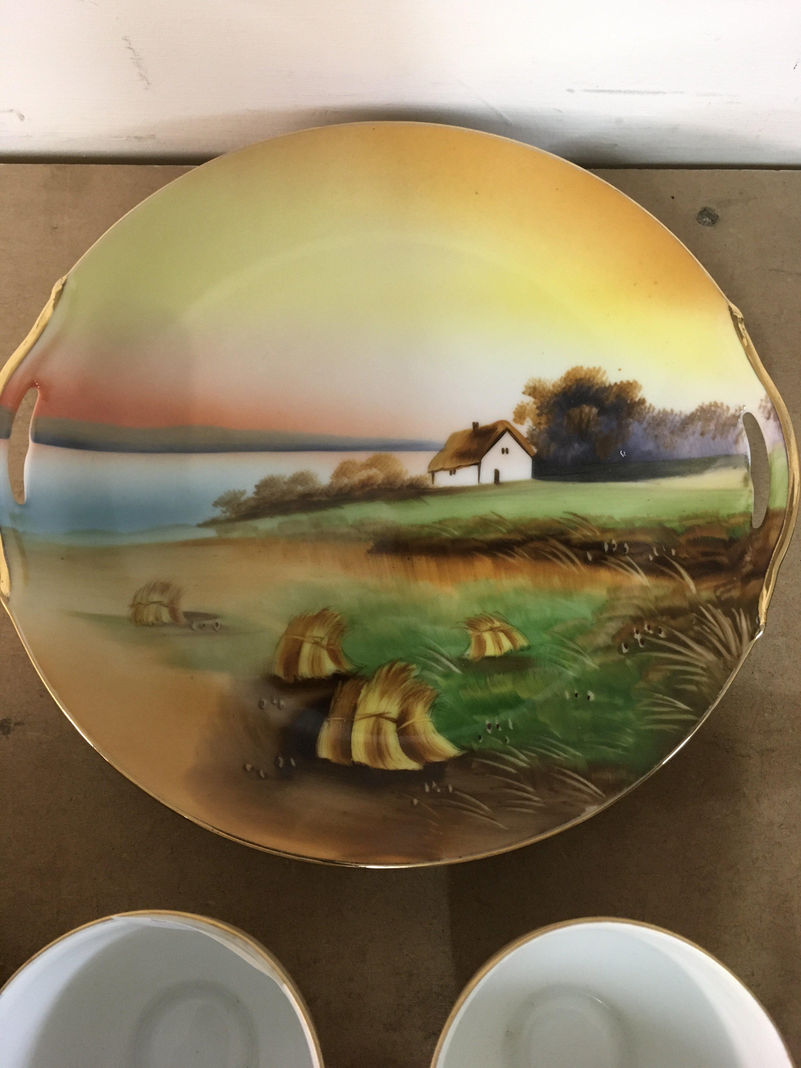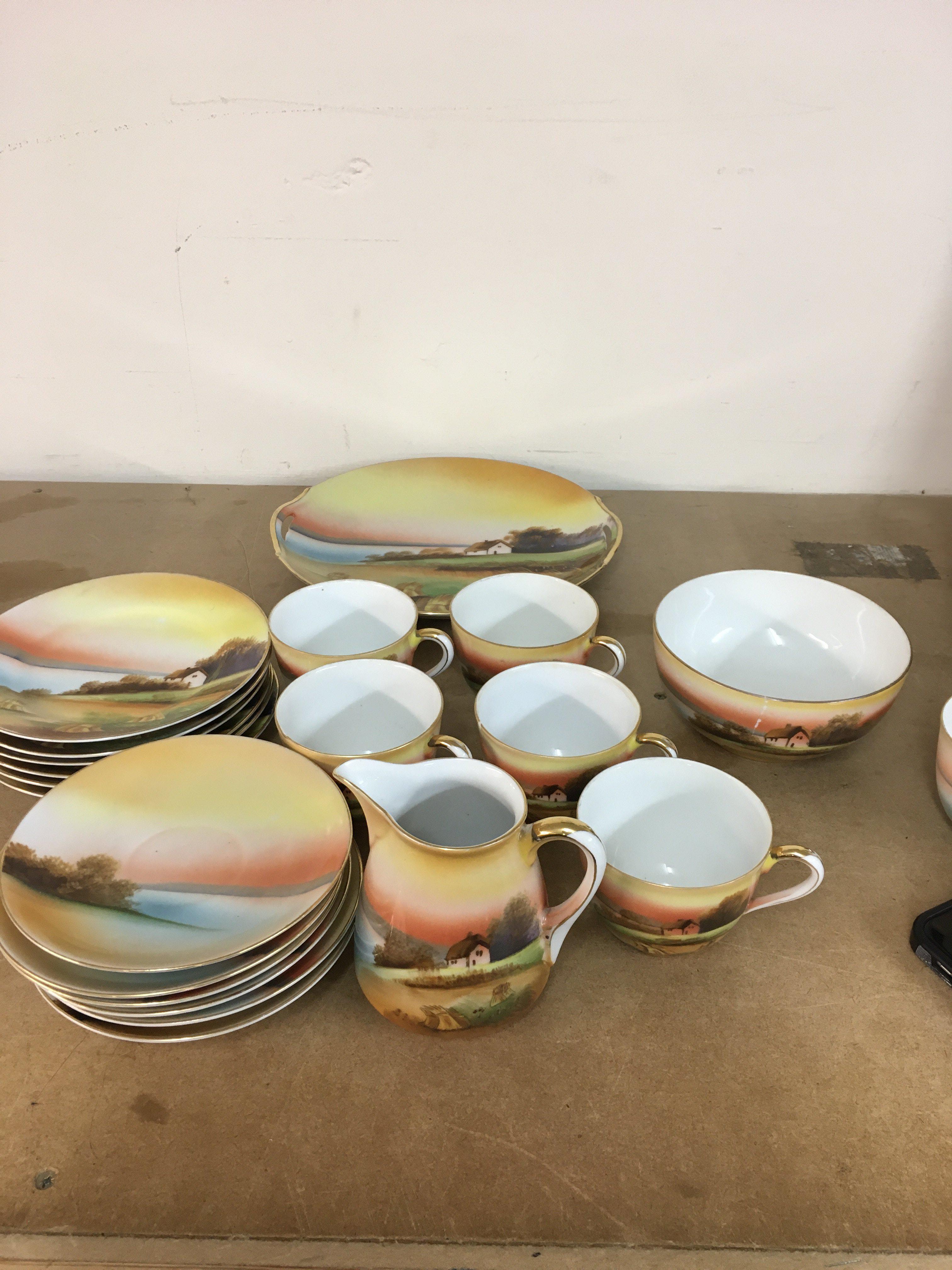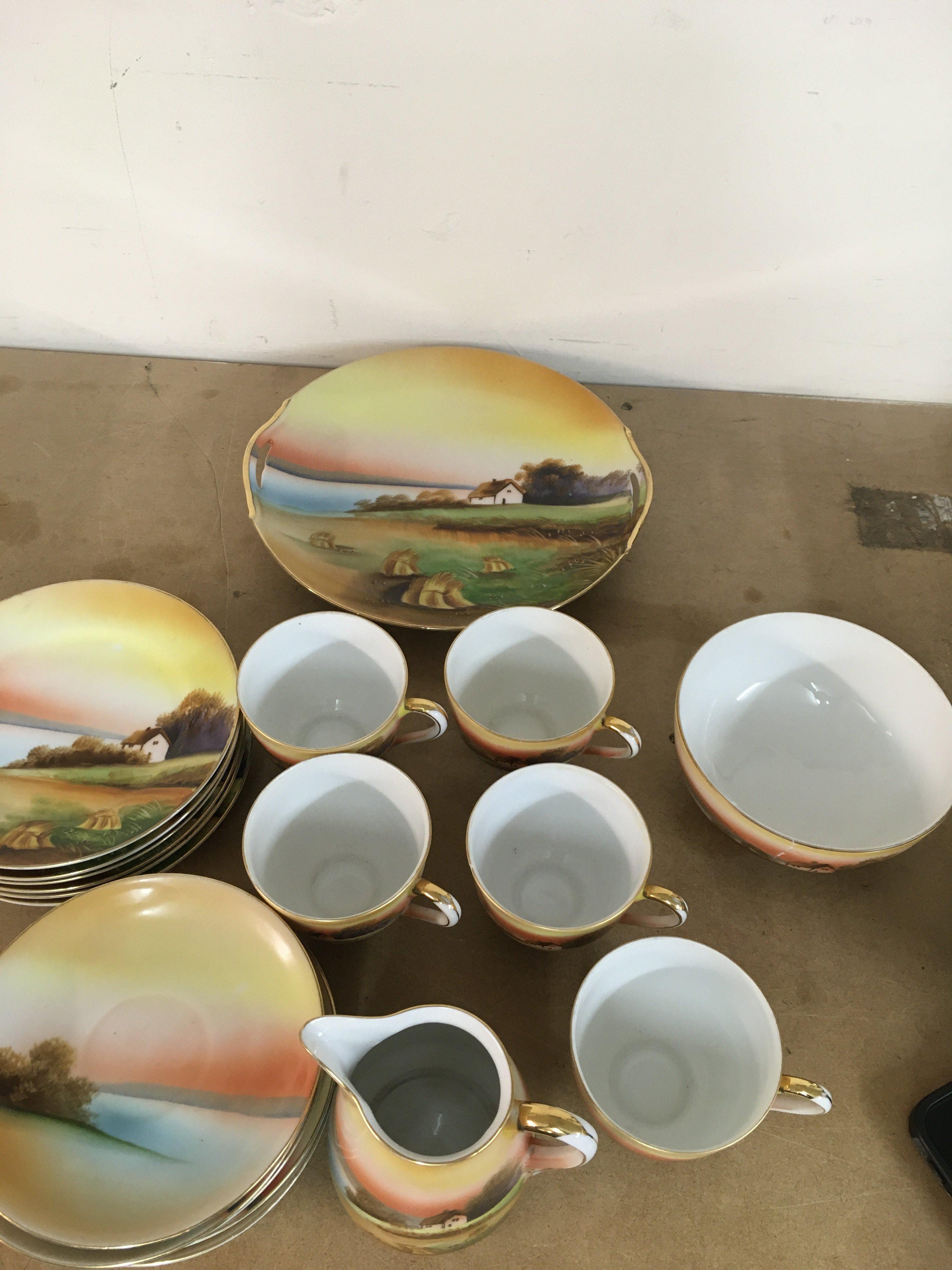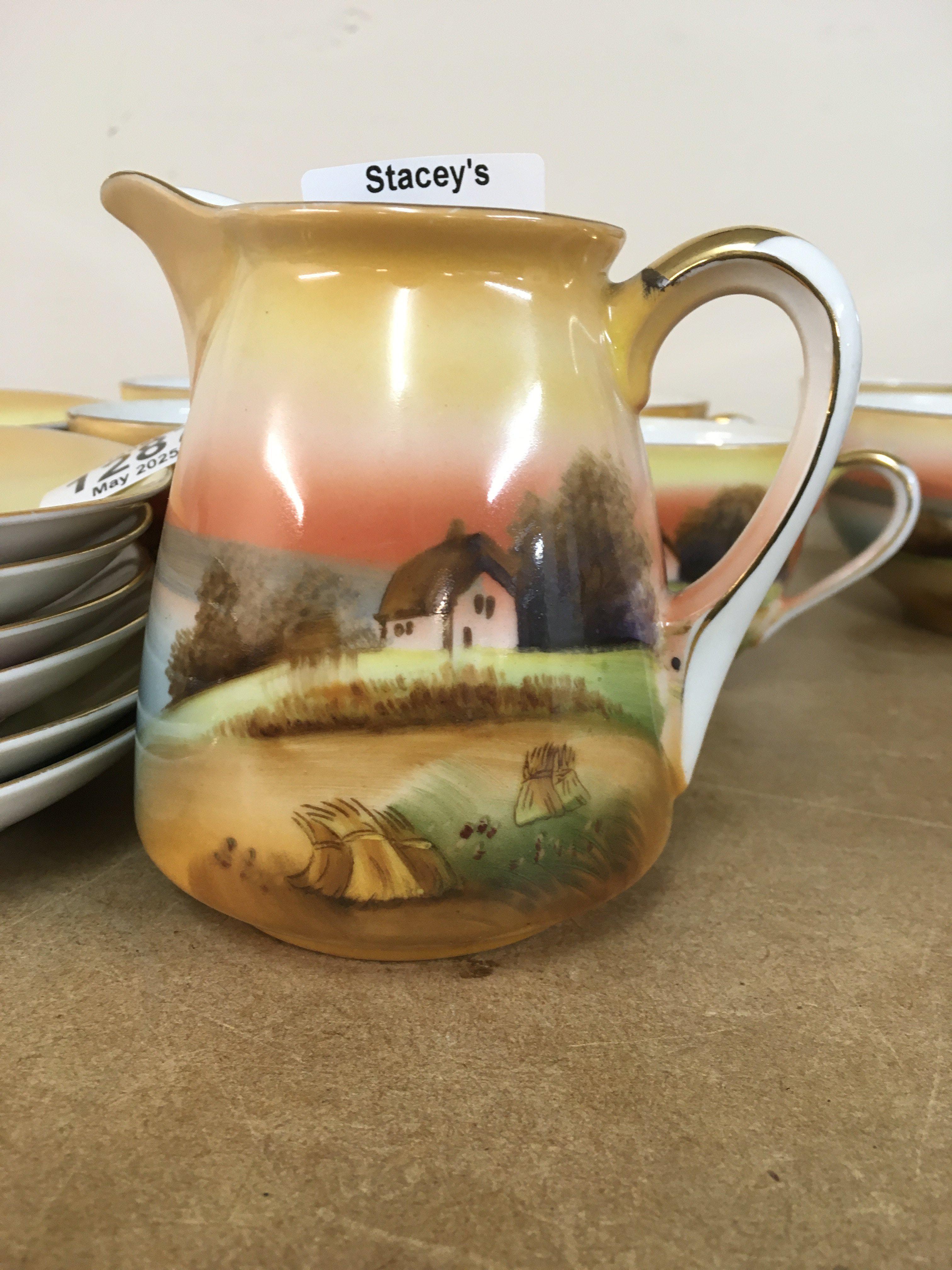 Japanese noritake decorated with country side landscapes and consists of 5 tea pots 1creamer 12 plates and 1 tray