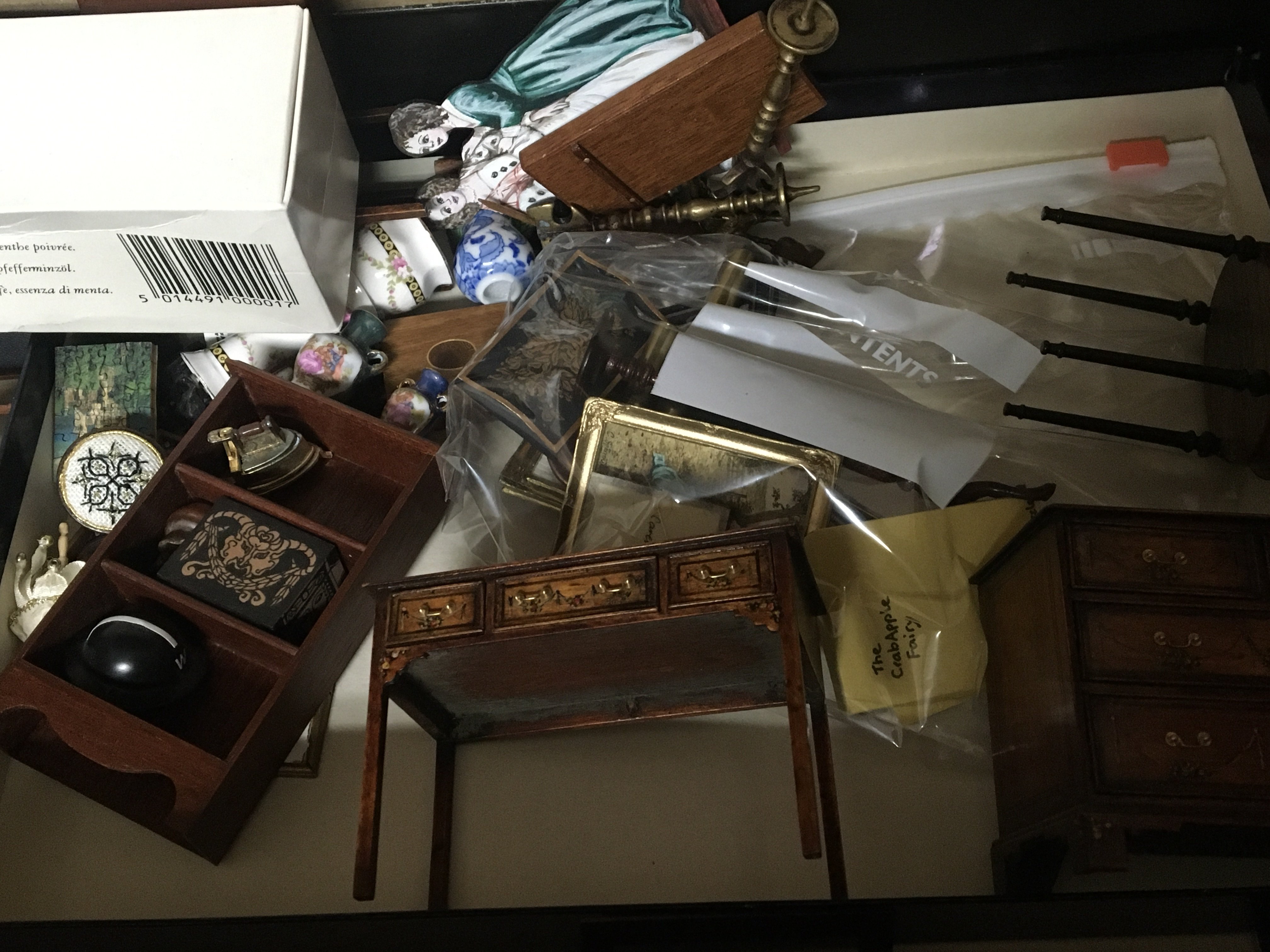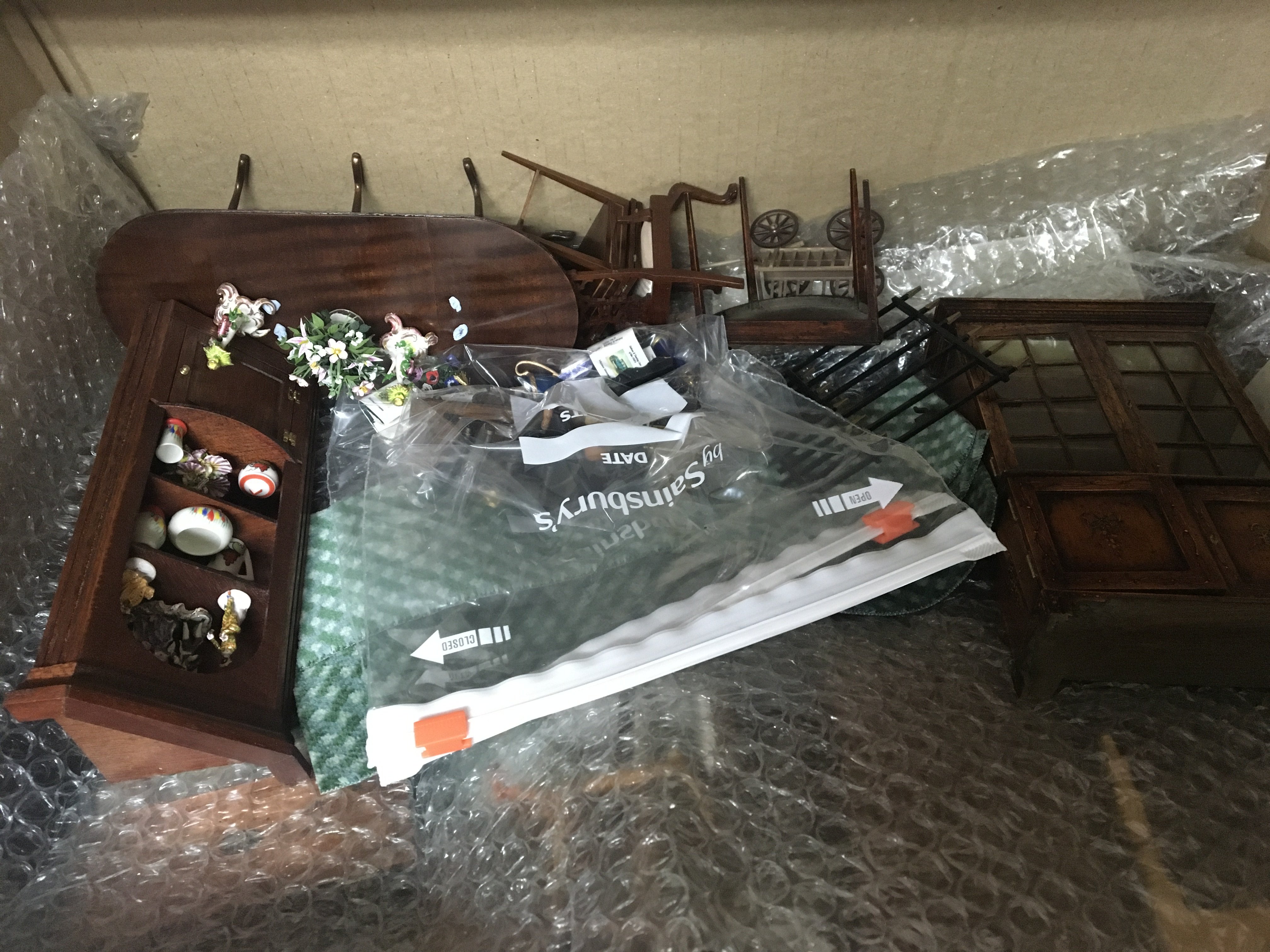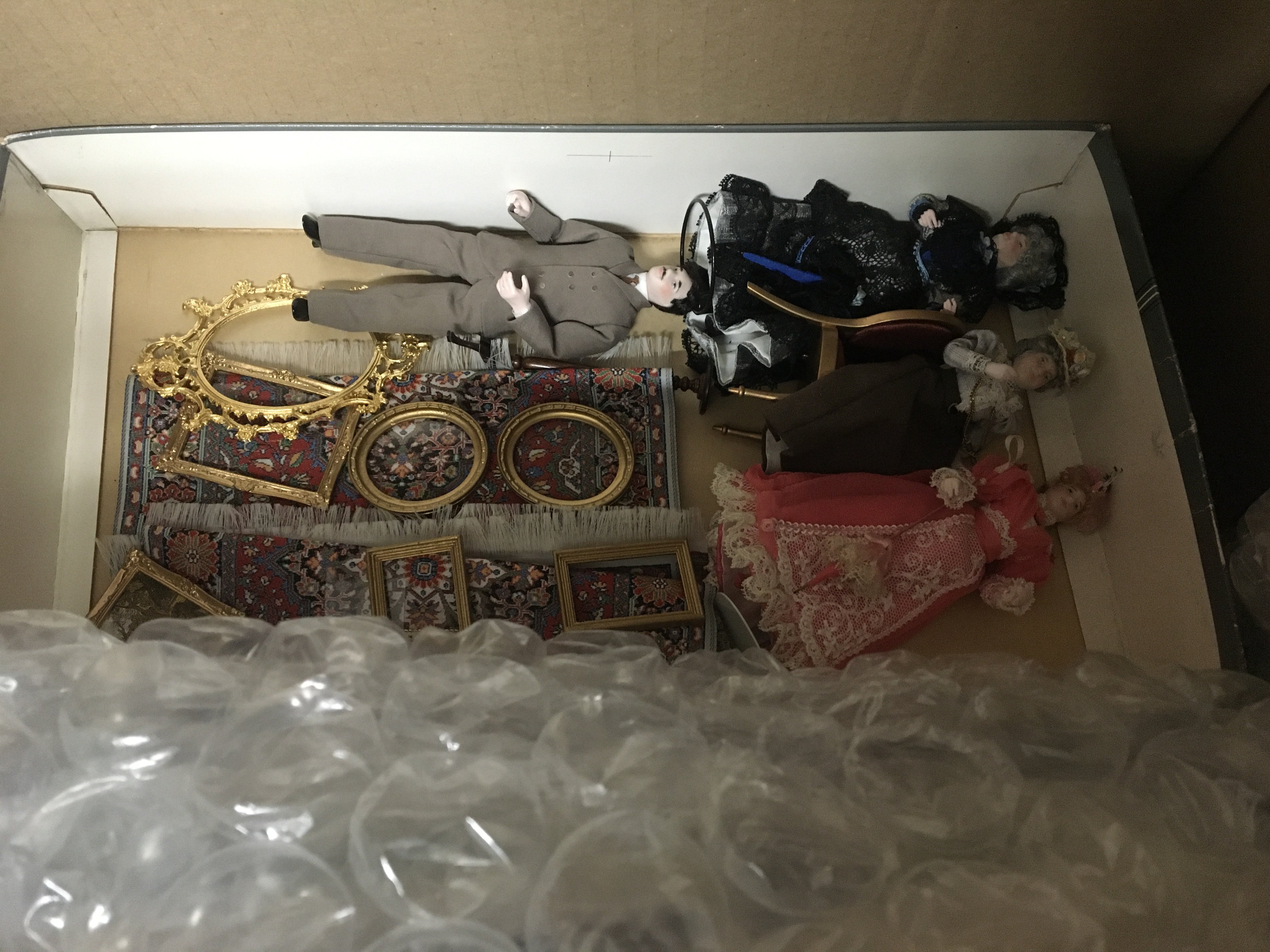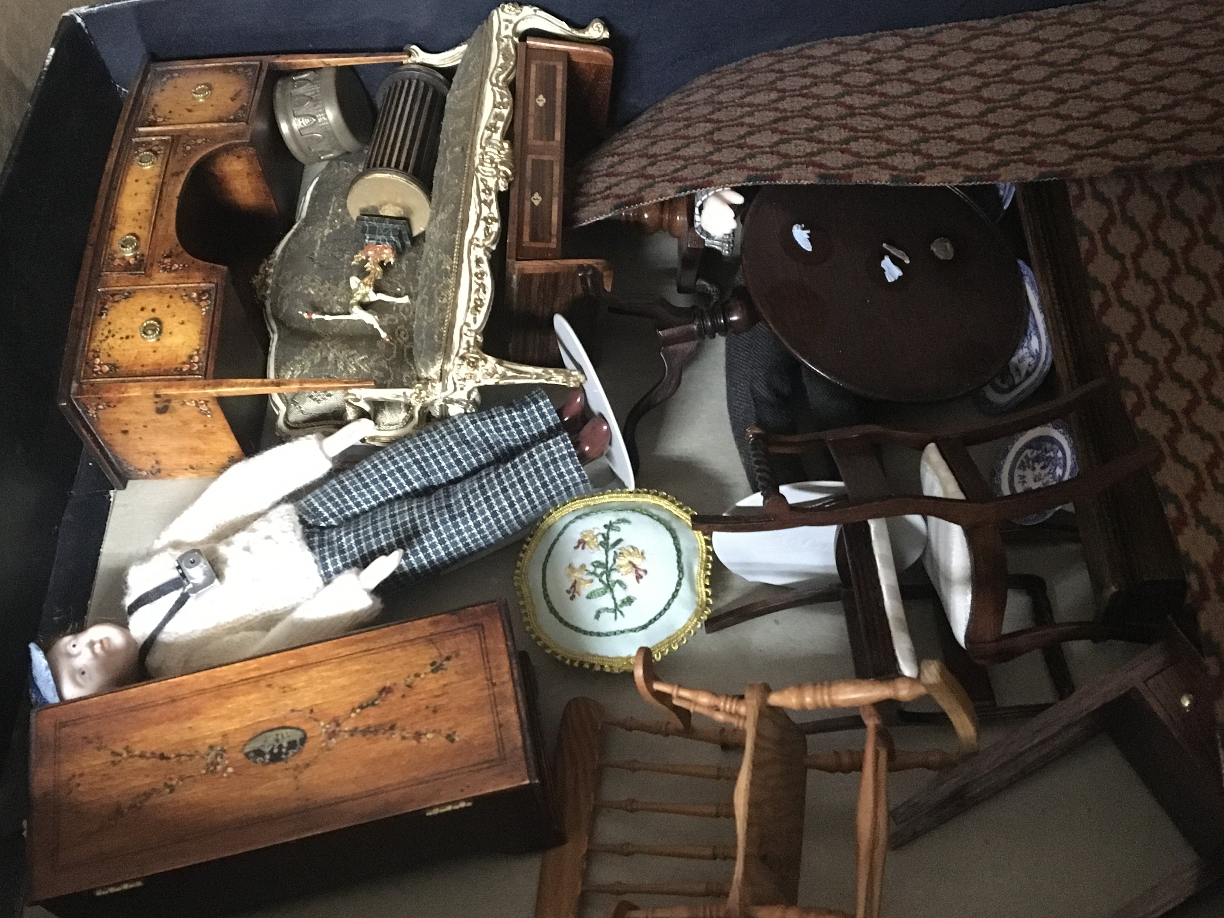 A box containing a collection of good quality dolls house furniture.