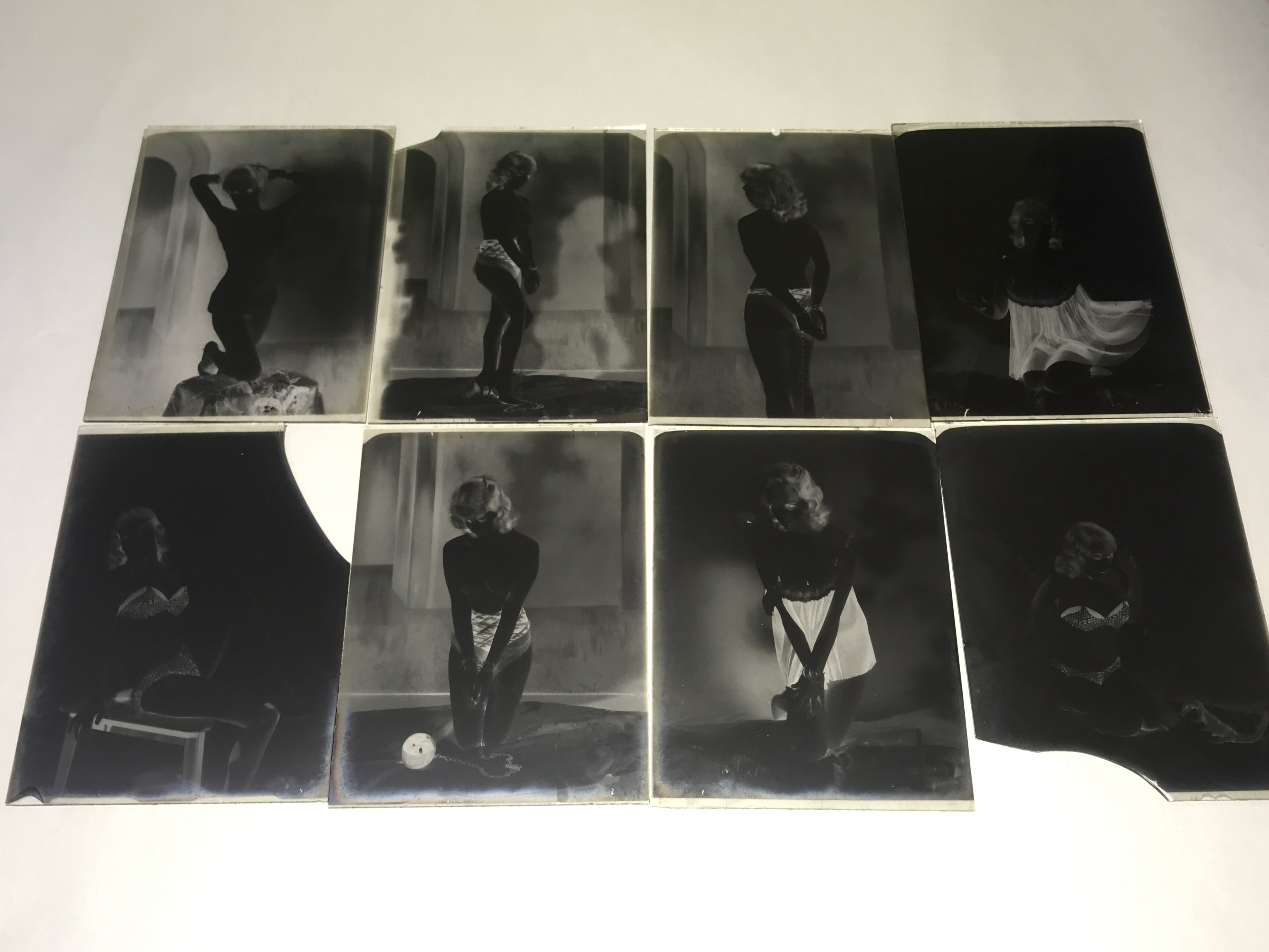 Eight photographic glass plates of a female model, some nude images. Shipping category D.