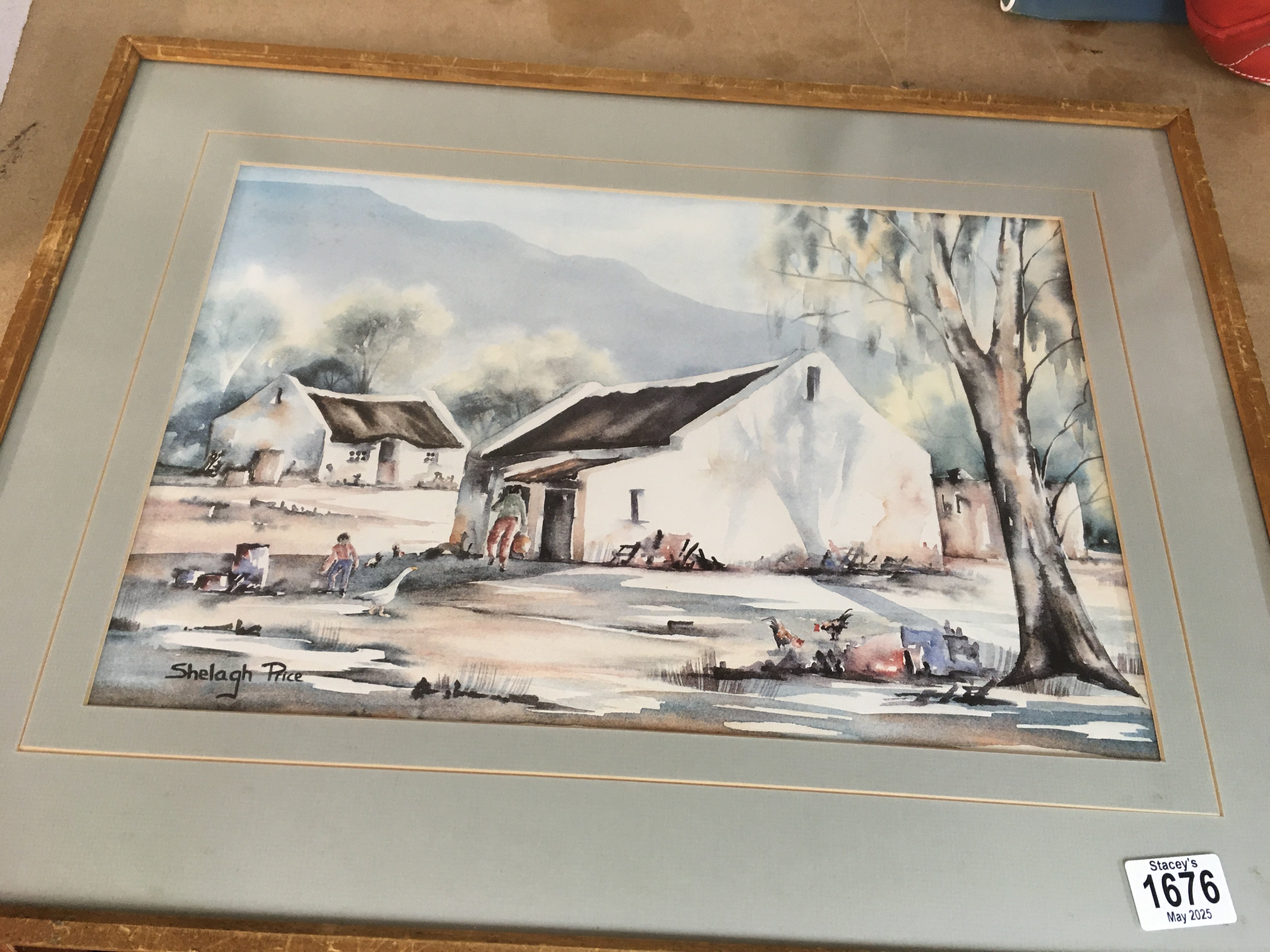 A pair of framed water coulors depicting contry side cottages signed by shelagh price 42cm by 30