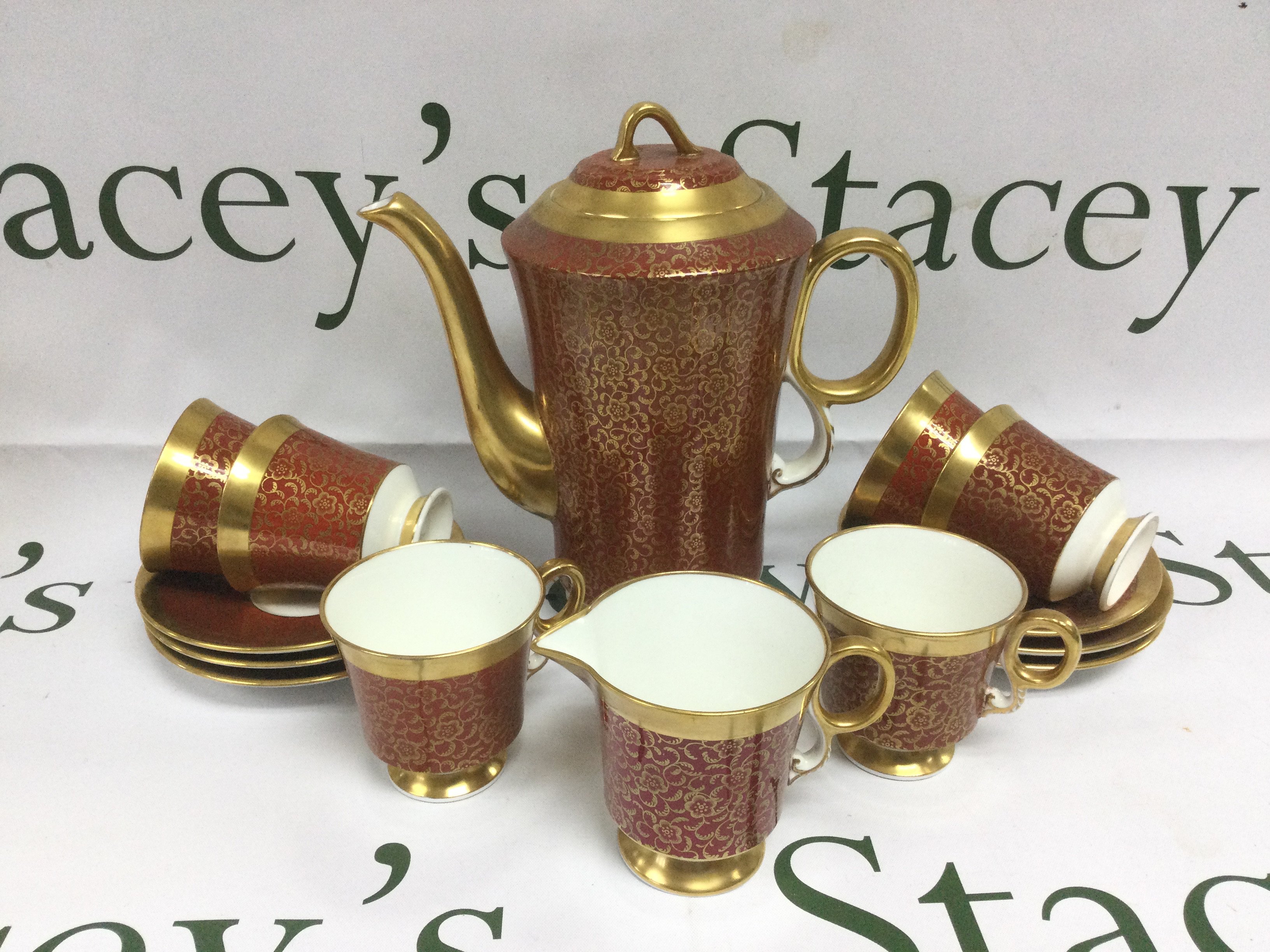 A Royal Adderley coffee set with giltwork decoration on a red and white ground. Shipping category D.