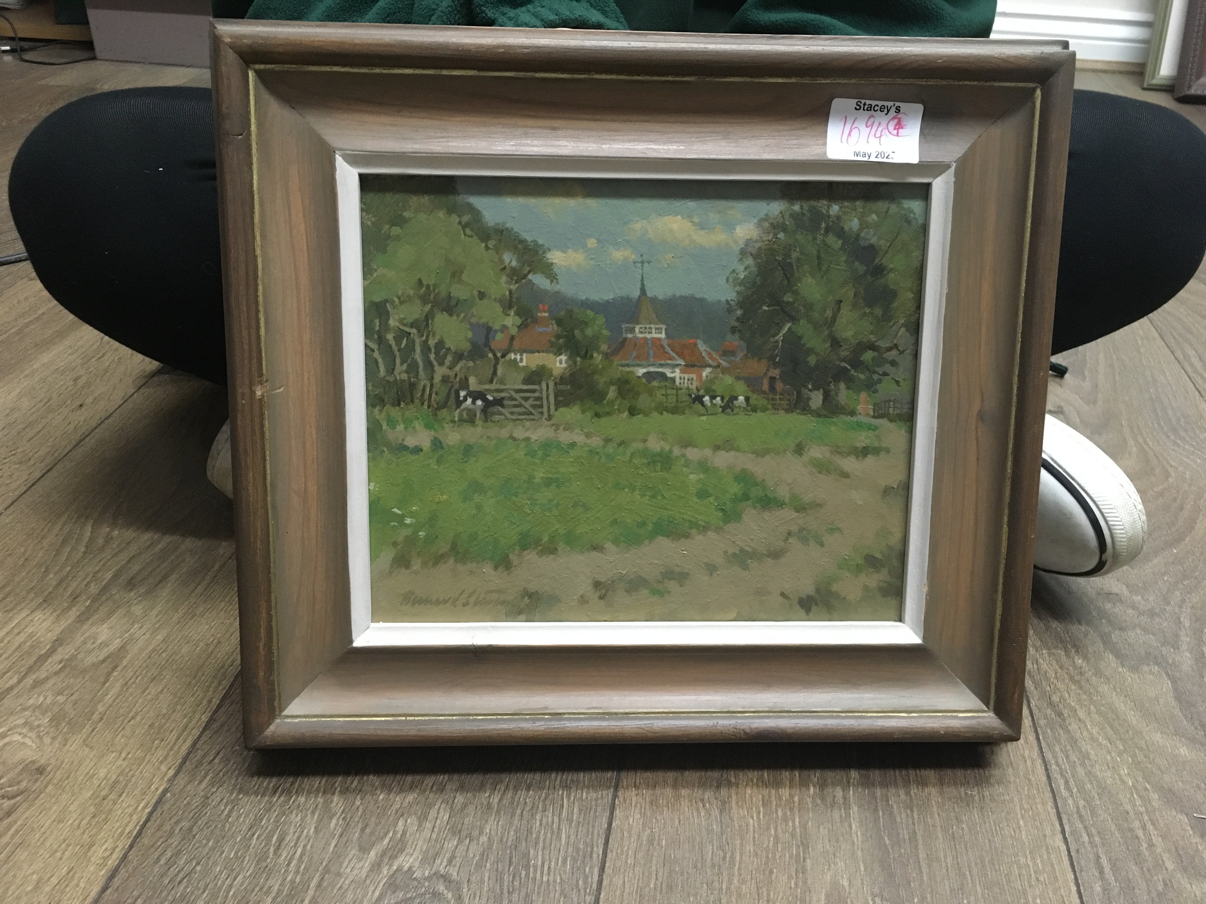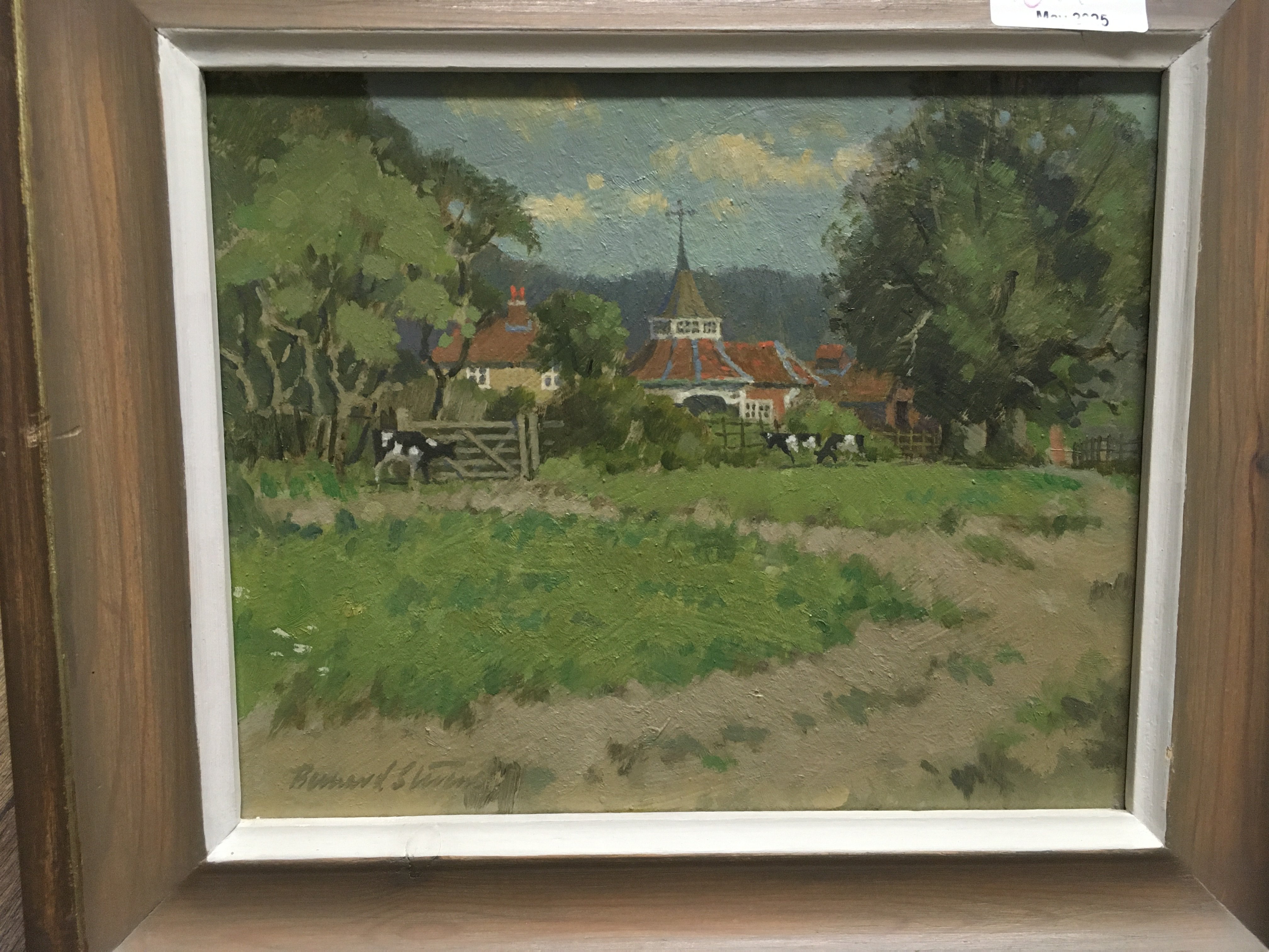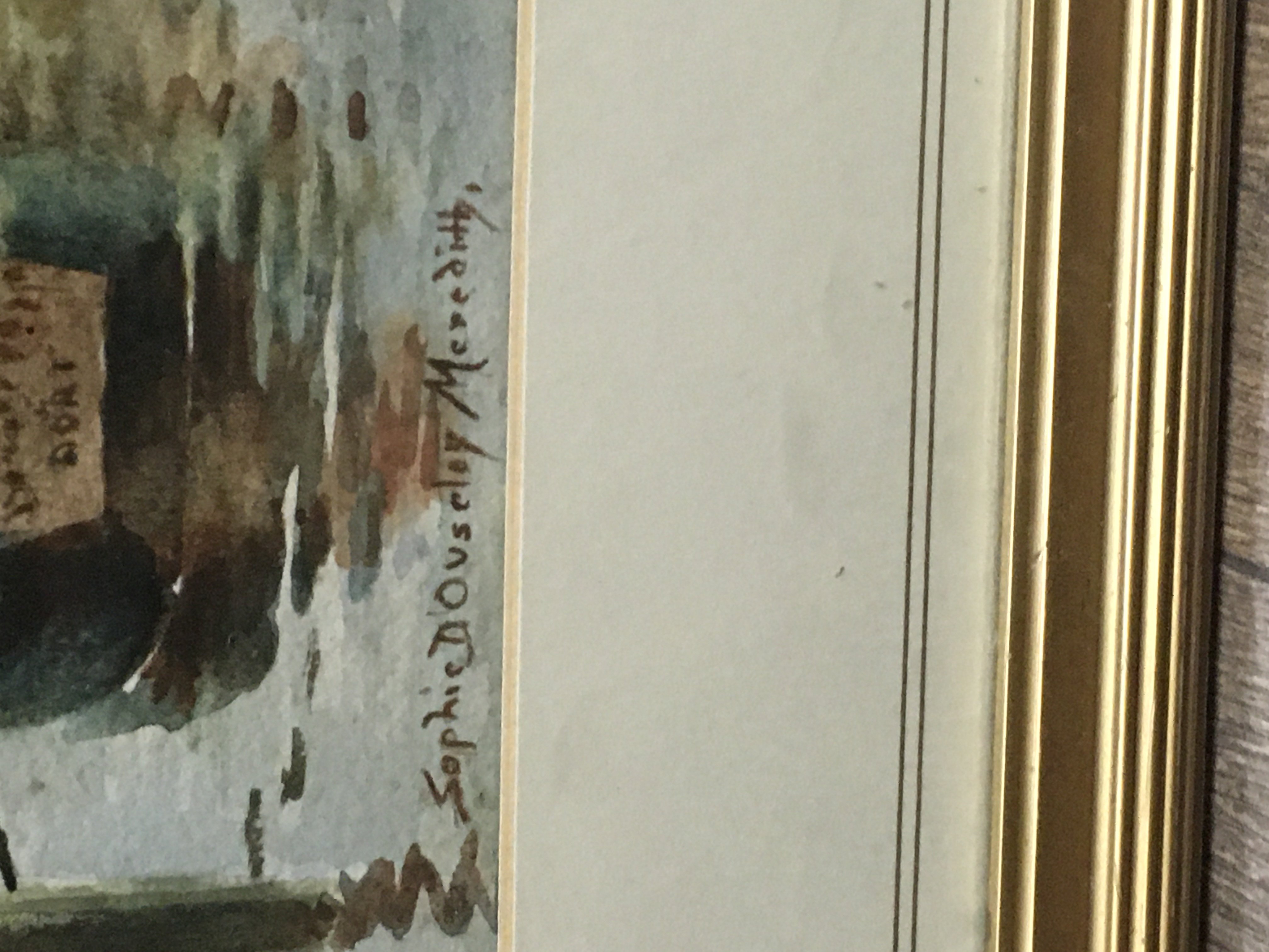 4 framed paintings to include a view of Watergate Dordrecht,Holland. Signed by Sophie D'ouseley Meredith, a view of Glastonbury Abbey And the framed oil on board-The Dairy House signed by Bernard Stevens exhibited at the royal academy some at exhibition. Various size frames