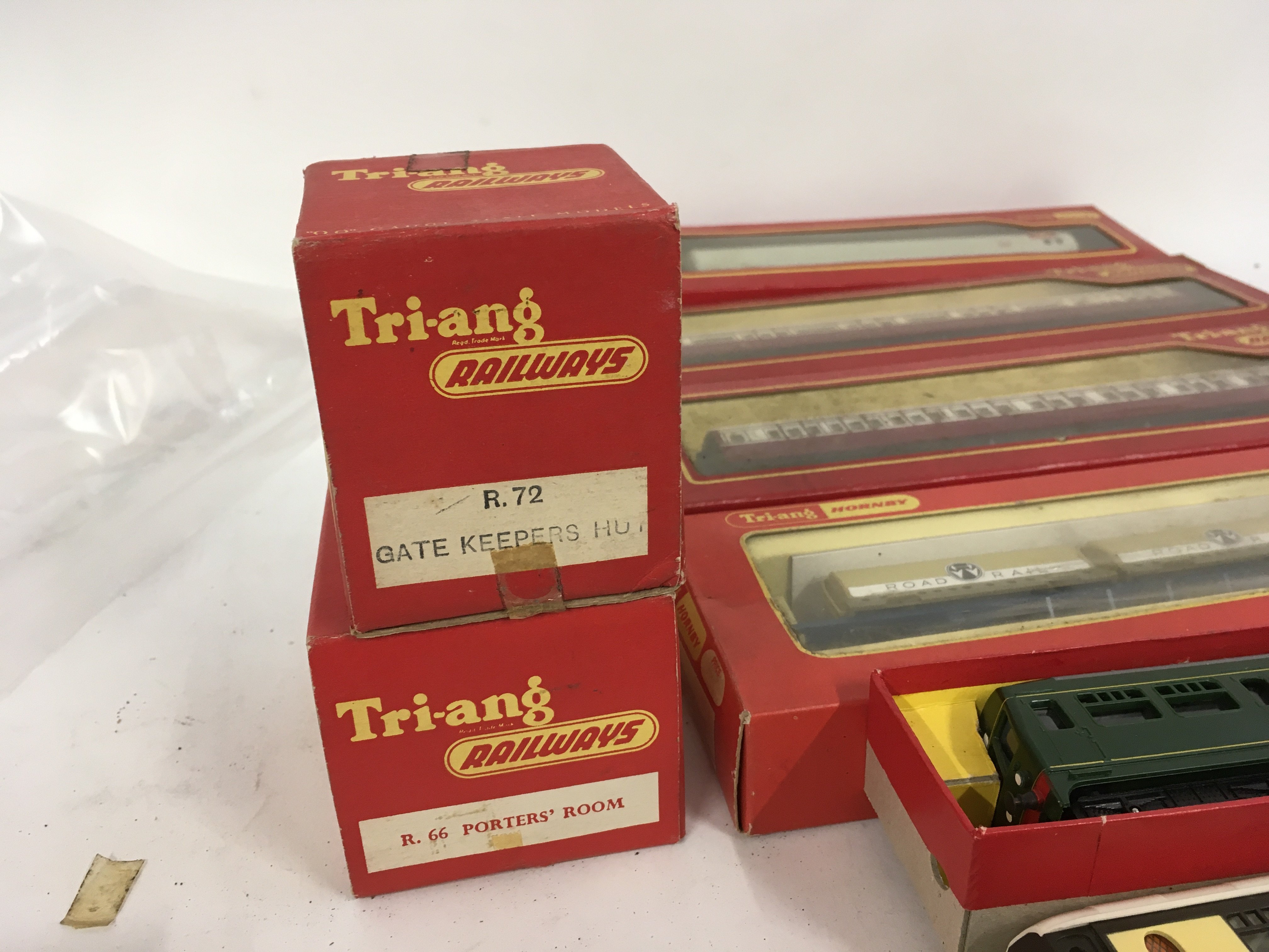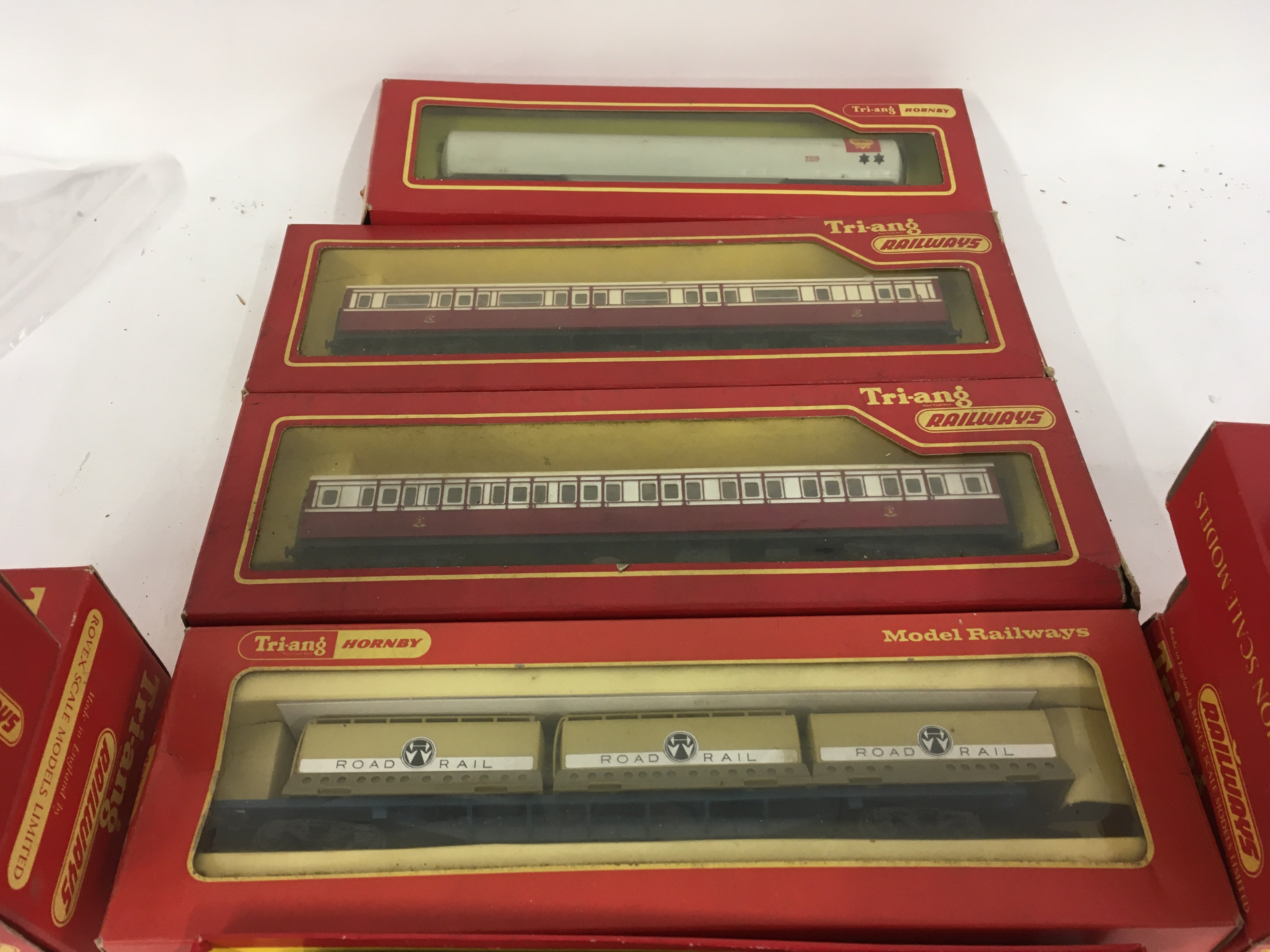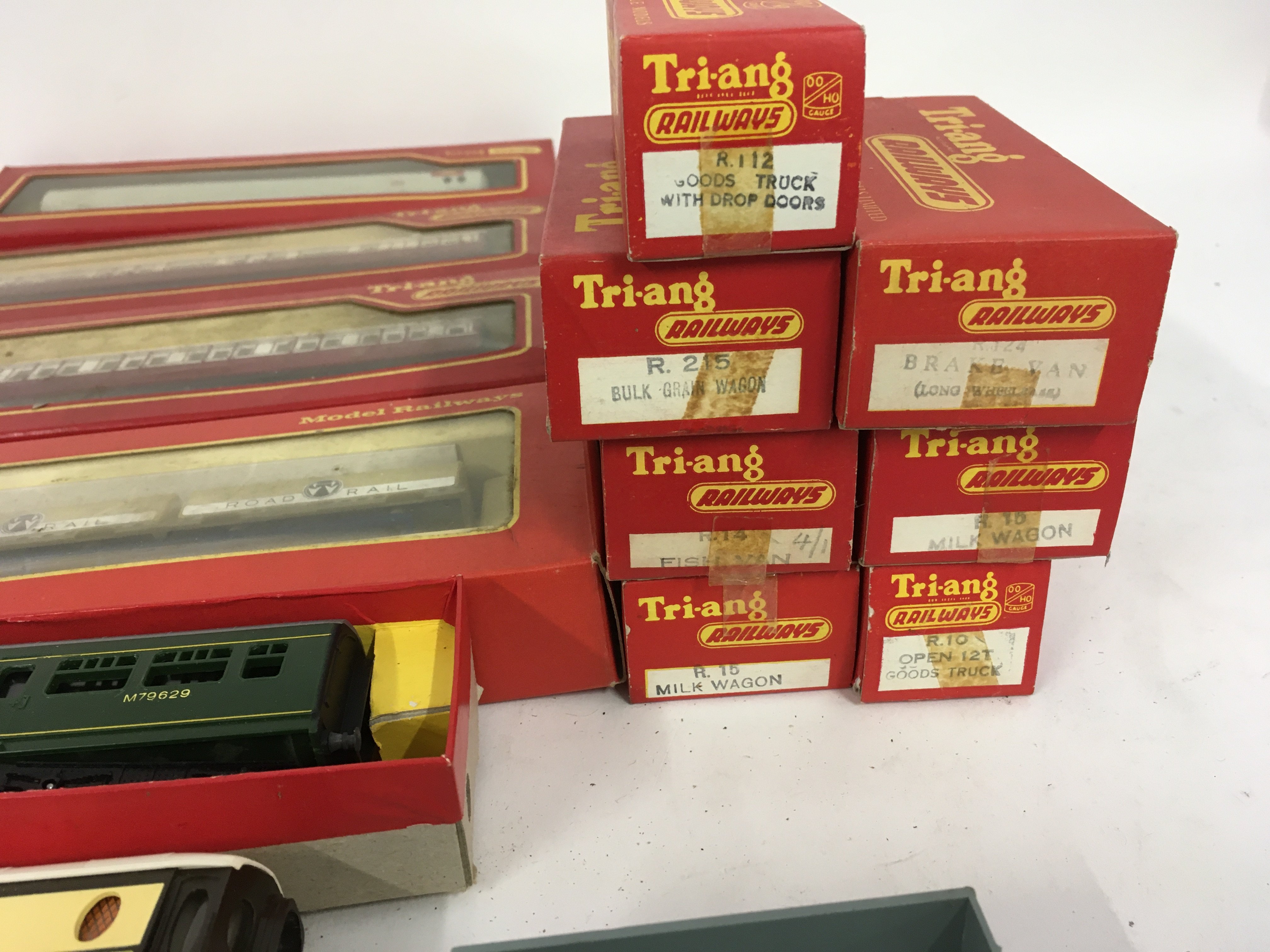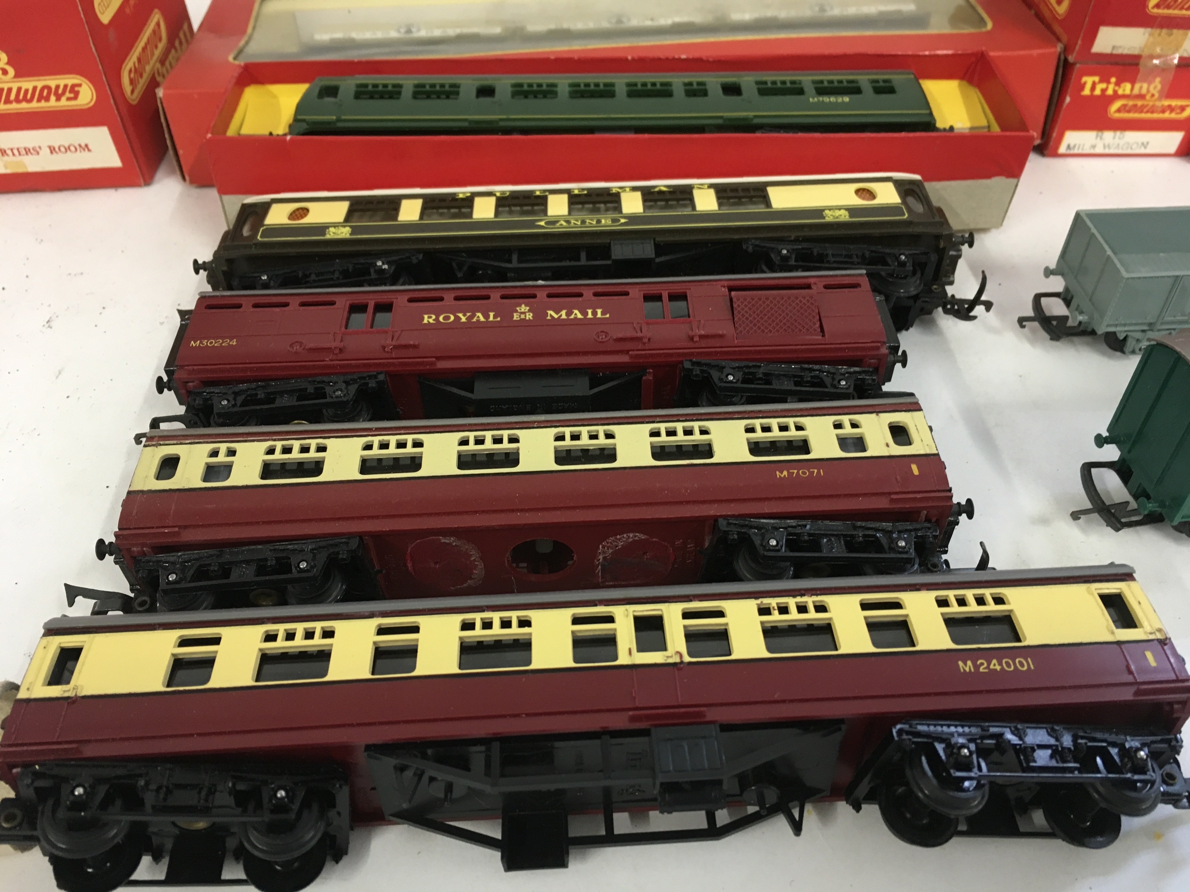 A collection of boxed and loose 00 gauge model railway coaches and wagons by Triang. No reserve