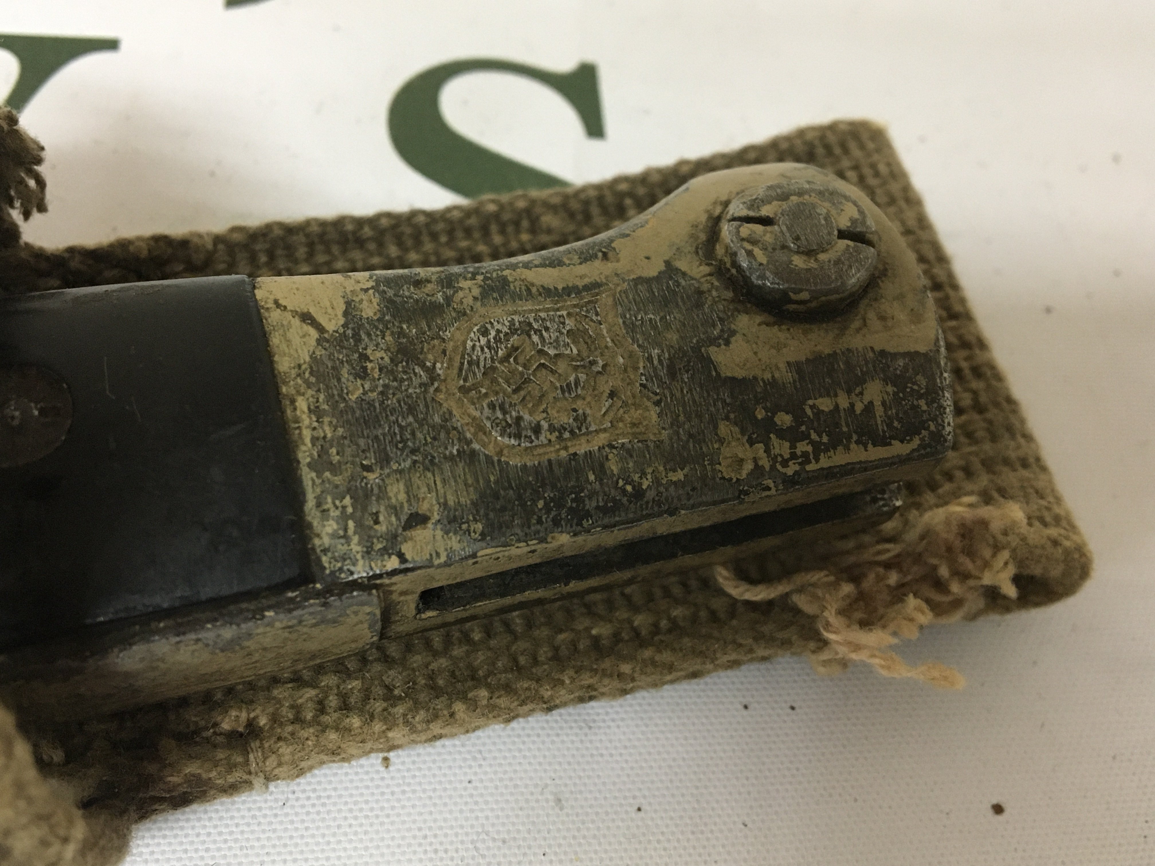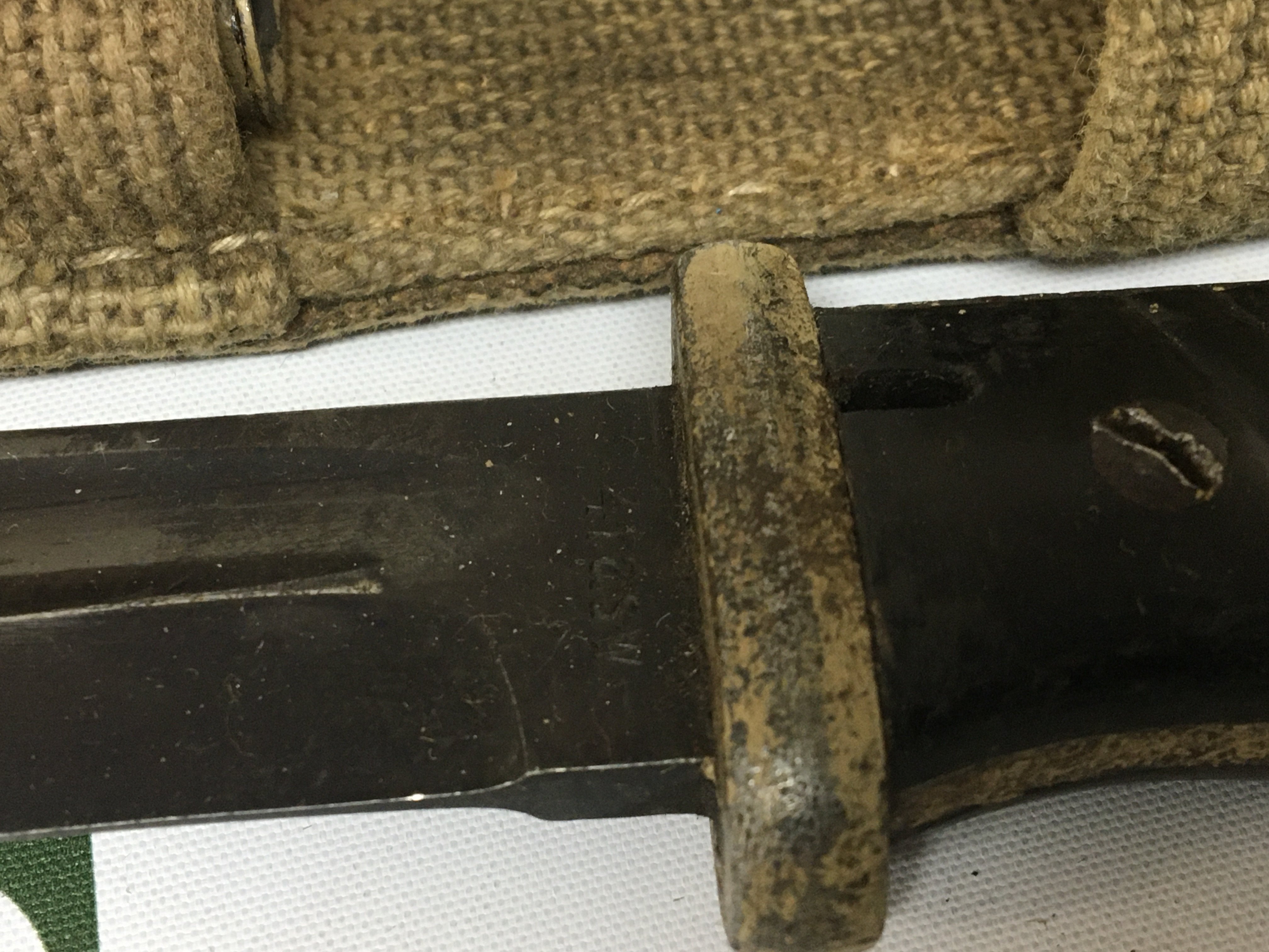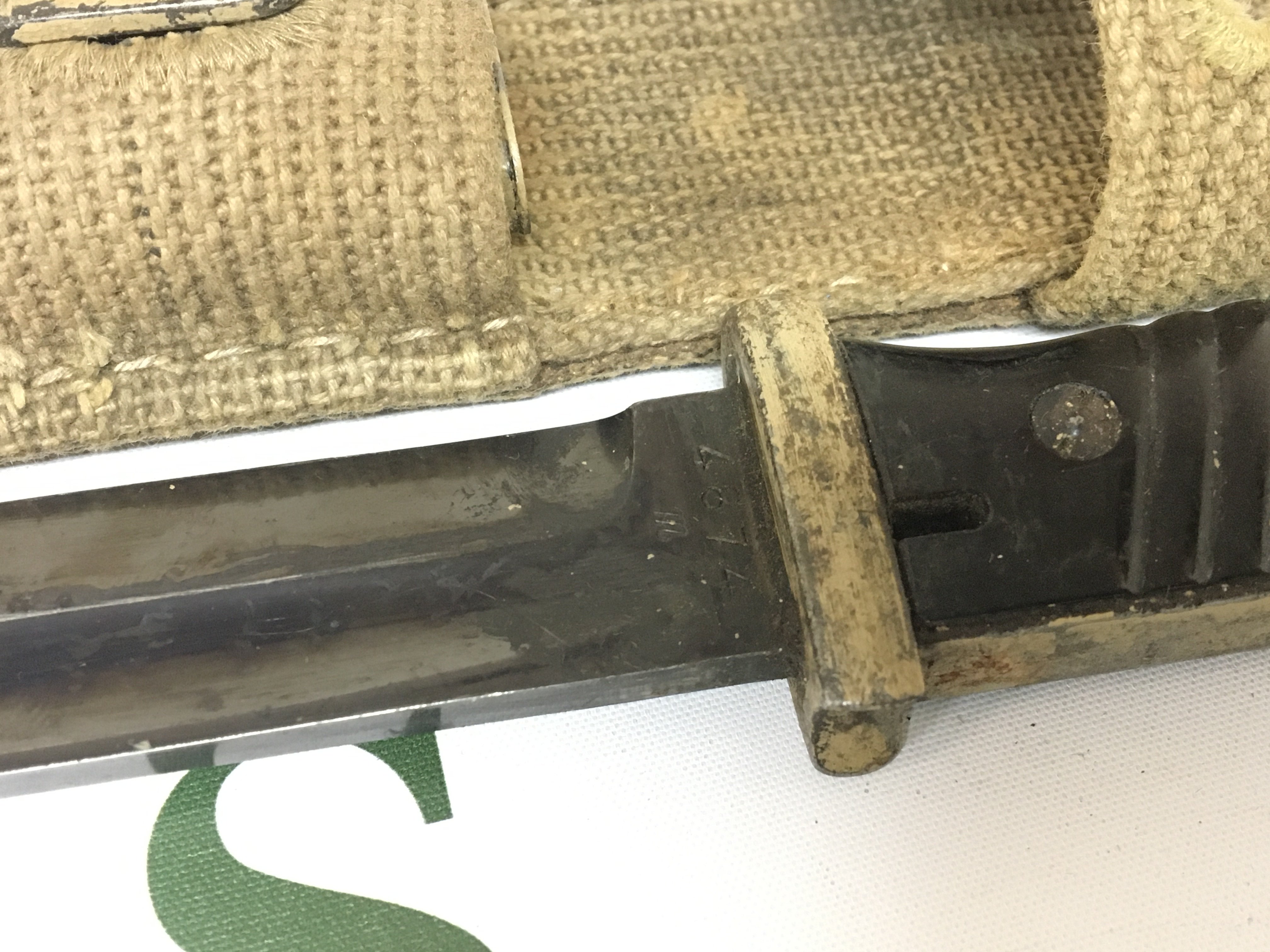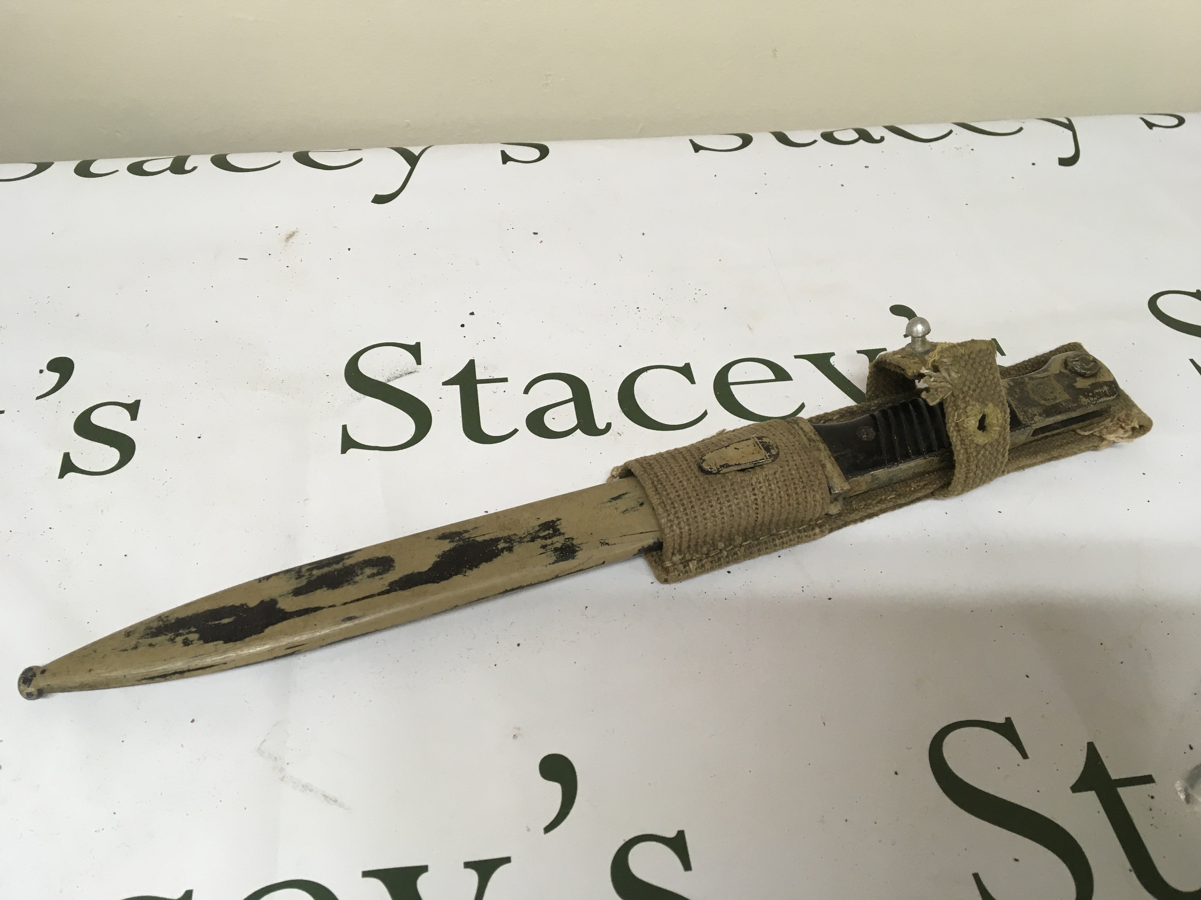 A Very good Example of a German Third Reich Afrika Korps bayonet with attached woven frog. the top side of the bayonet with Afrika Corps stamp the bayonet blade double sided number4874 m and Wasw stamped the metal scabbard and top grip painted in desert colour
