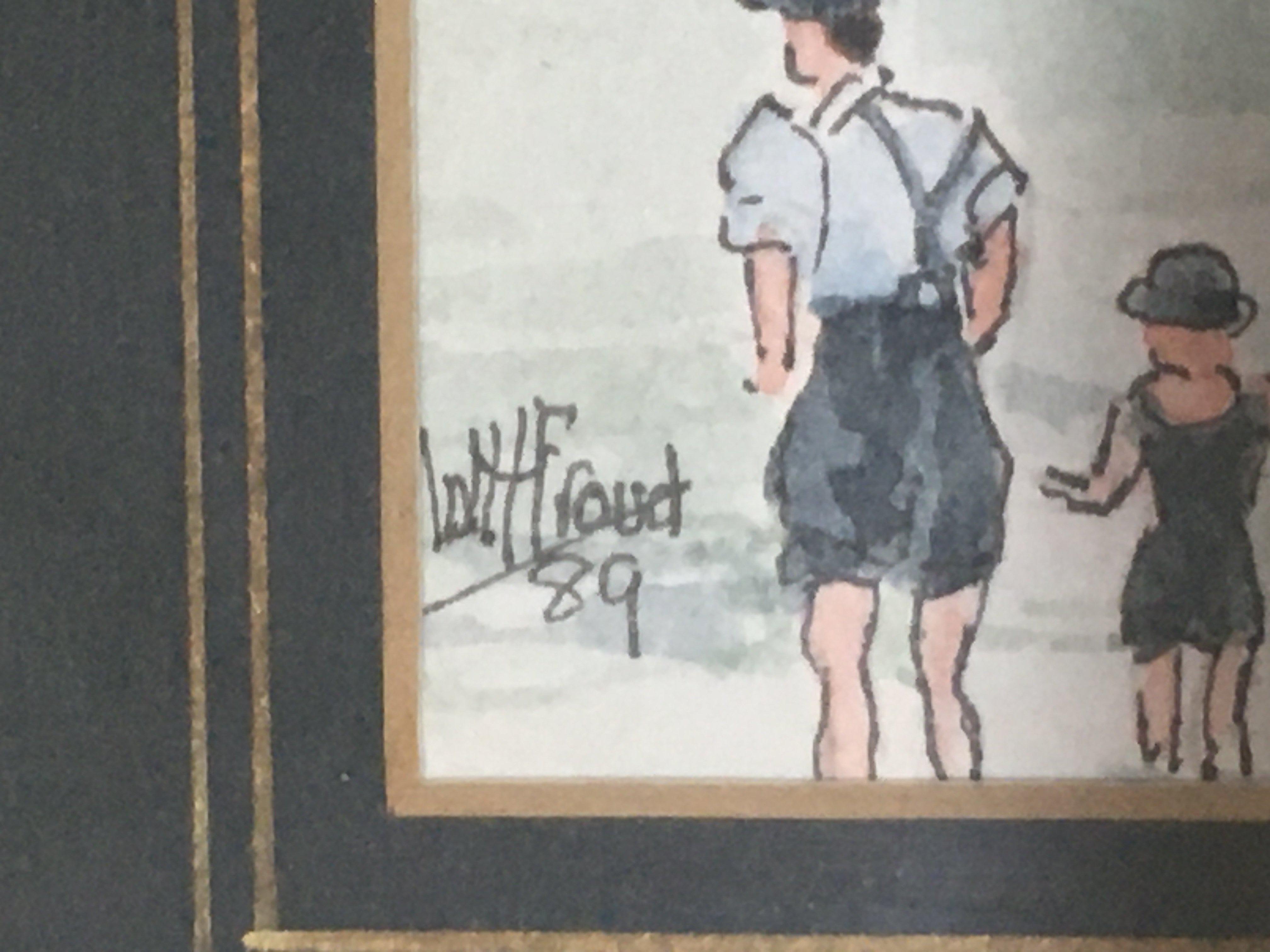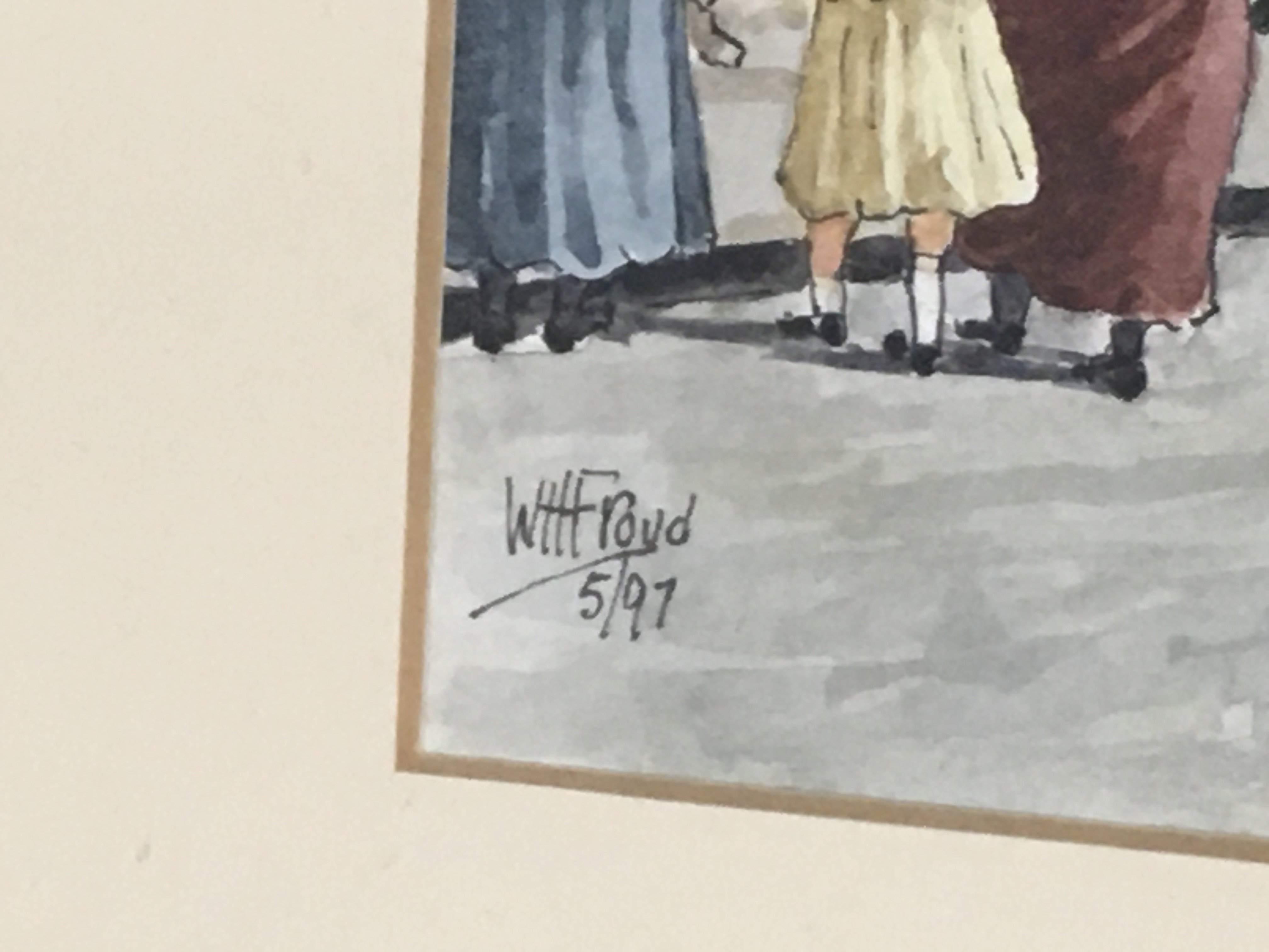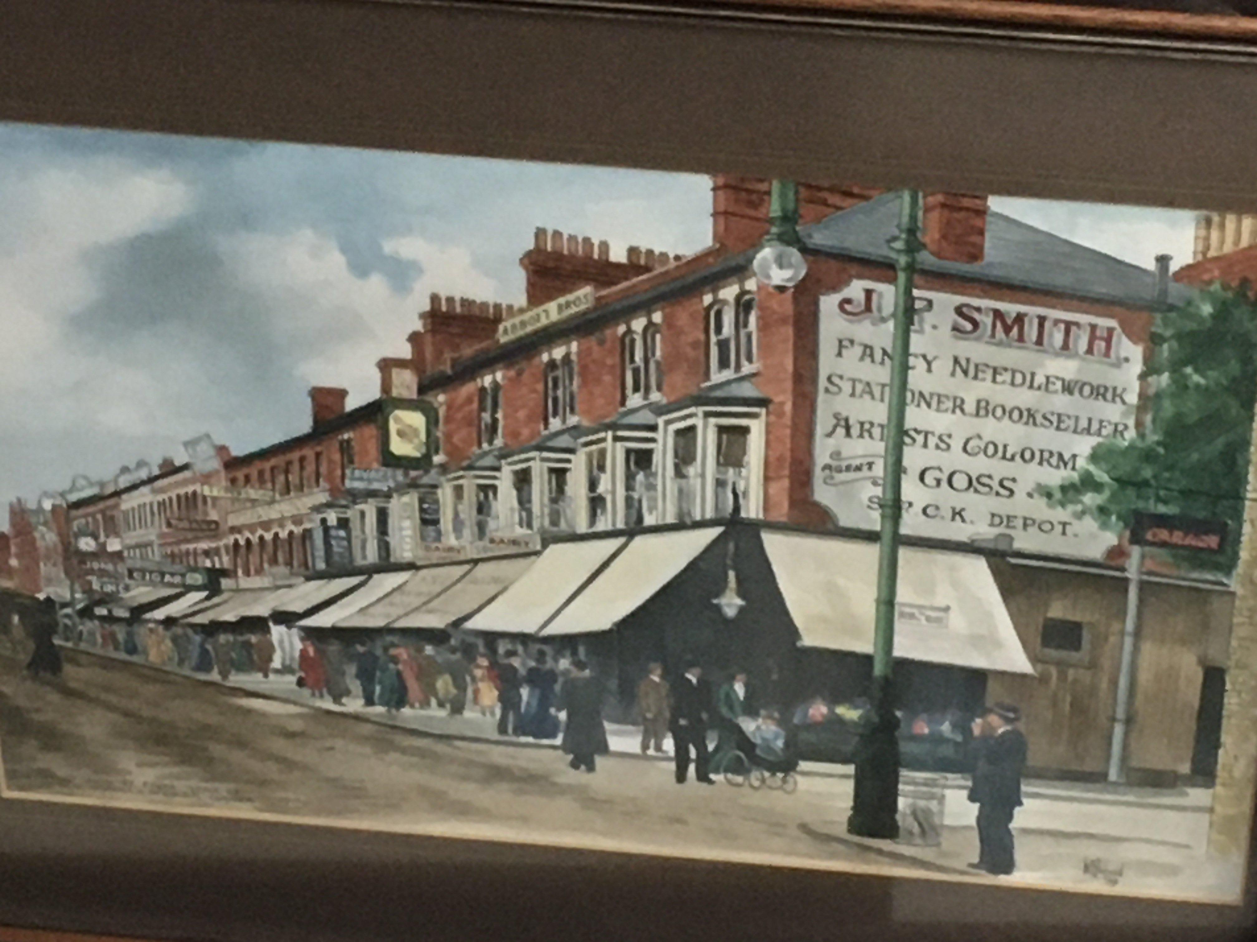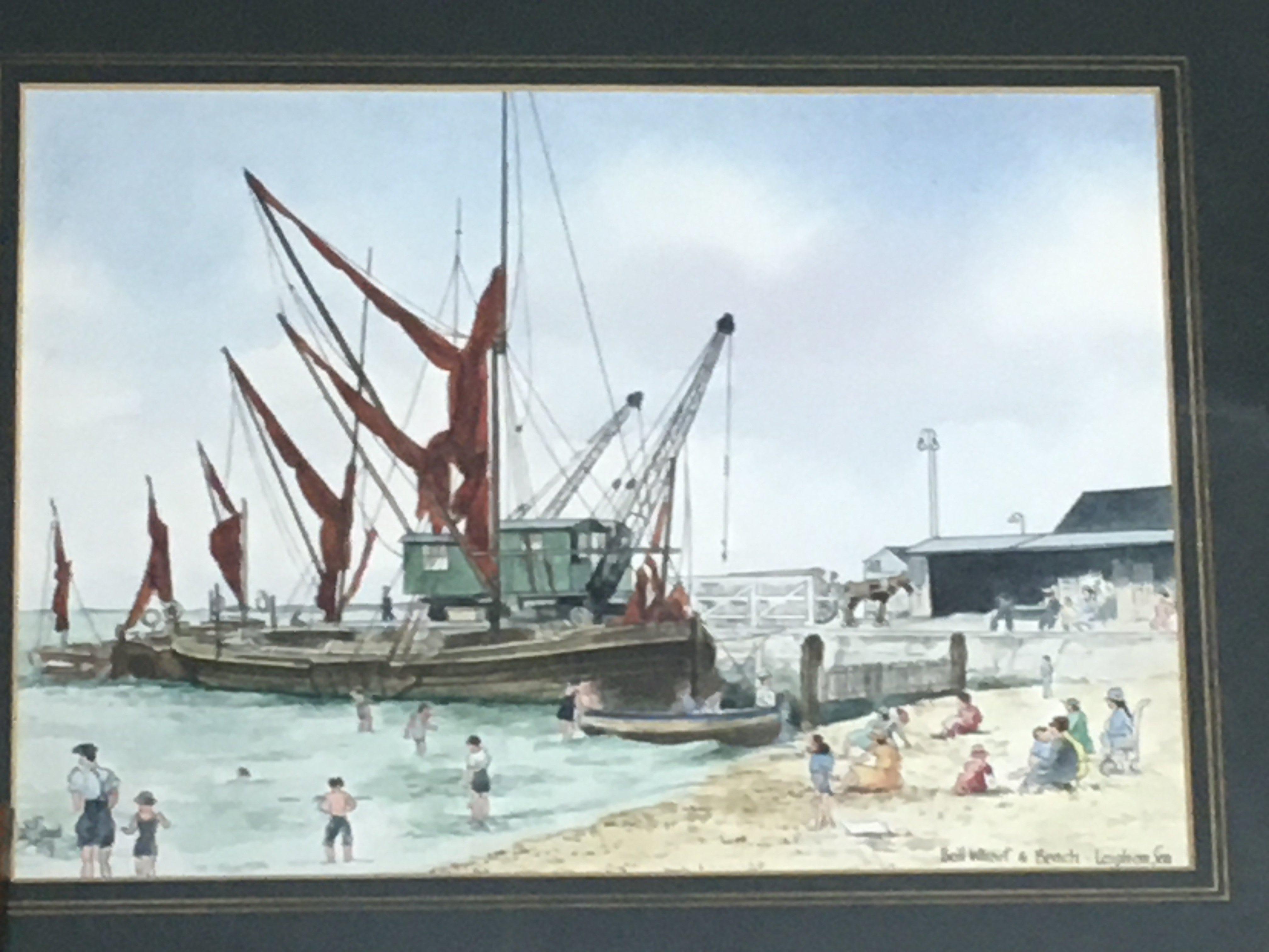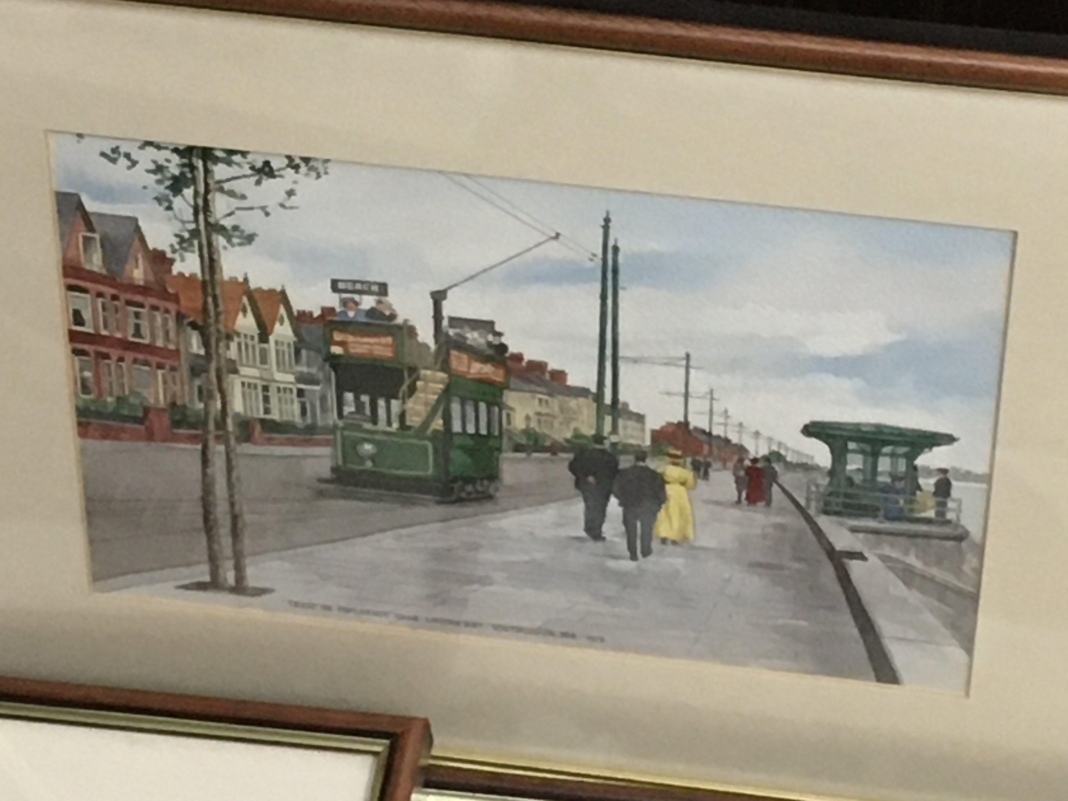 A collection of framed water coulors depicting Victorian veiws of Southend on sea to include high street from York road, tram on esplanade, sea pier and lifeboat station and marine parade