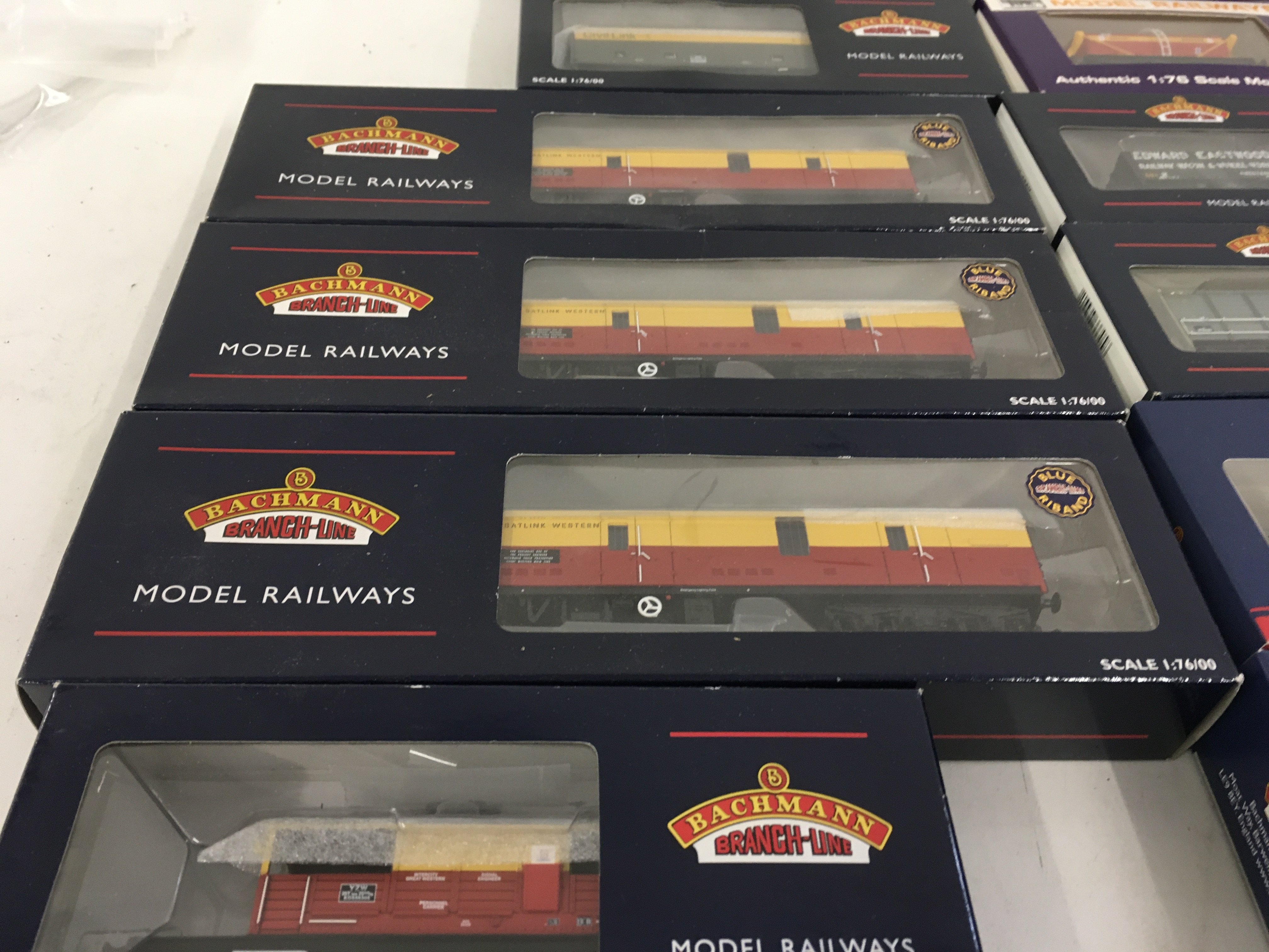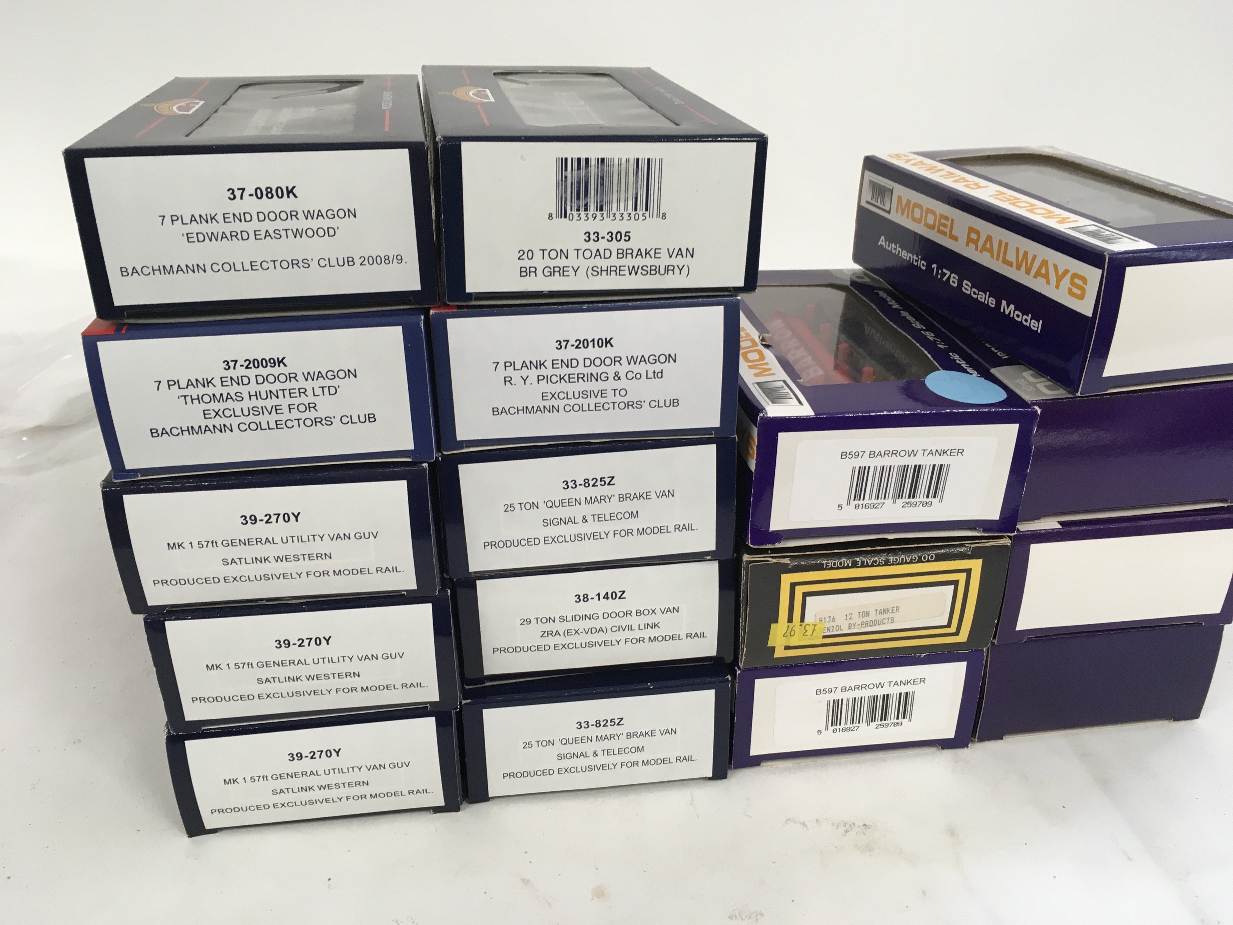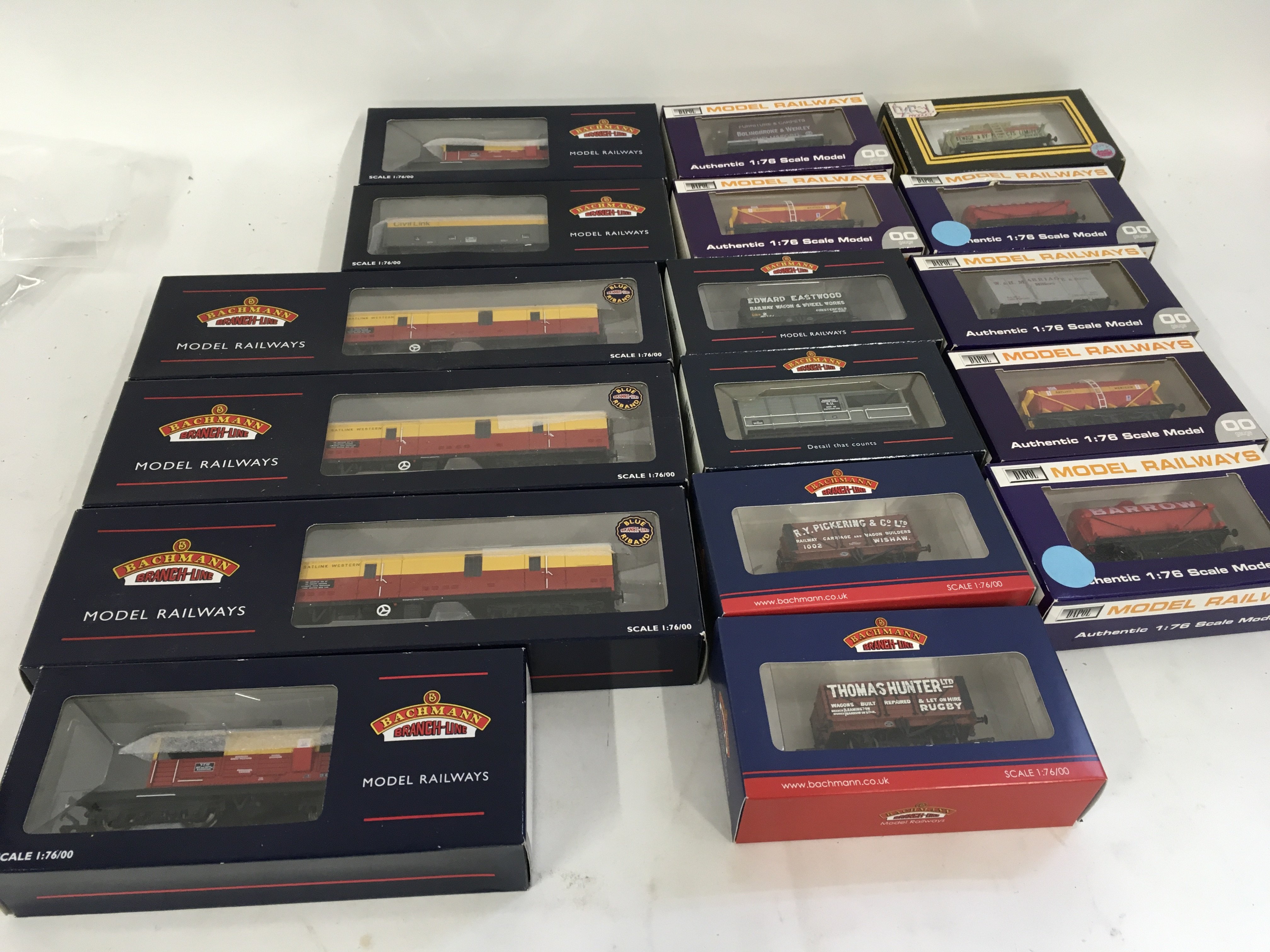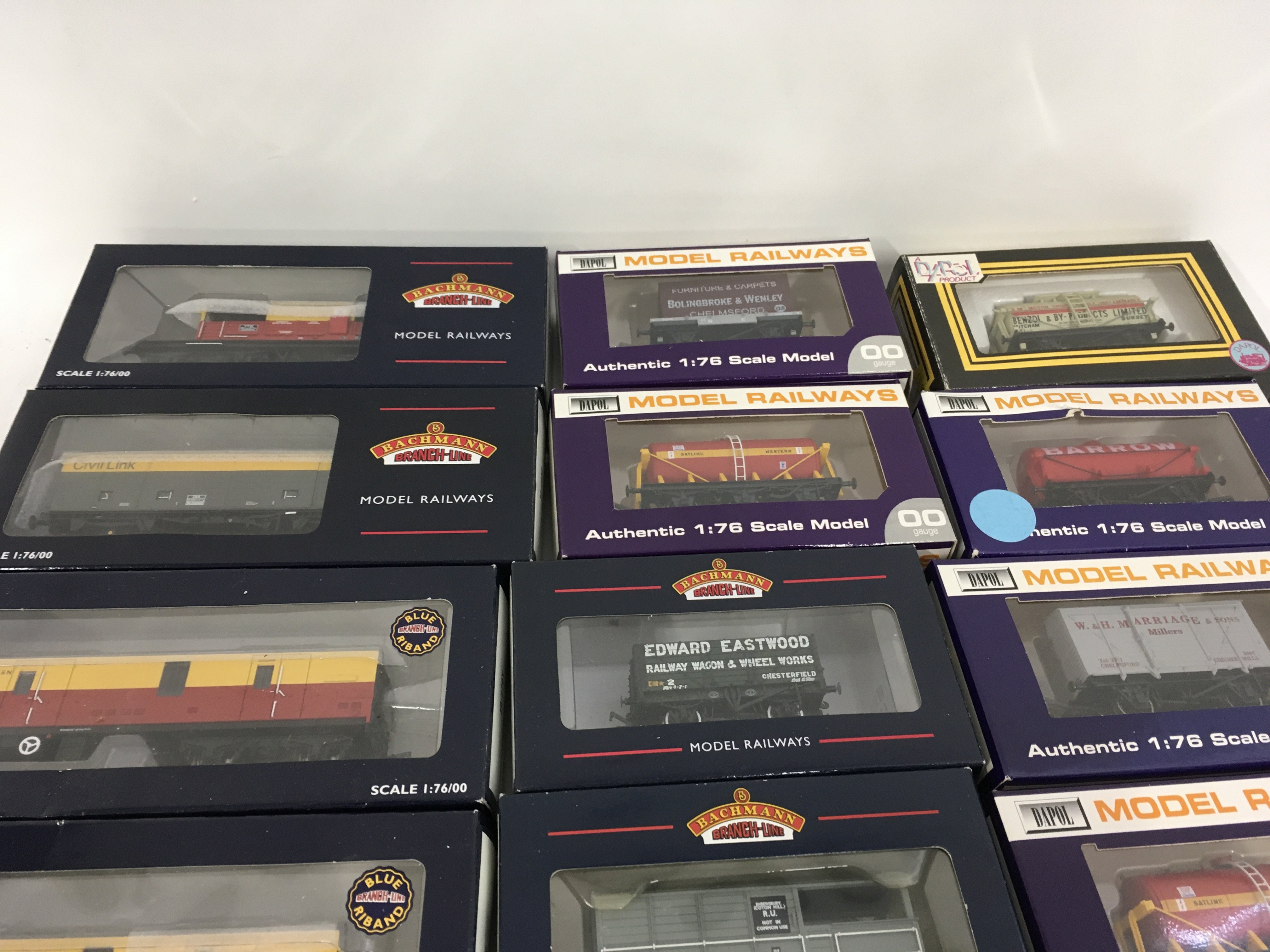 A collection of boxed 00 gauge model railway coaches and wagons by Bachmann and Dapol . No reserve