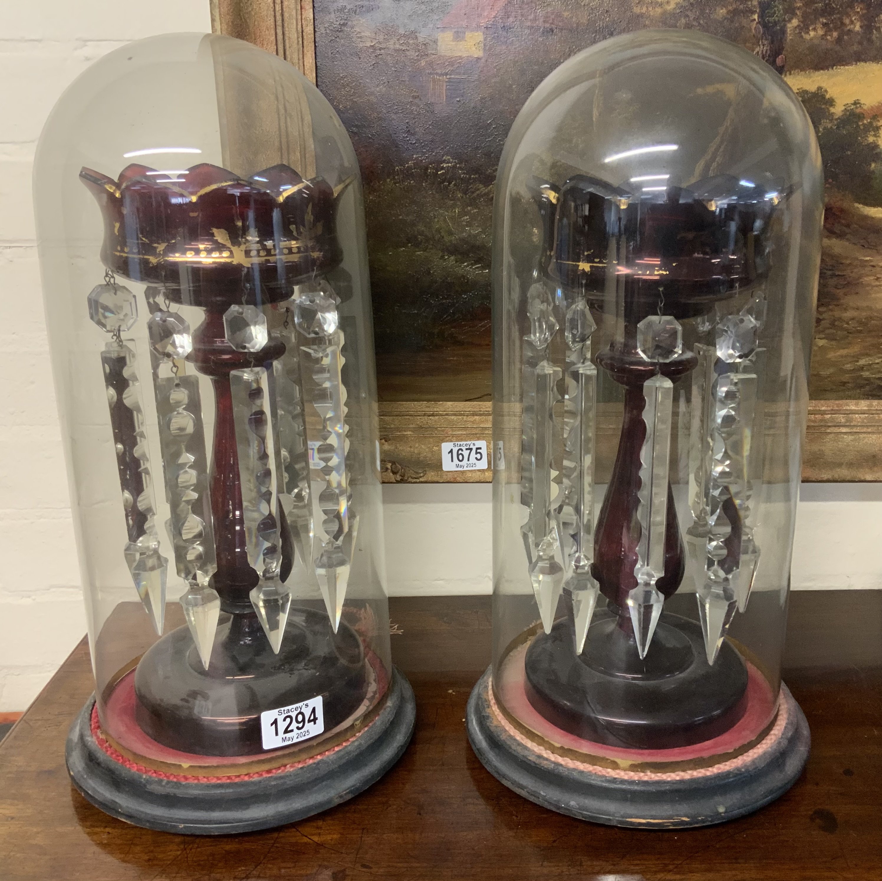 A pair of Victorian ruby glass fluted lustres (some crystal drops missing) with original glass domes and ebonized stands, wear to gilt decoration ,no damage to glass lustres. (D)