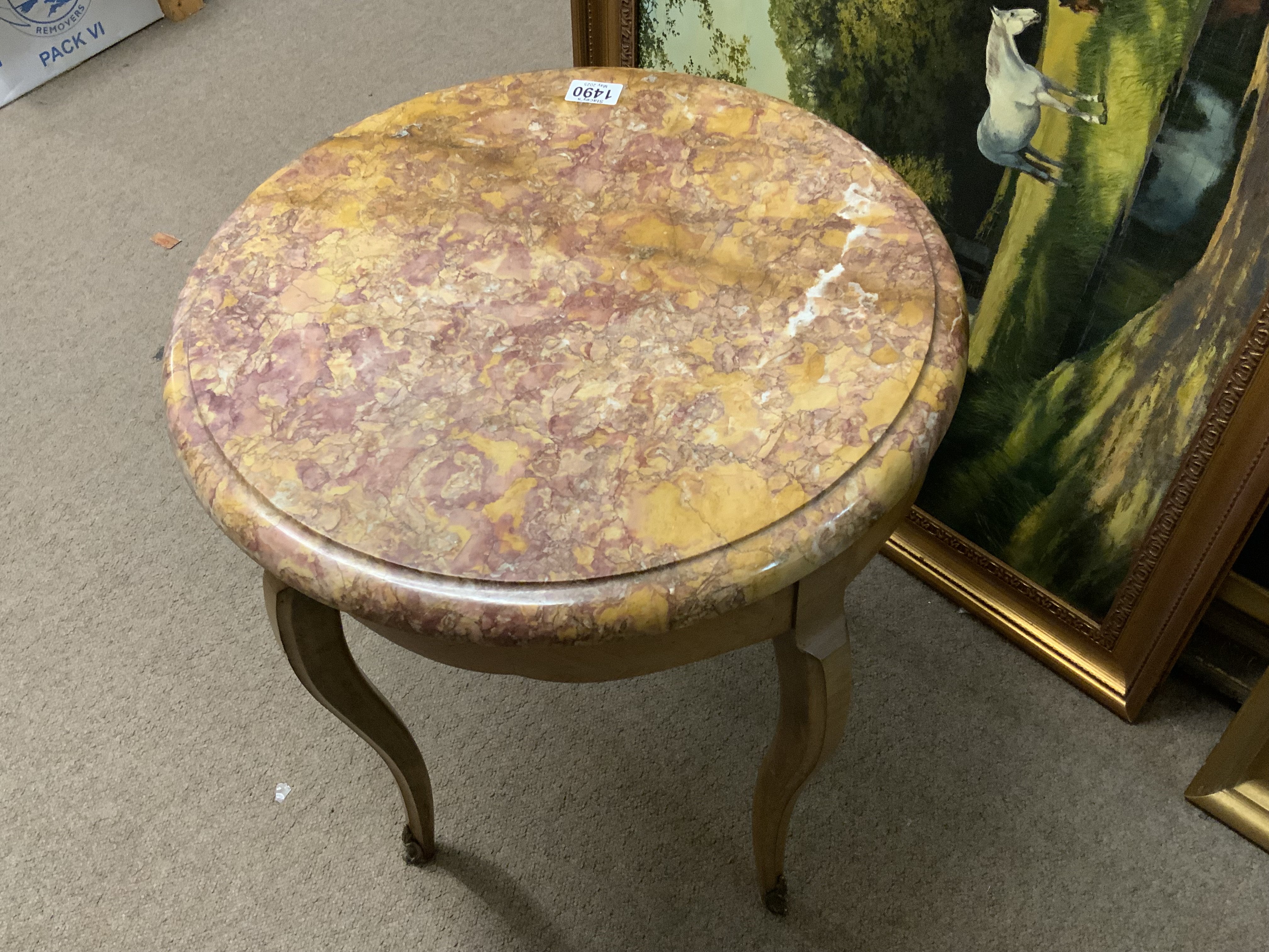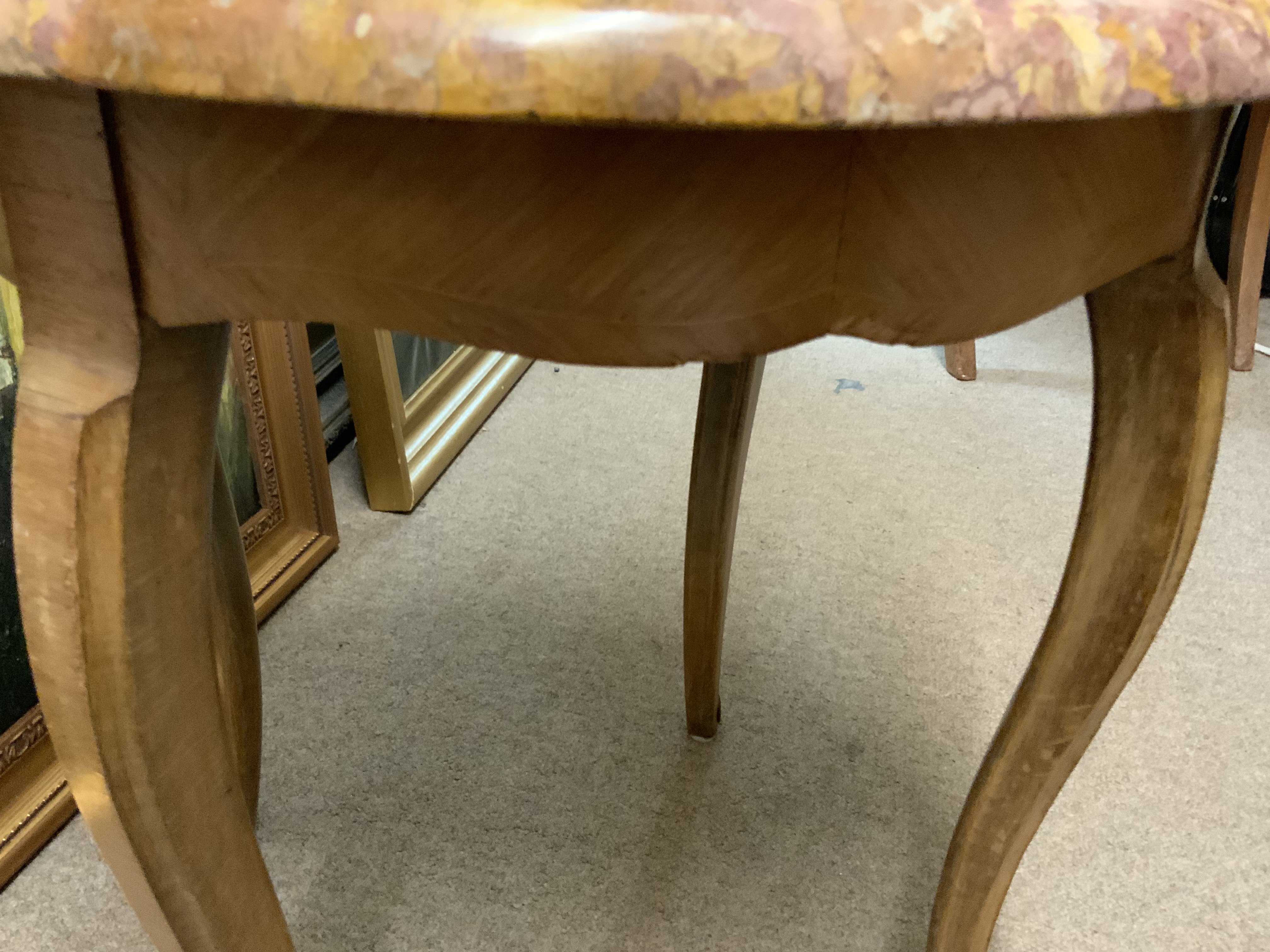 A small Italian marble topped marquetry side table, 55cm x 50cm.