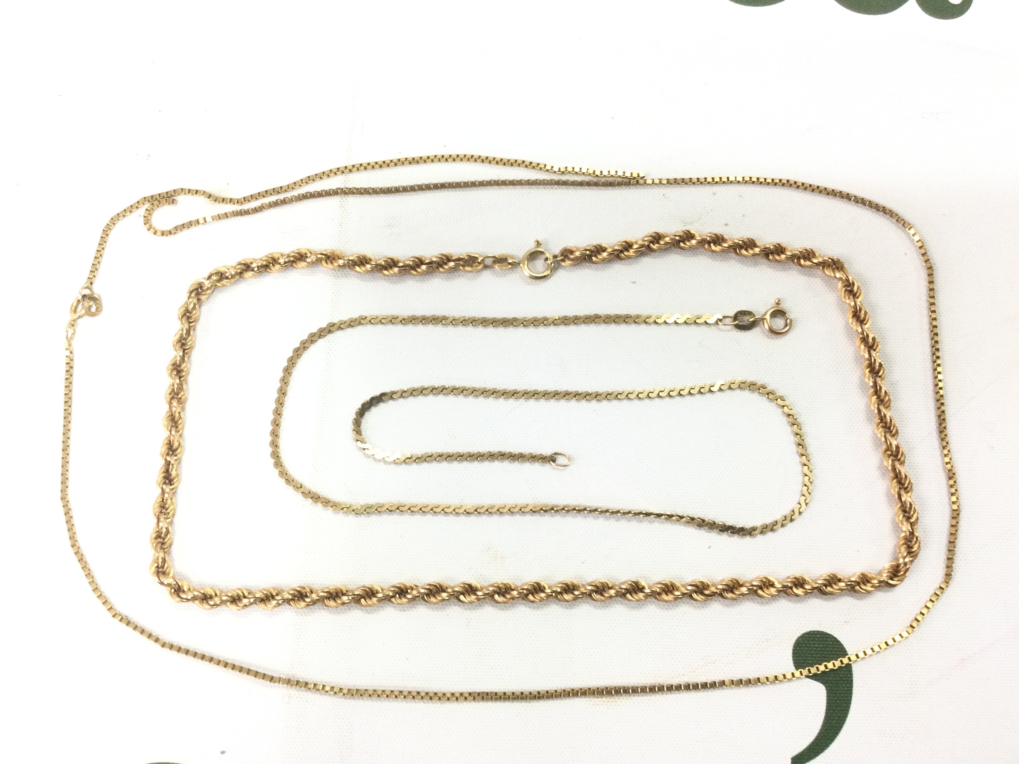 Three gold chains, approx total weight 20g. Shipping category A.