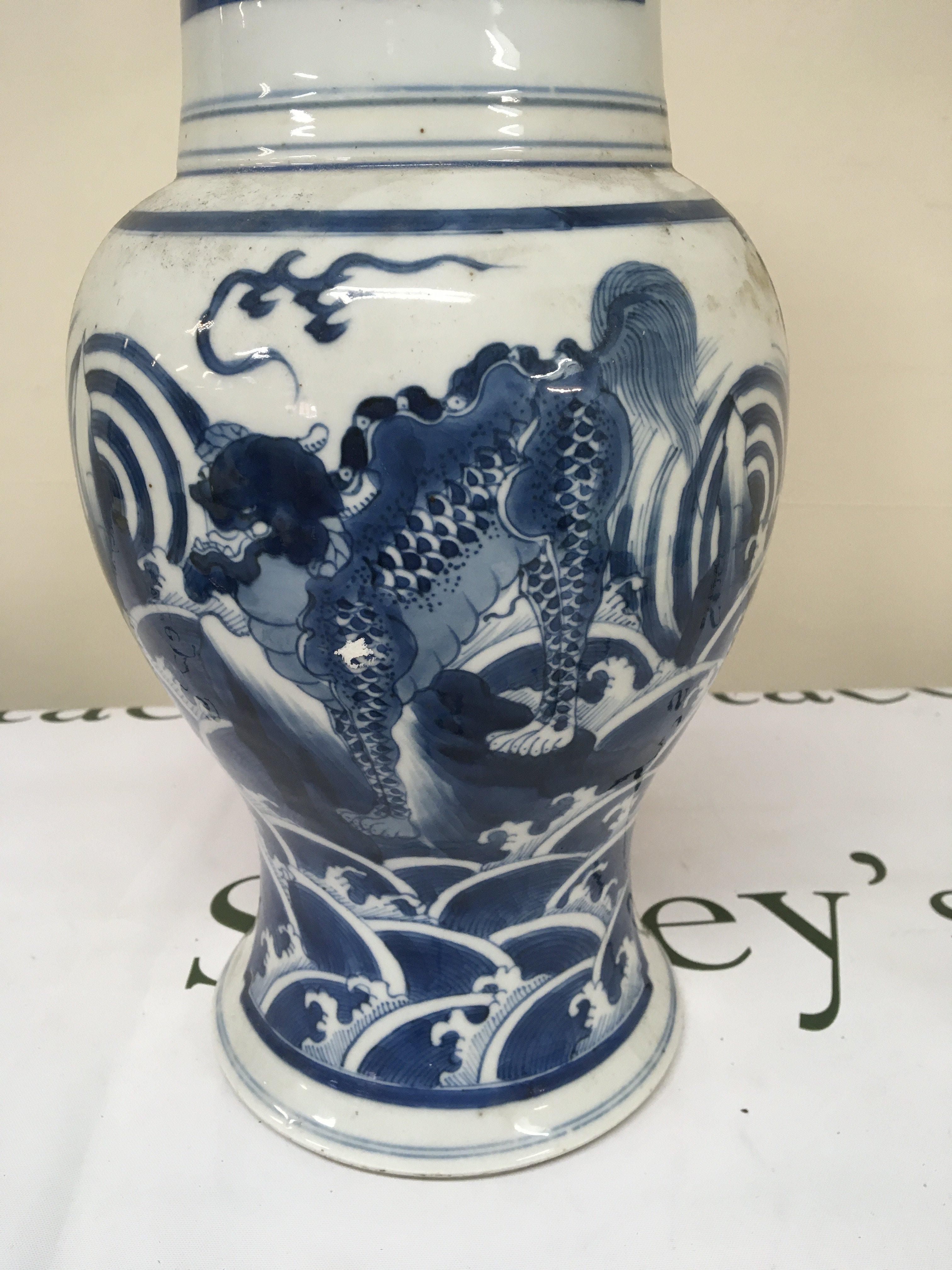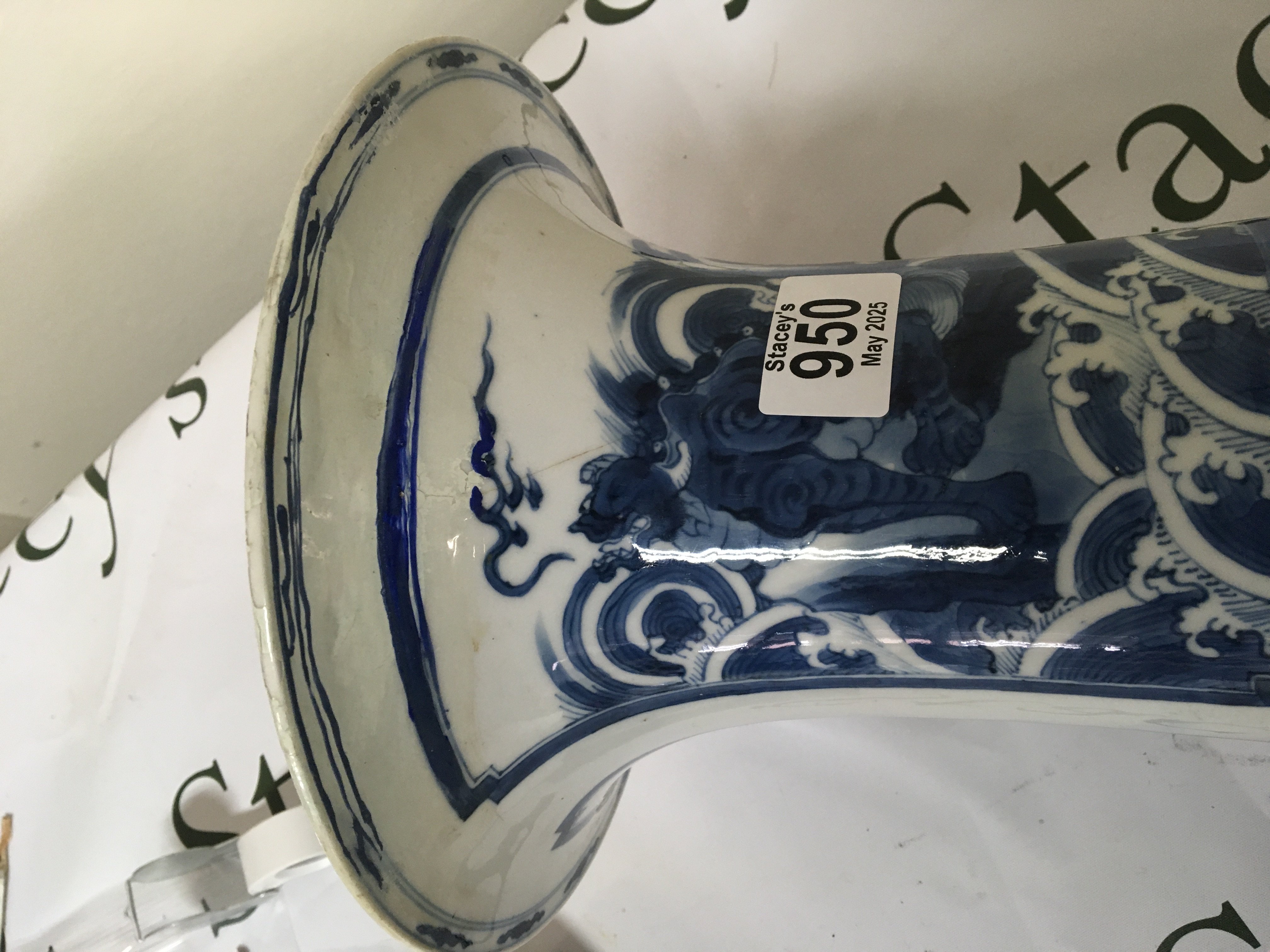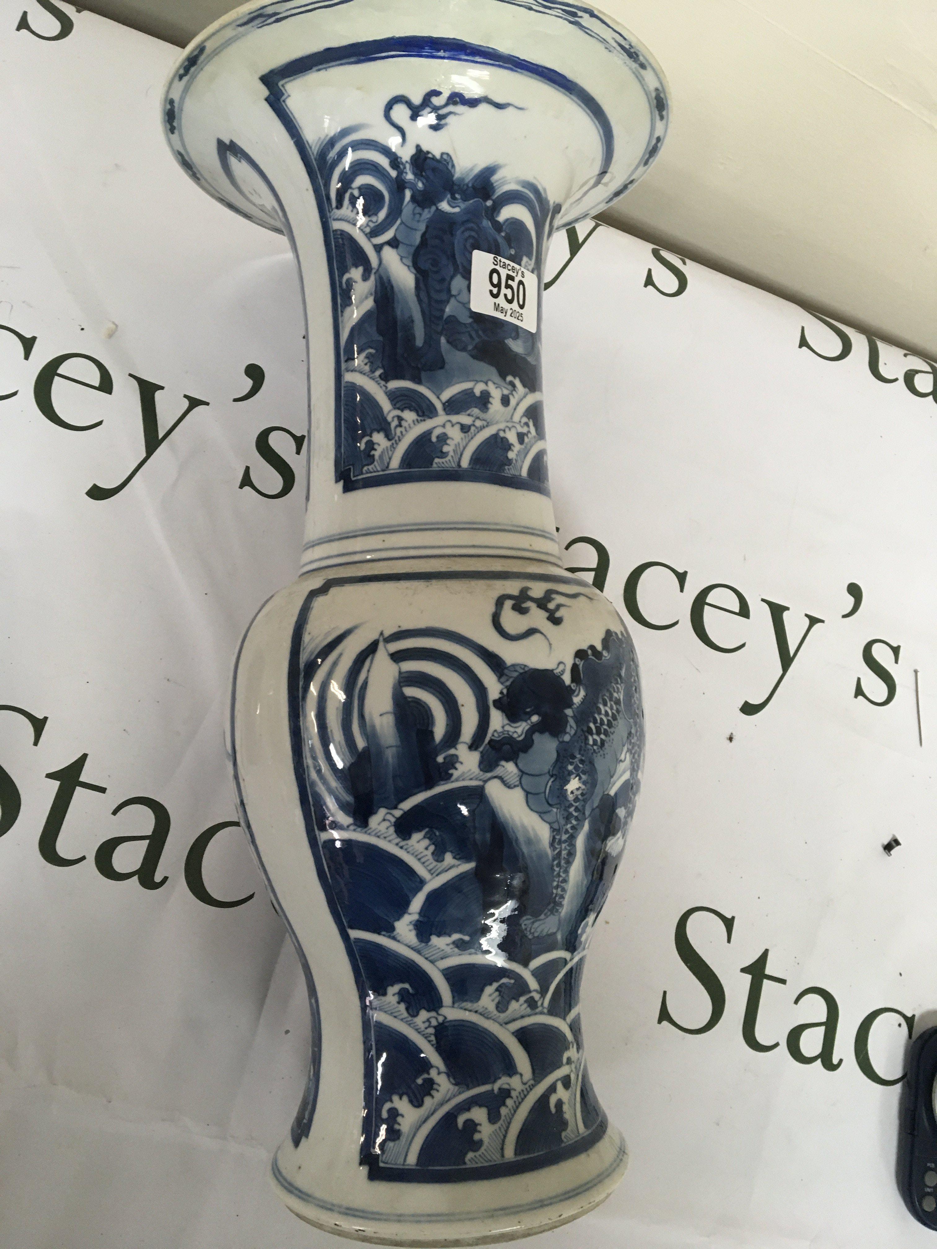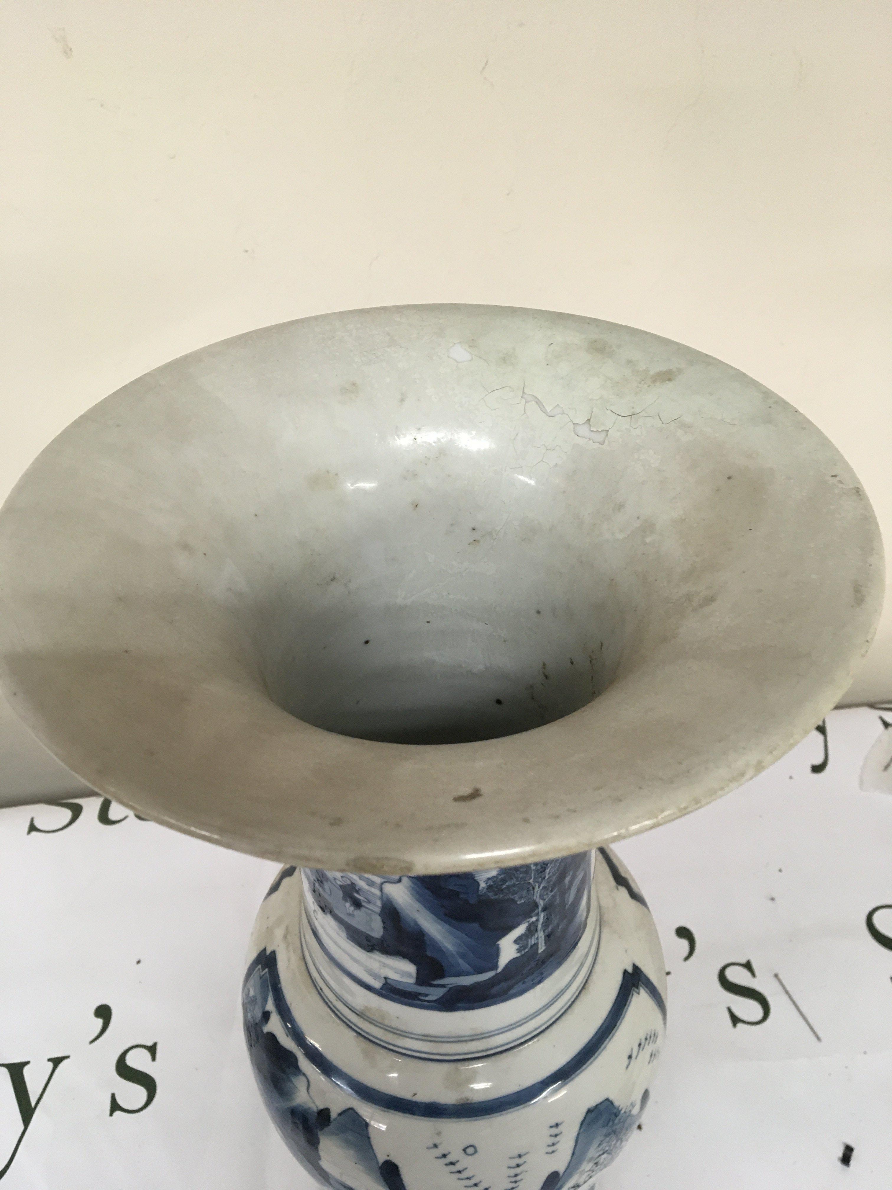 A Chinese early 19th century Export porcelain blue and white vase with a flared rim the body of the vase with panels decorated with temple dogs. the reverse side of the vase with mountain landscape and figures Rim restored Height 45cm