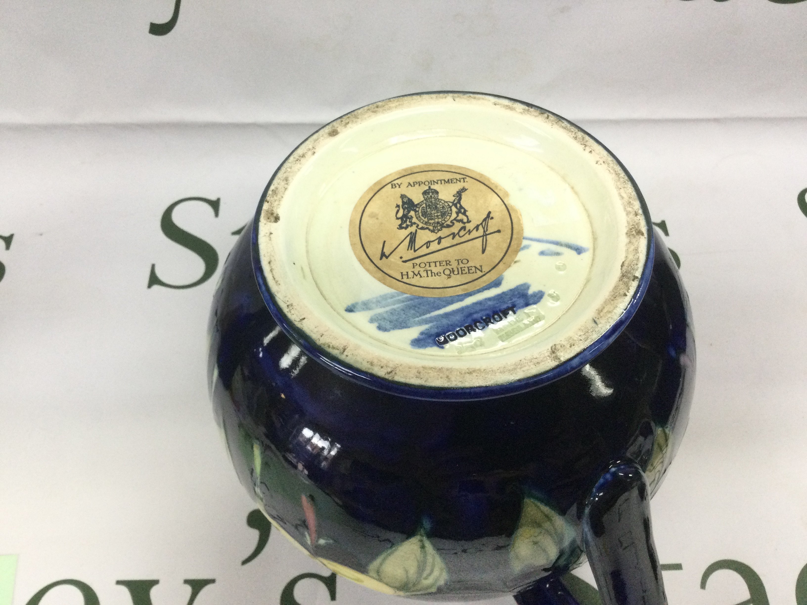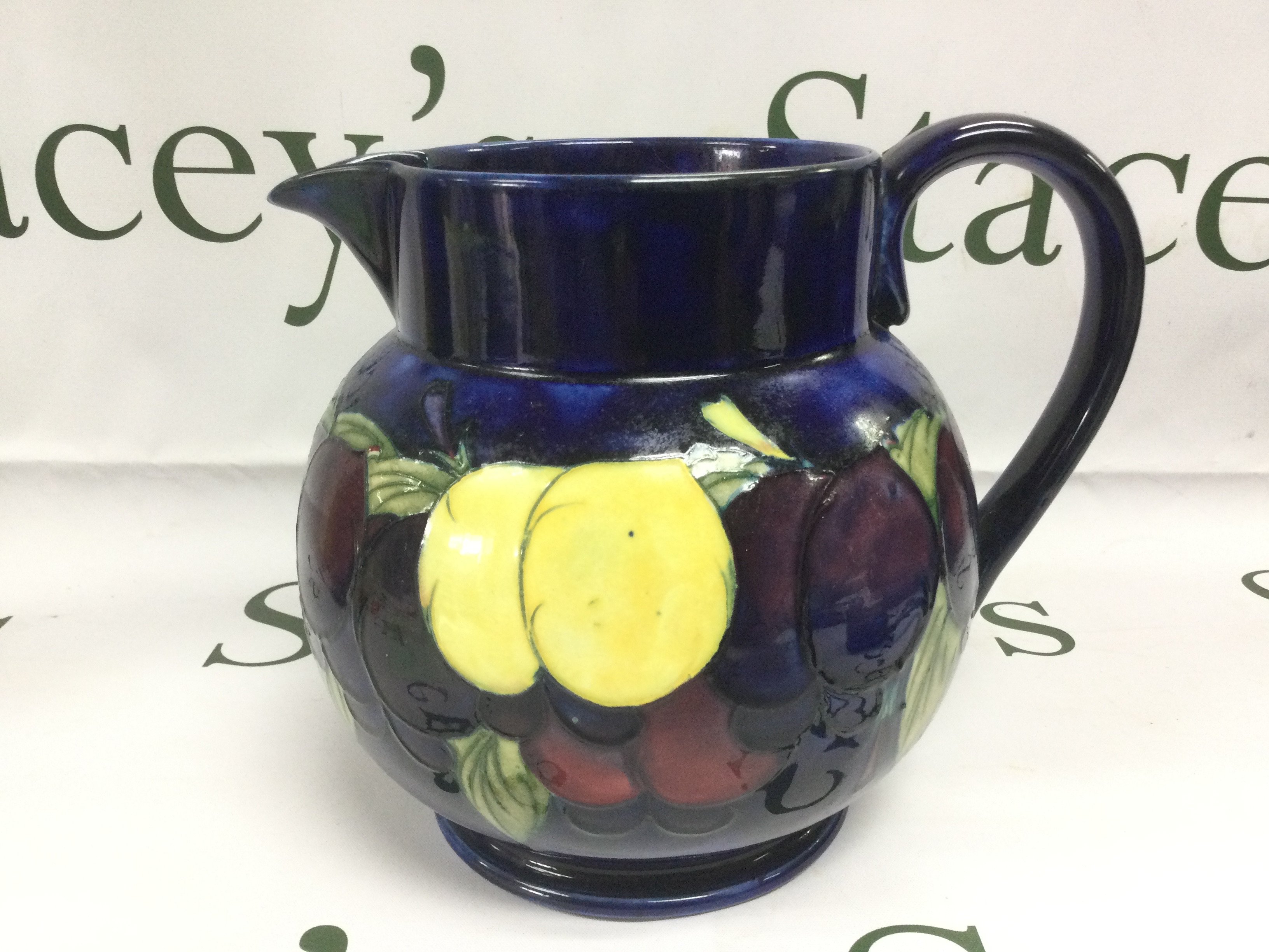 A circa 1930s Moorcroft jug in Wisteria plum pattern, approx height 17cm. Comes with a later Moorcroft box. Shipping category D.