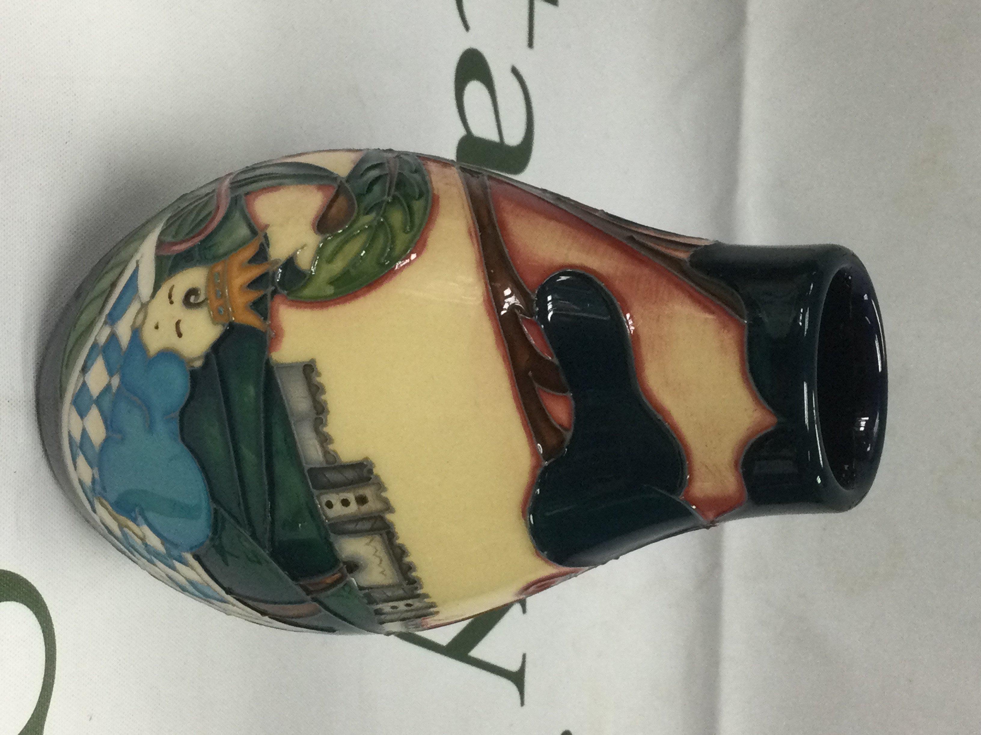 A small Moorcroft vase of Sleeping Prince pattern designed by Nicola Slaney, approx height 13cm. Comes with a Moorcroft box. Shipping category D.