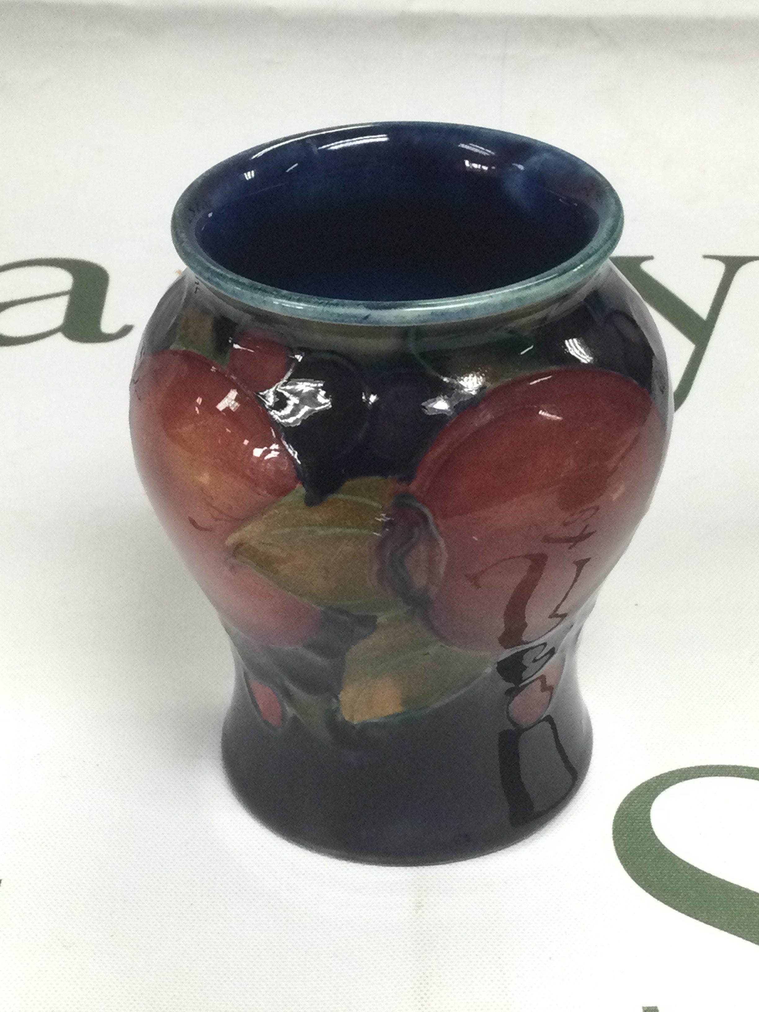 A small Moorcroft vase in pomegranate pattern, approx height 8.5cm. Shipping category D.