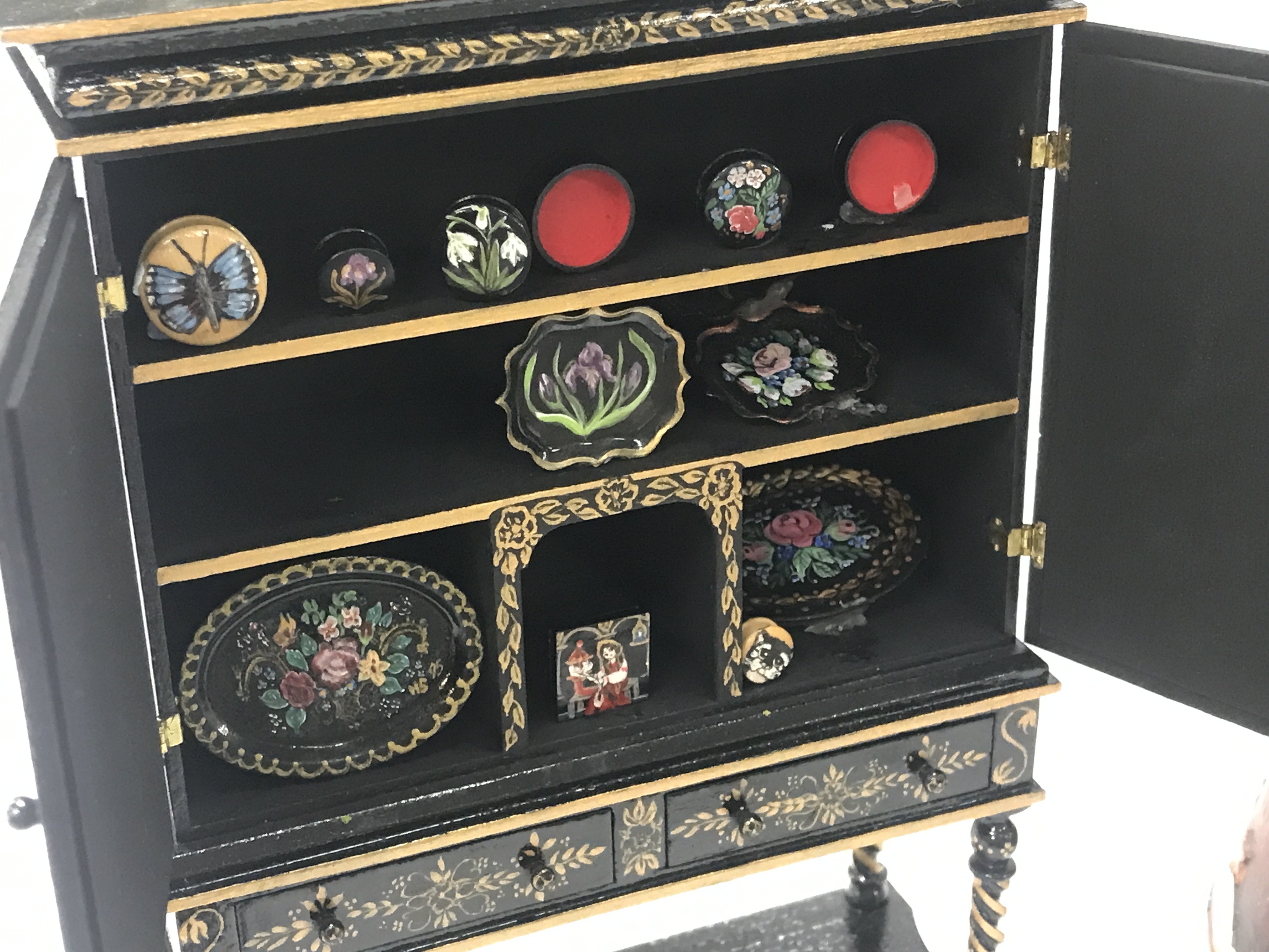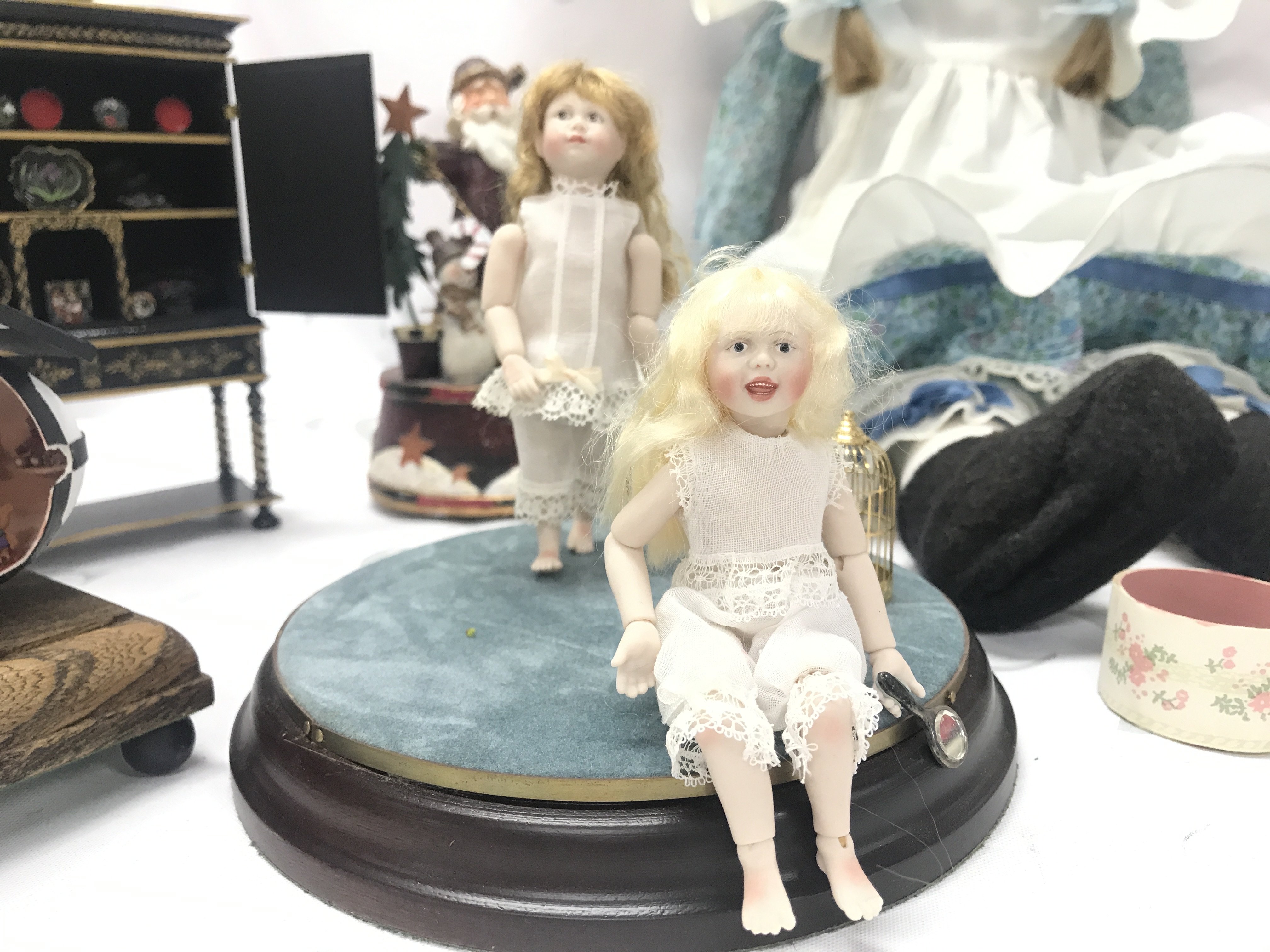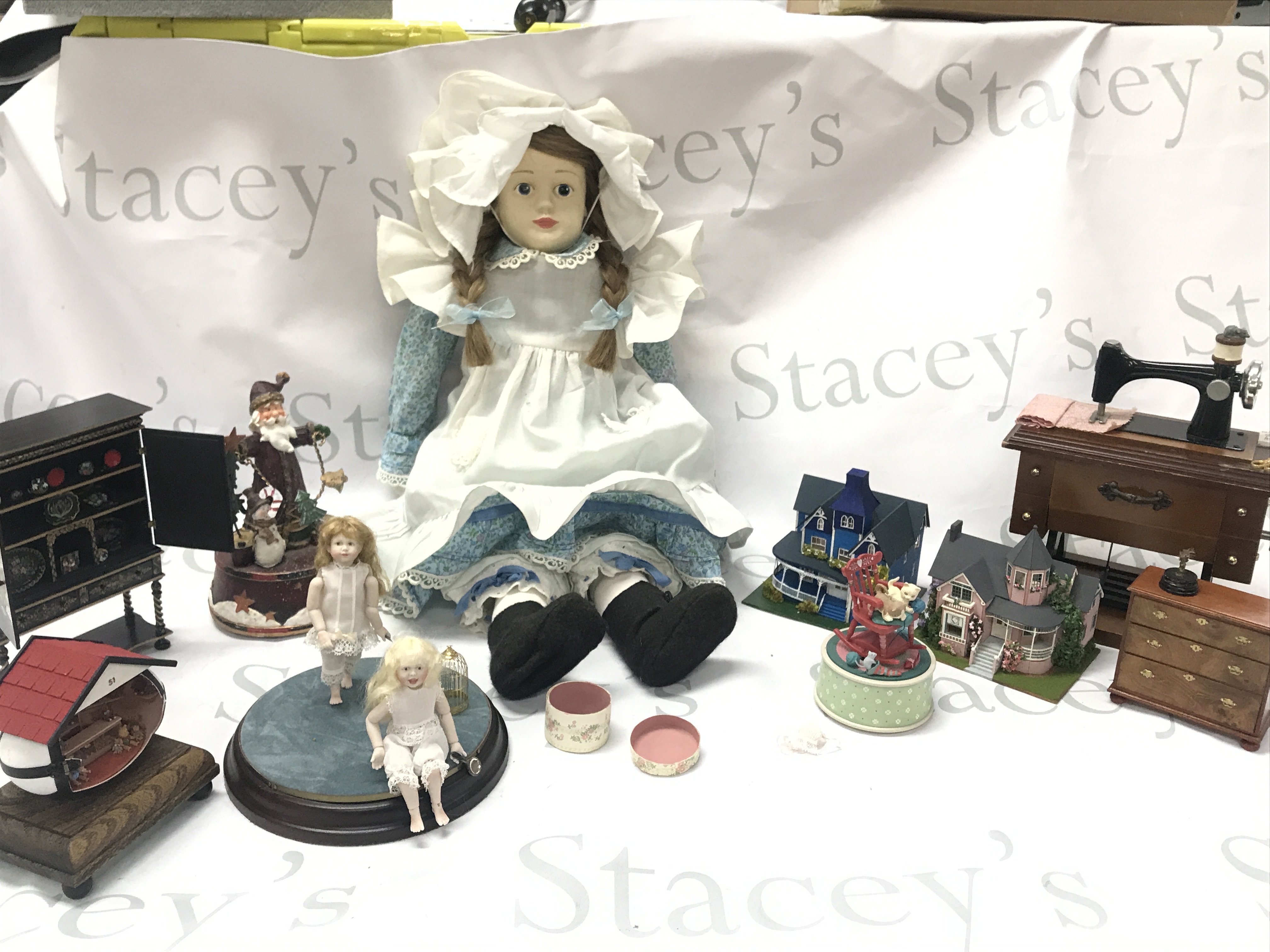 A Collection of miniature house models including one Pat Russo, a doll, music boxes , H. Stringer cabinet, Berkeley designs sewing machine music box. Postage category C