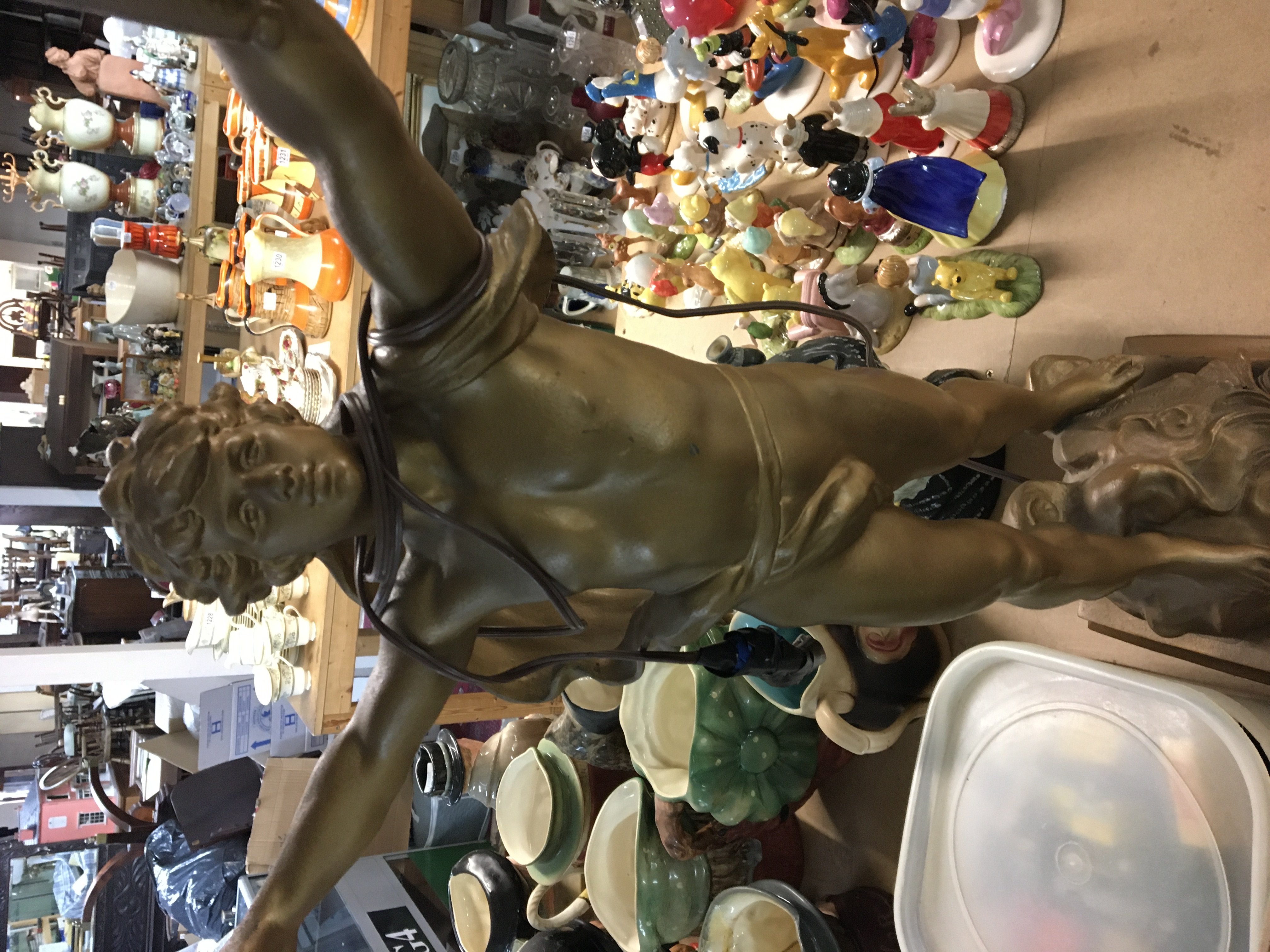 A Spelter lamp in the form of a classical figure . Together with a glass lamp .