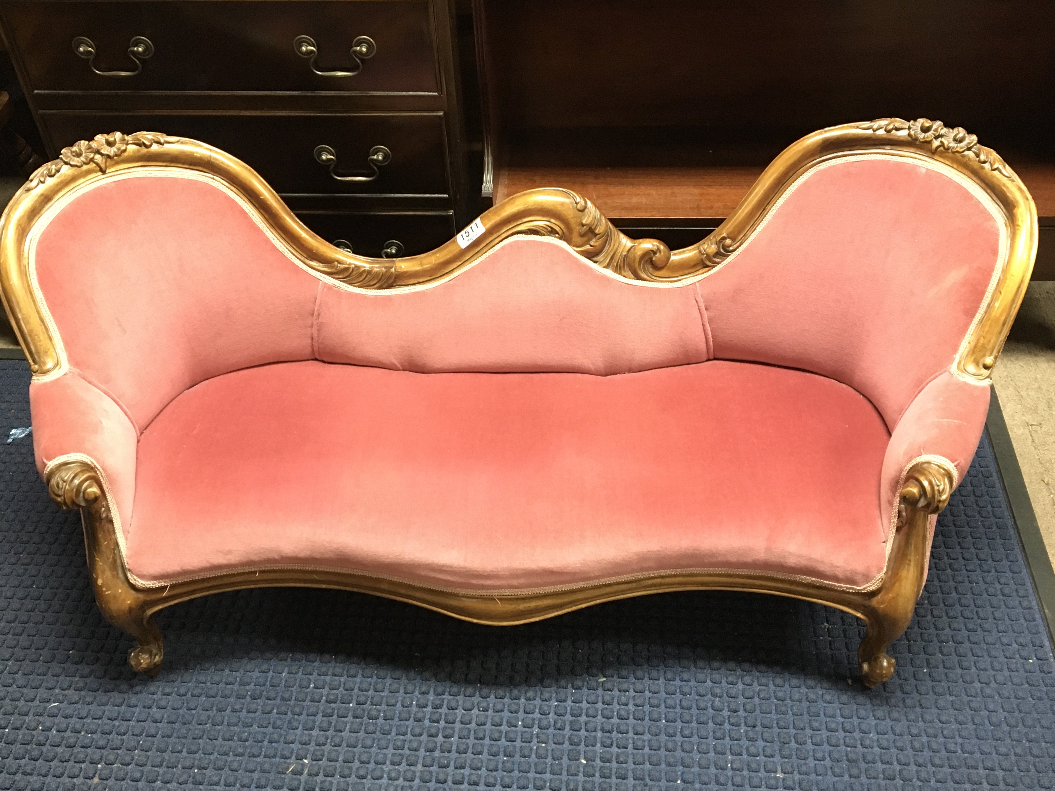 A Victorian style childs sofa with a shaped back she wood frame serpentine seat scroll arms and legs 113cm long.