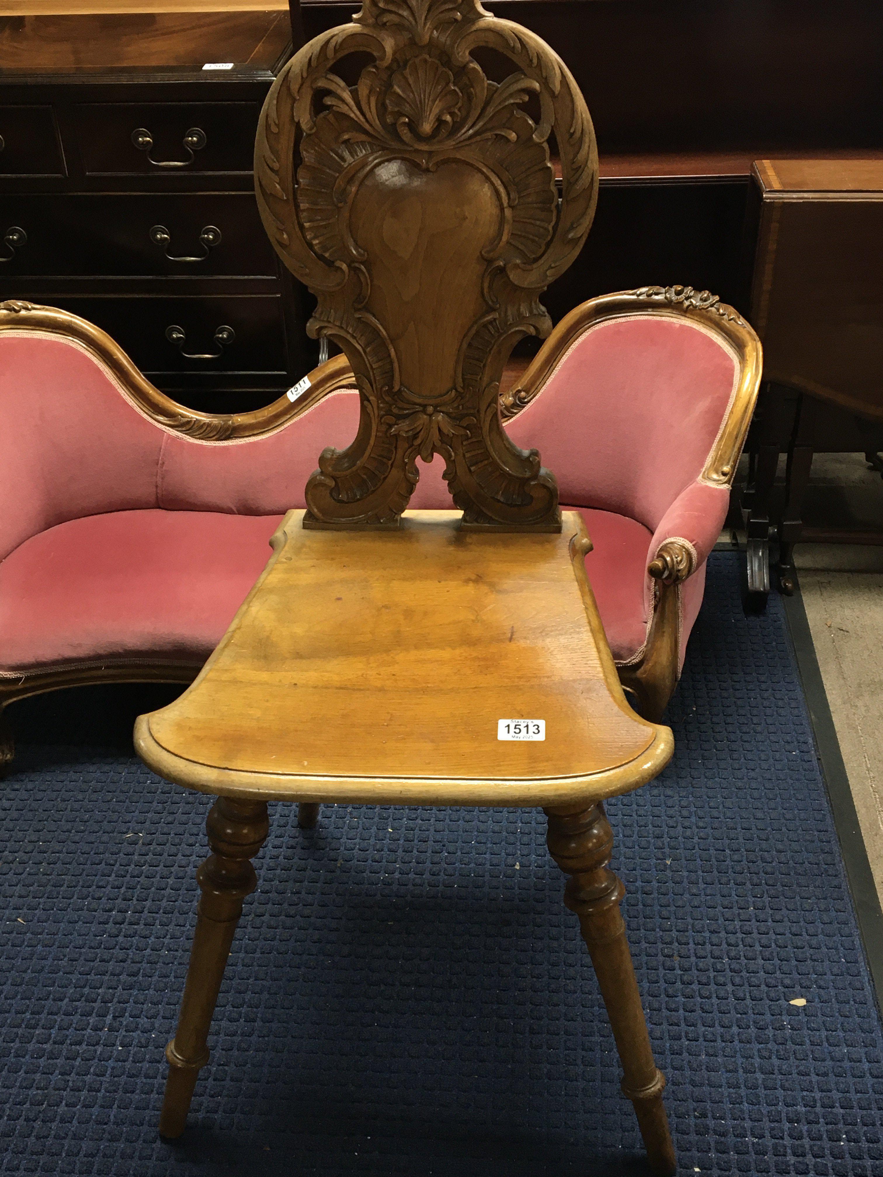 A Continental carved hall chair with a carved back solid seat and turned legs.