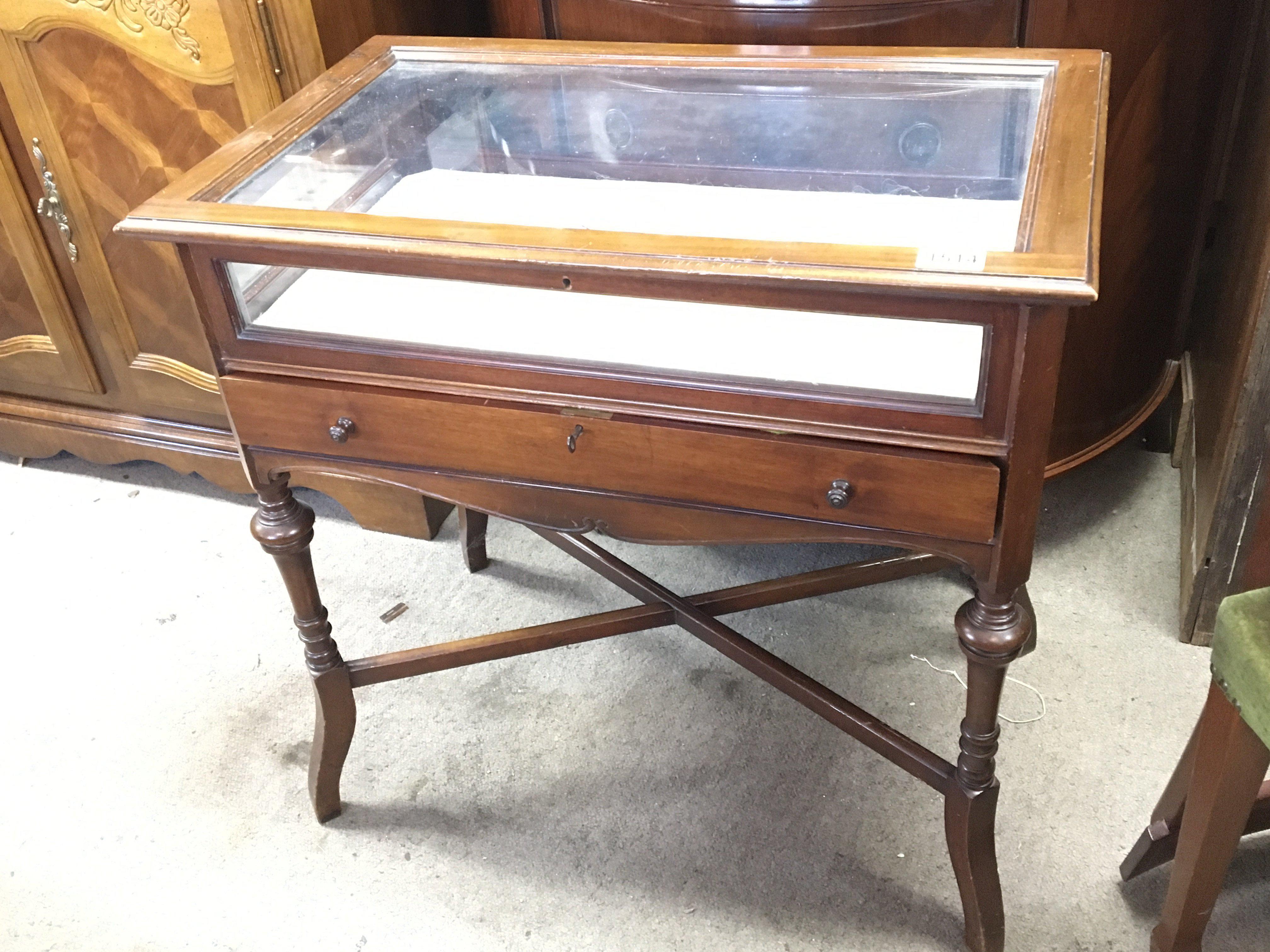 A Mahogany Vertrine display cabinet with a hinged glazed top above a single drawer on turned legs. 67cm wide