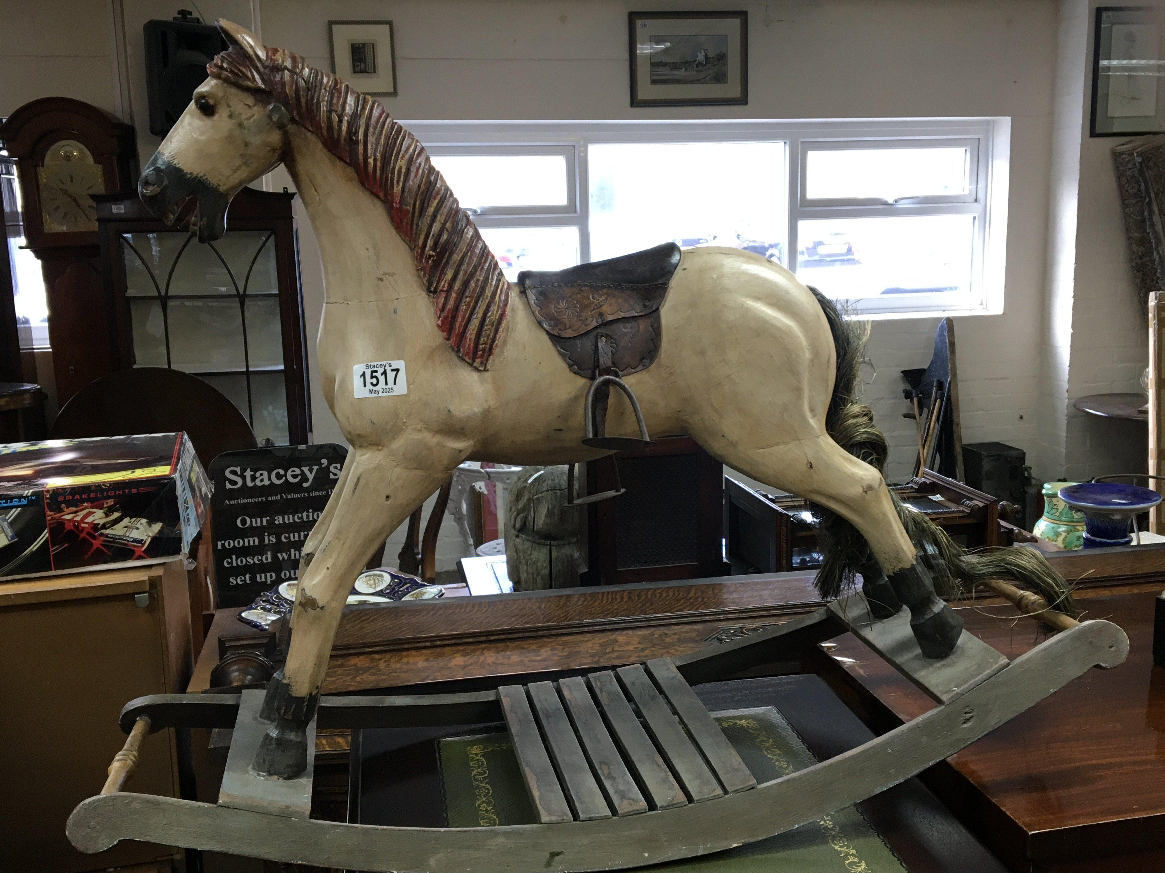 A carved wood and painted small child or ornamental rocking horse with a leather saddle.