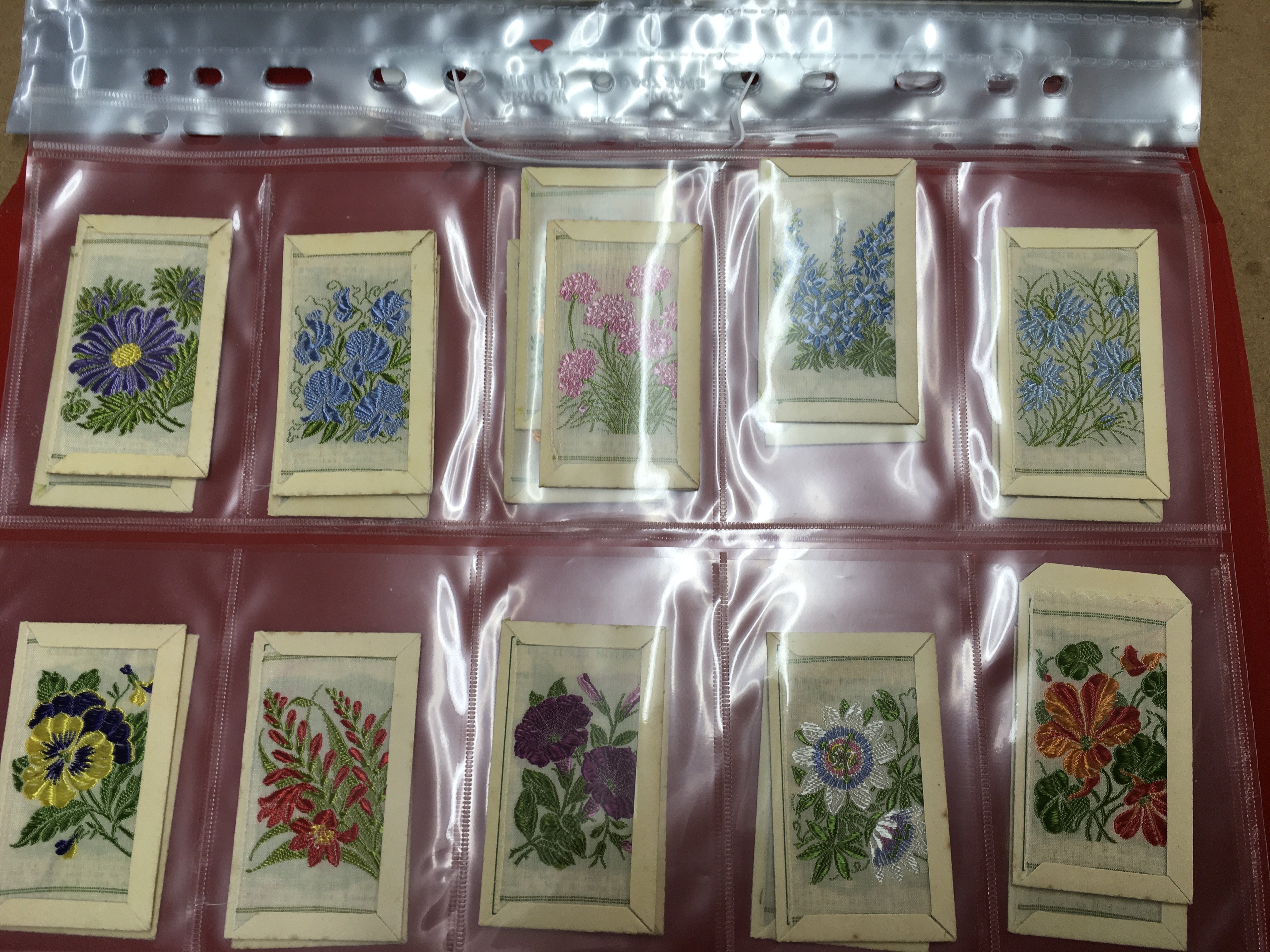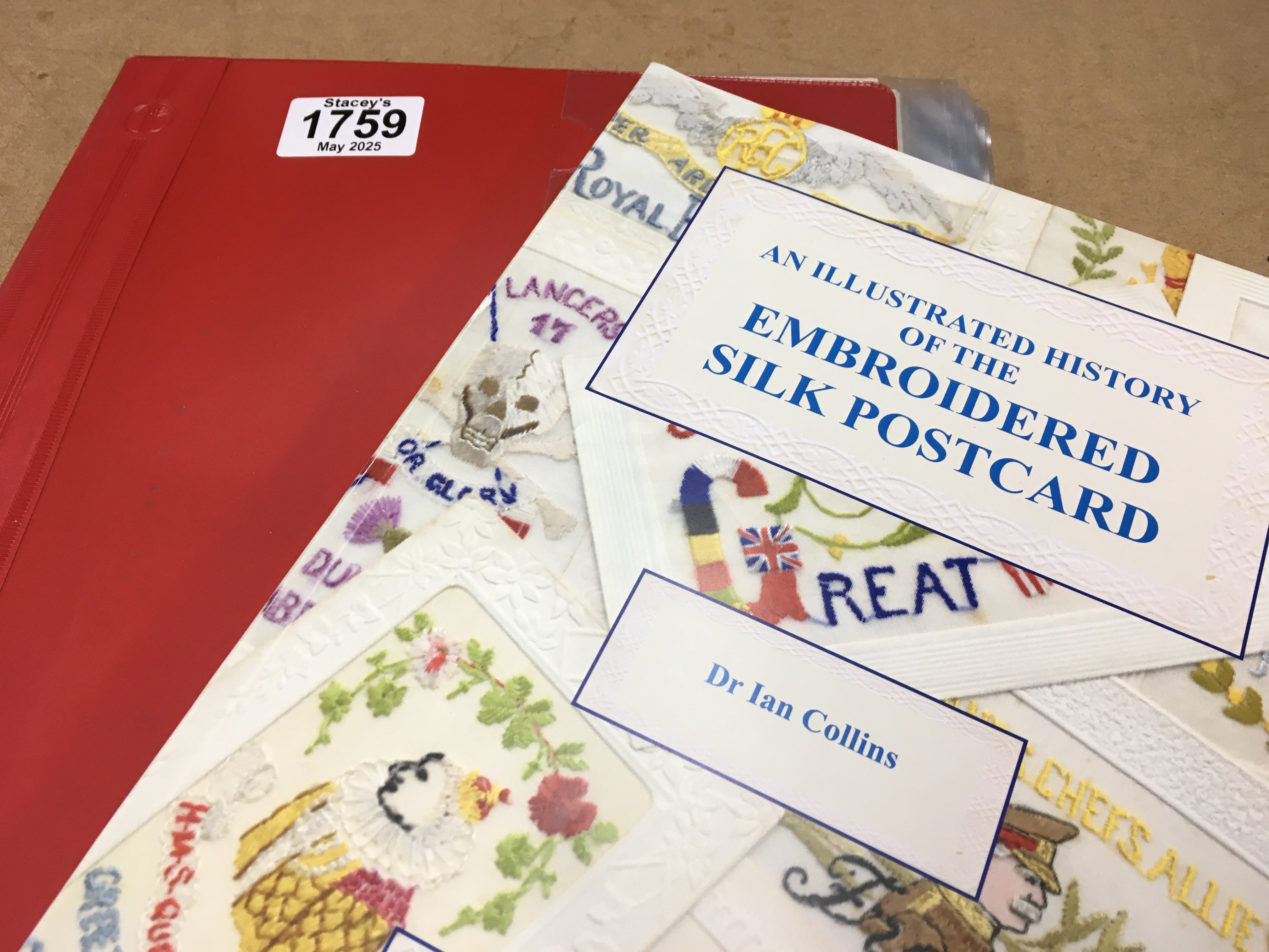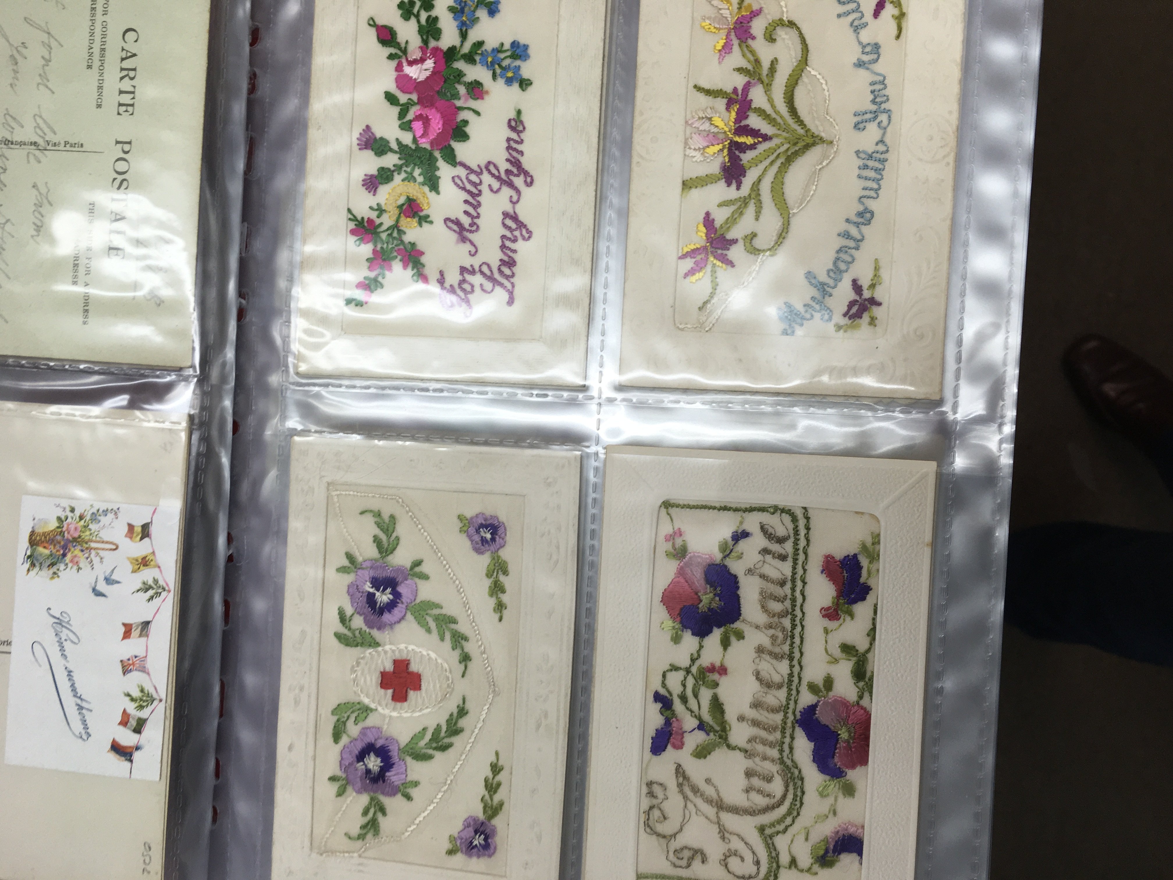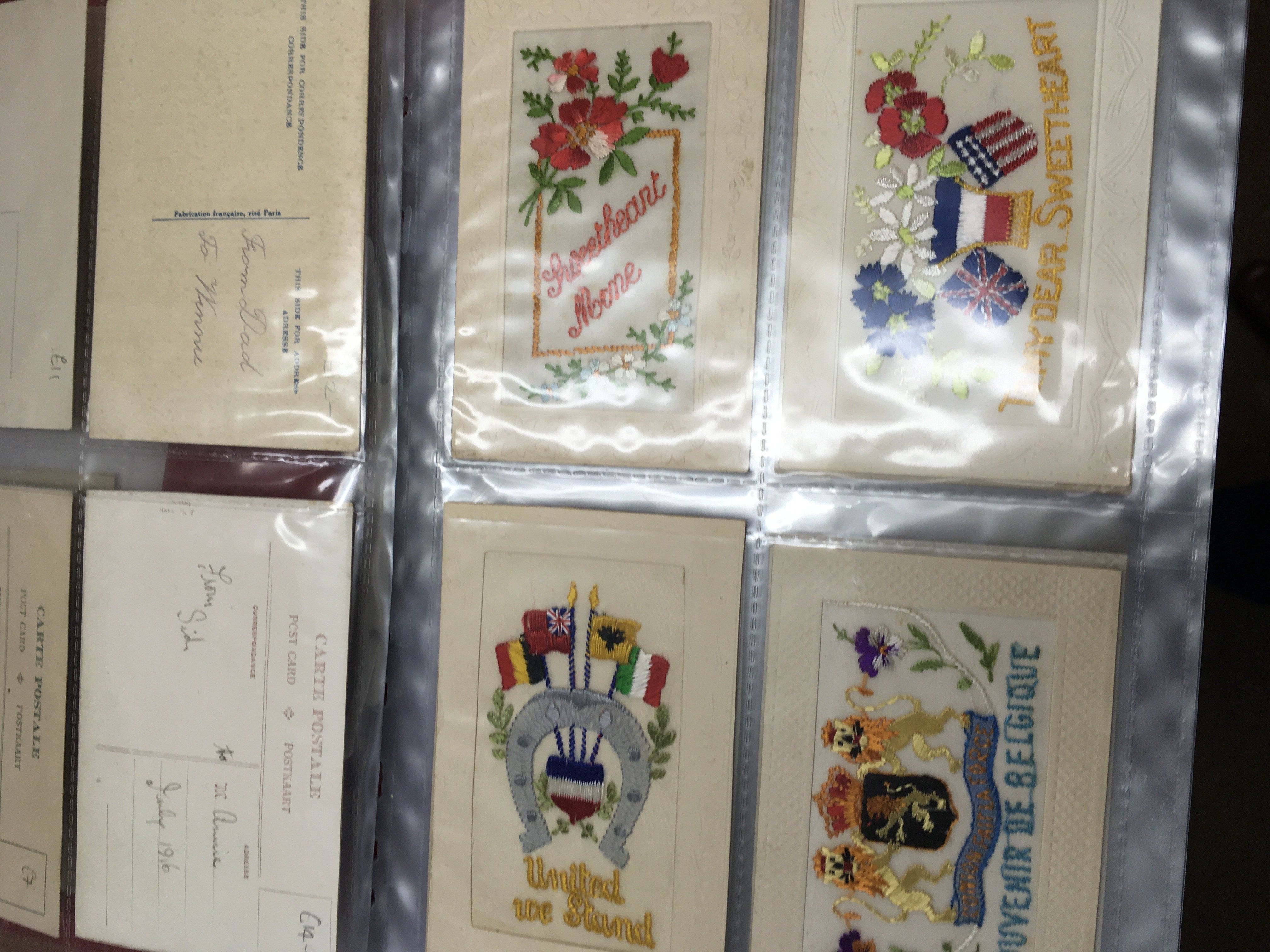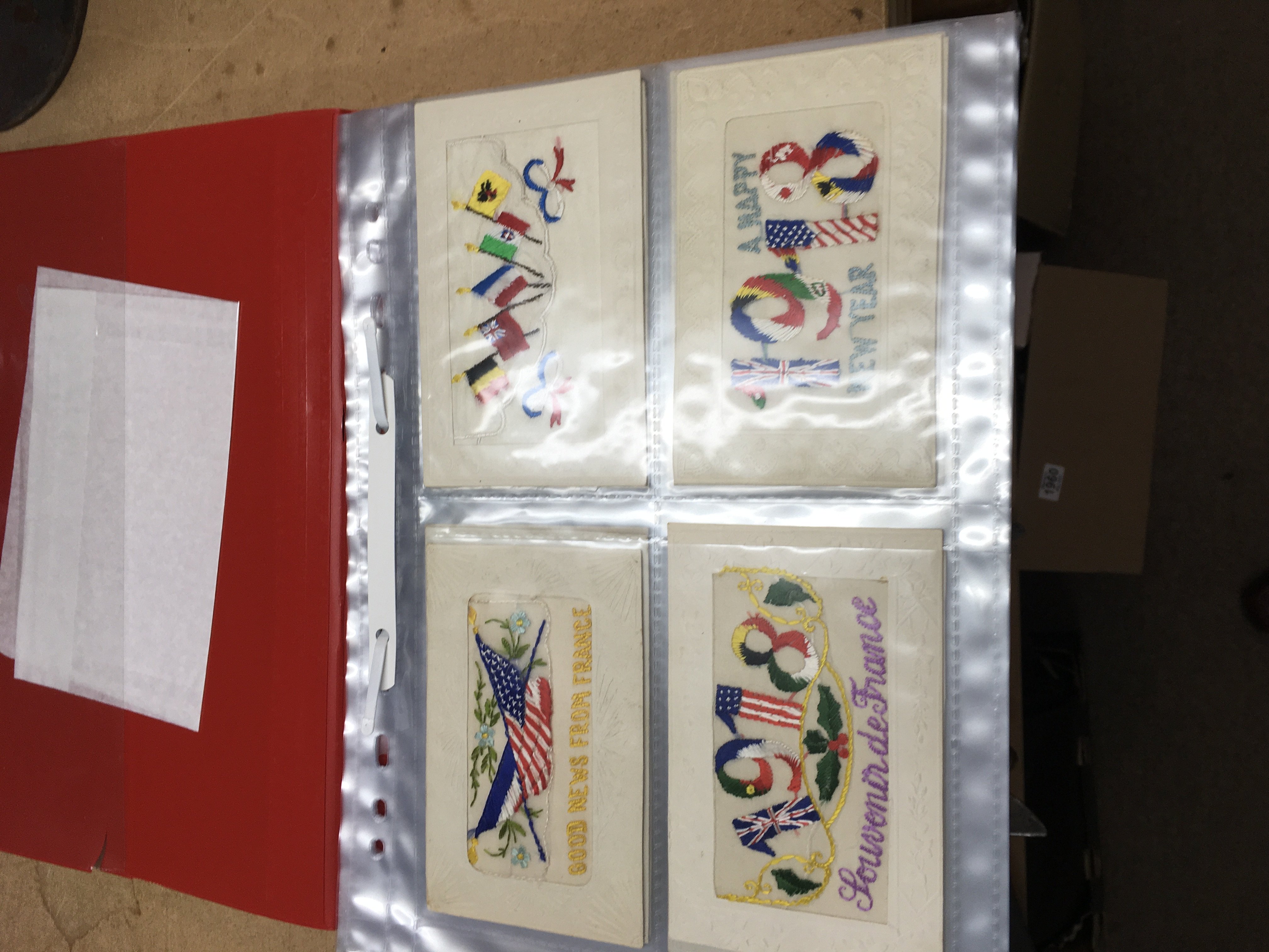 A collection of 36 silk WW1 post cards together silk cigarette cards .