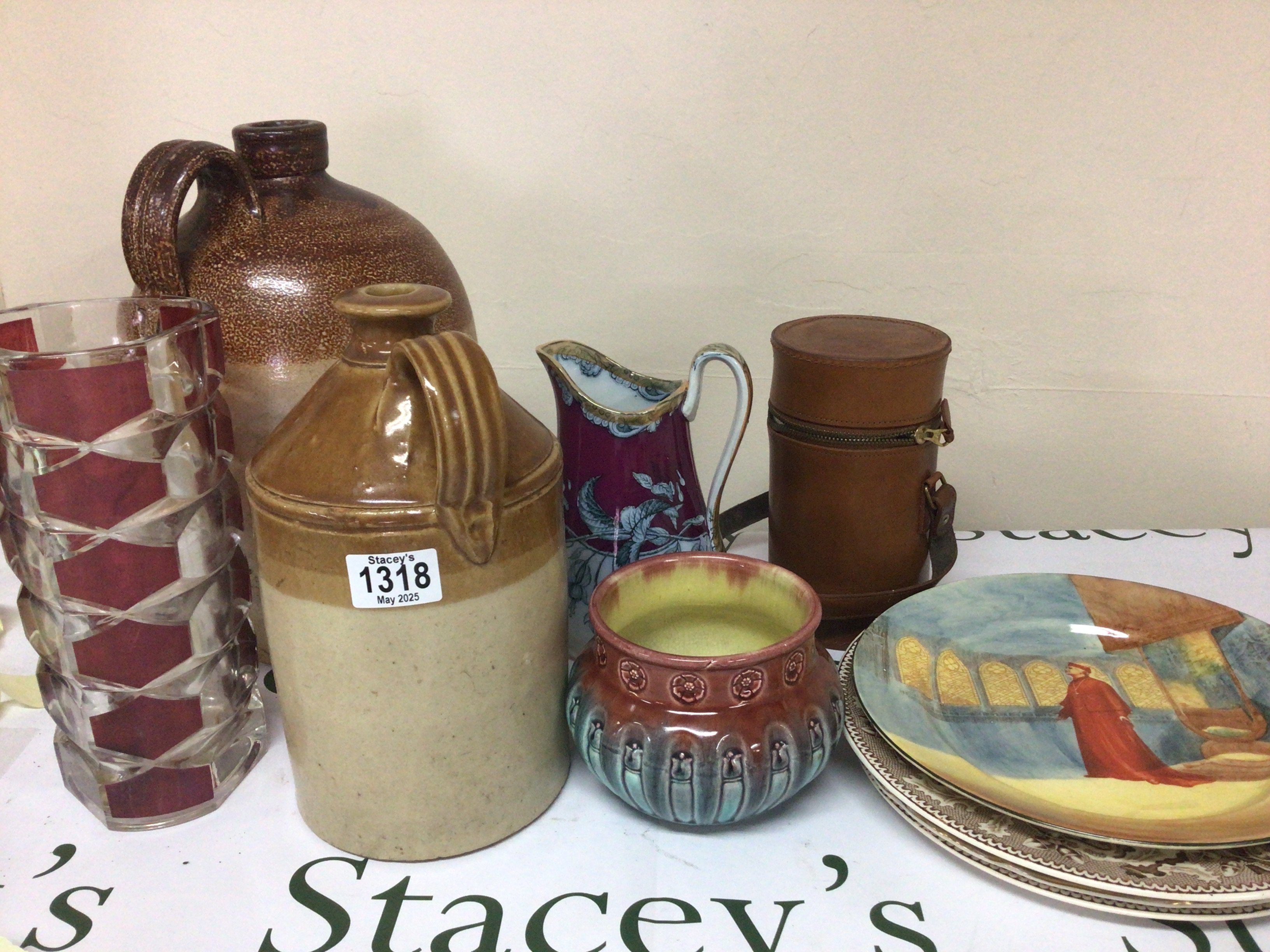 A collection of ceramic and oddments stoneware salt glazed flagon Bretby jardiniere Doulton plates a leather multi bottle hip flask and other oddments in a box.