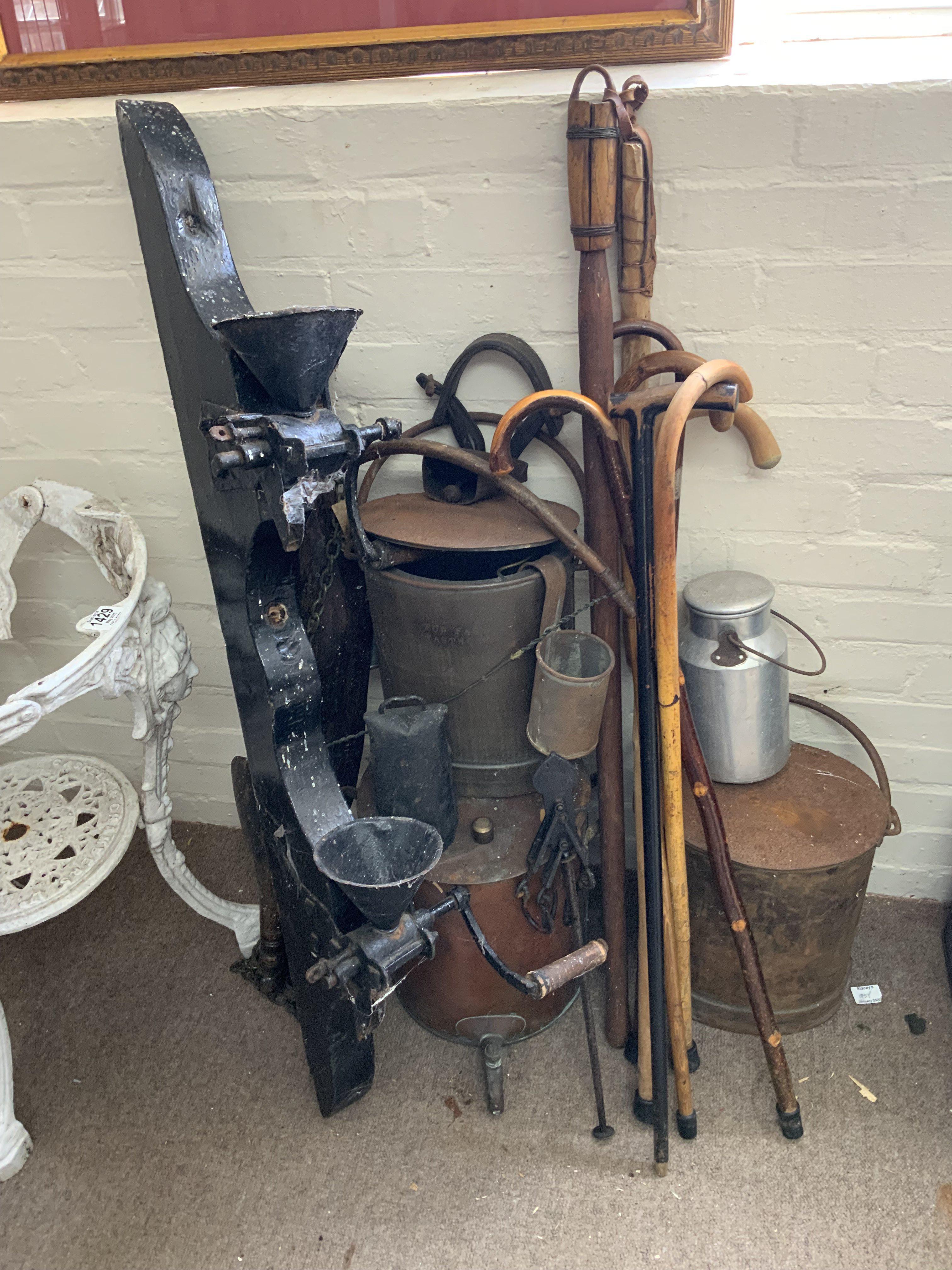a selection of antique farm implements and accessories .