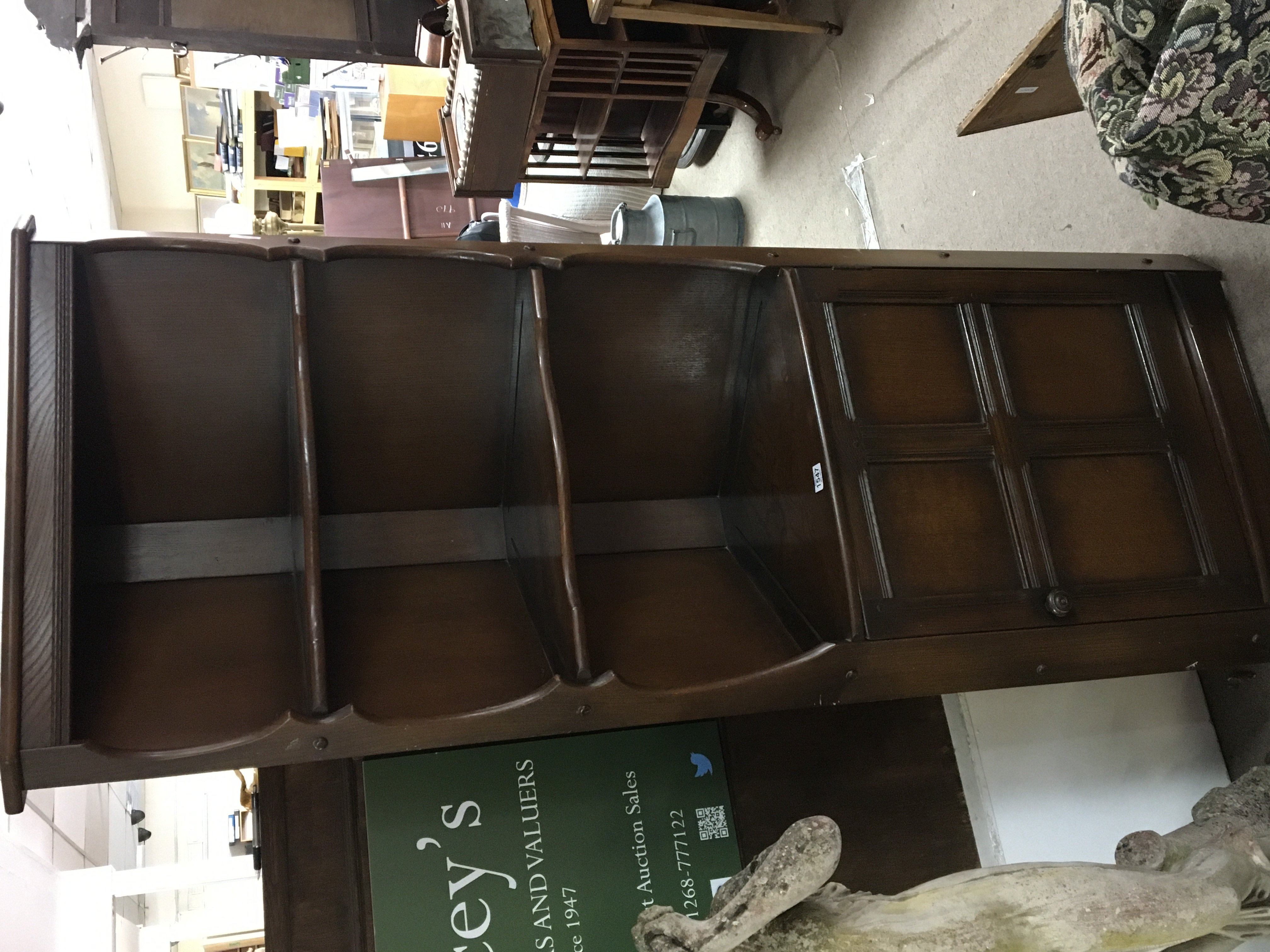 An oak Ercol type corner cabinet with open shelves above a panelled cupboard door no Reserve