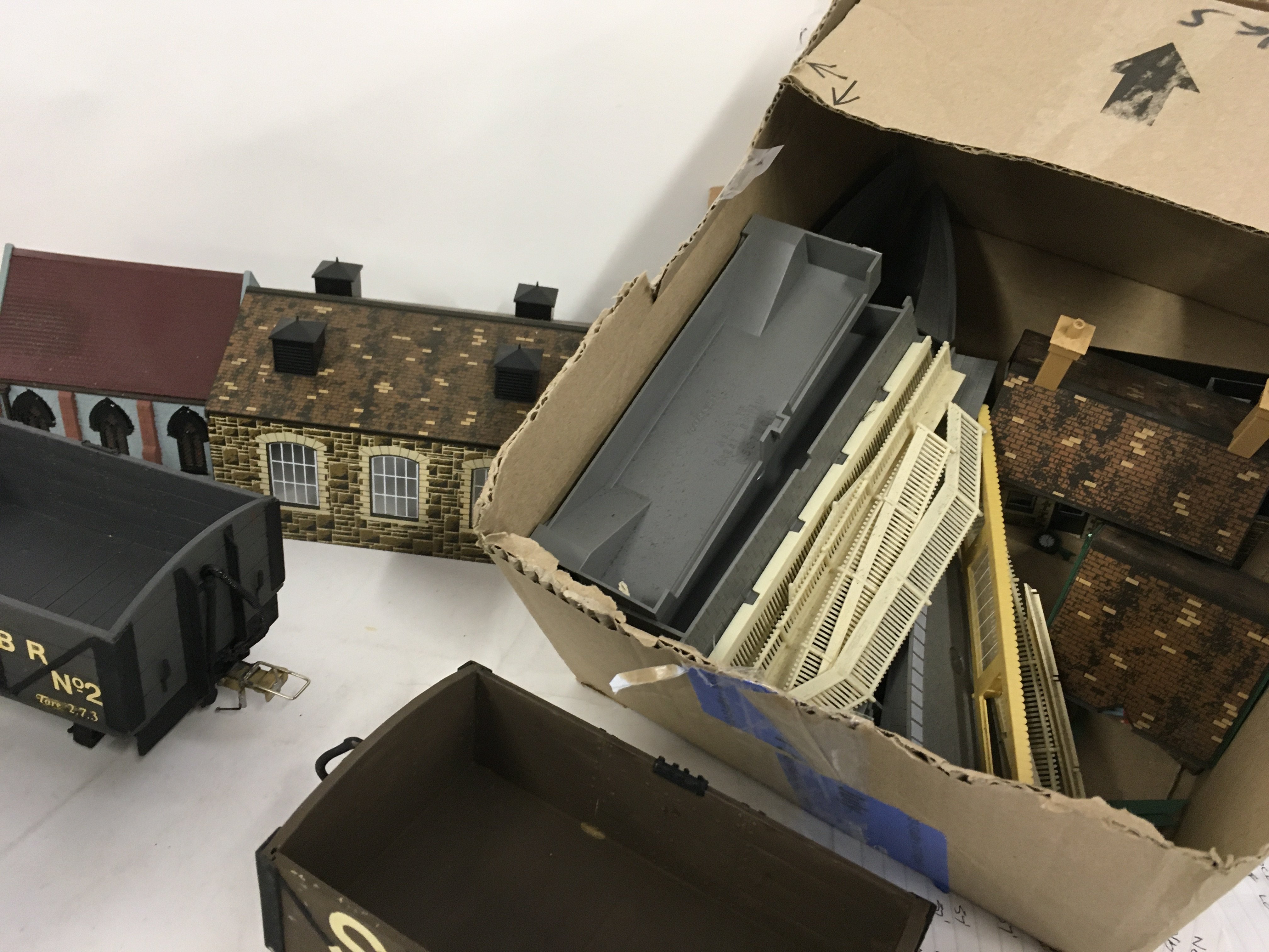 A selection of plastic model buildings for a railway or village scene some assembled. Also 3 x 0 gauge model railway wagons. No reserve
