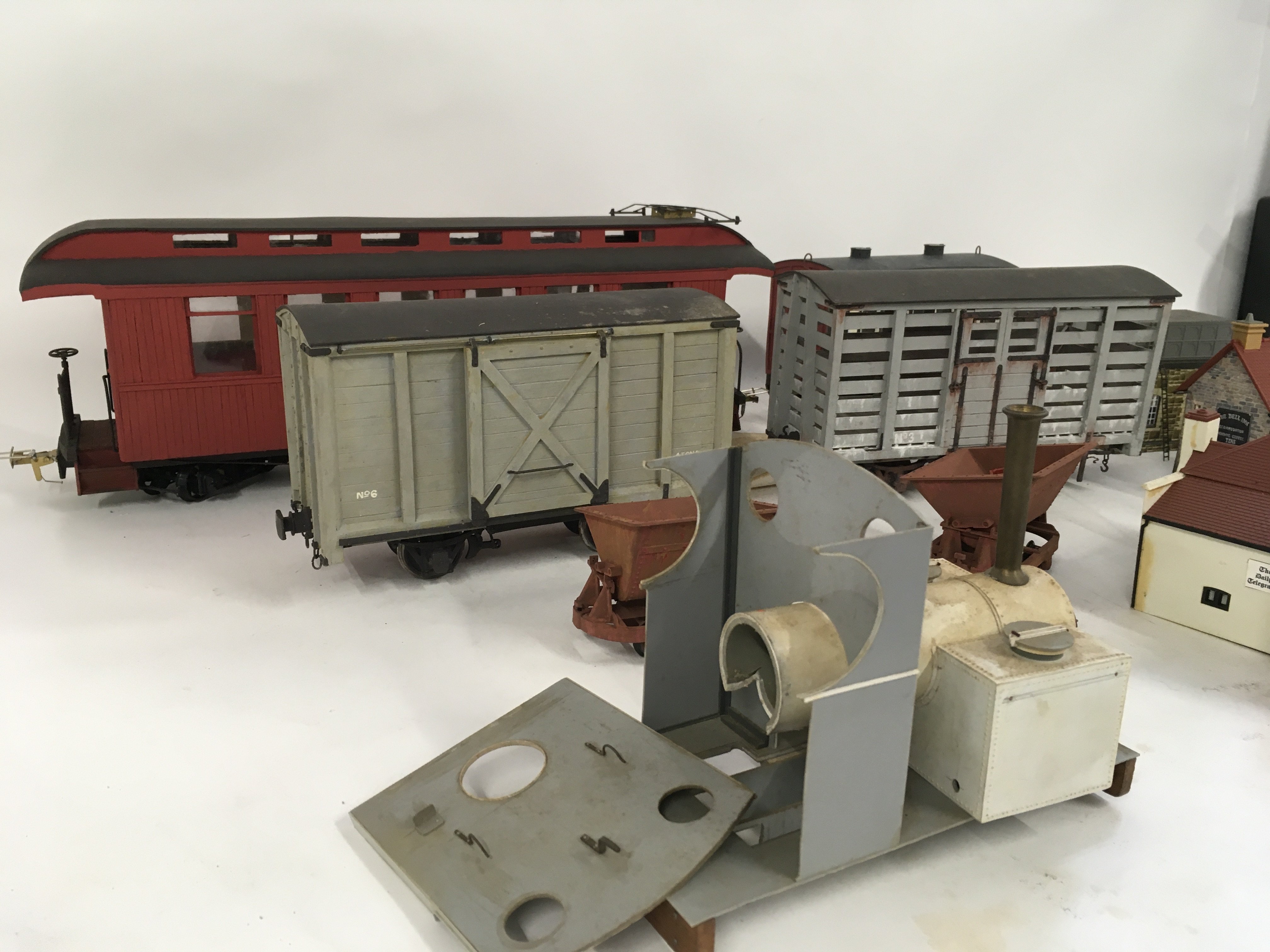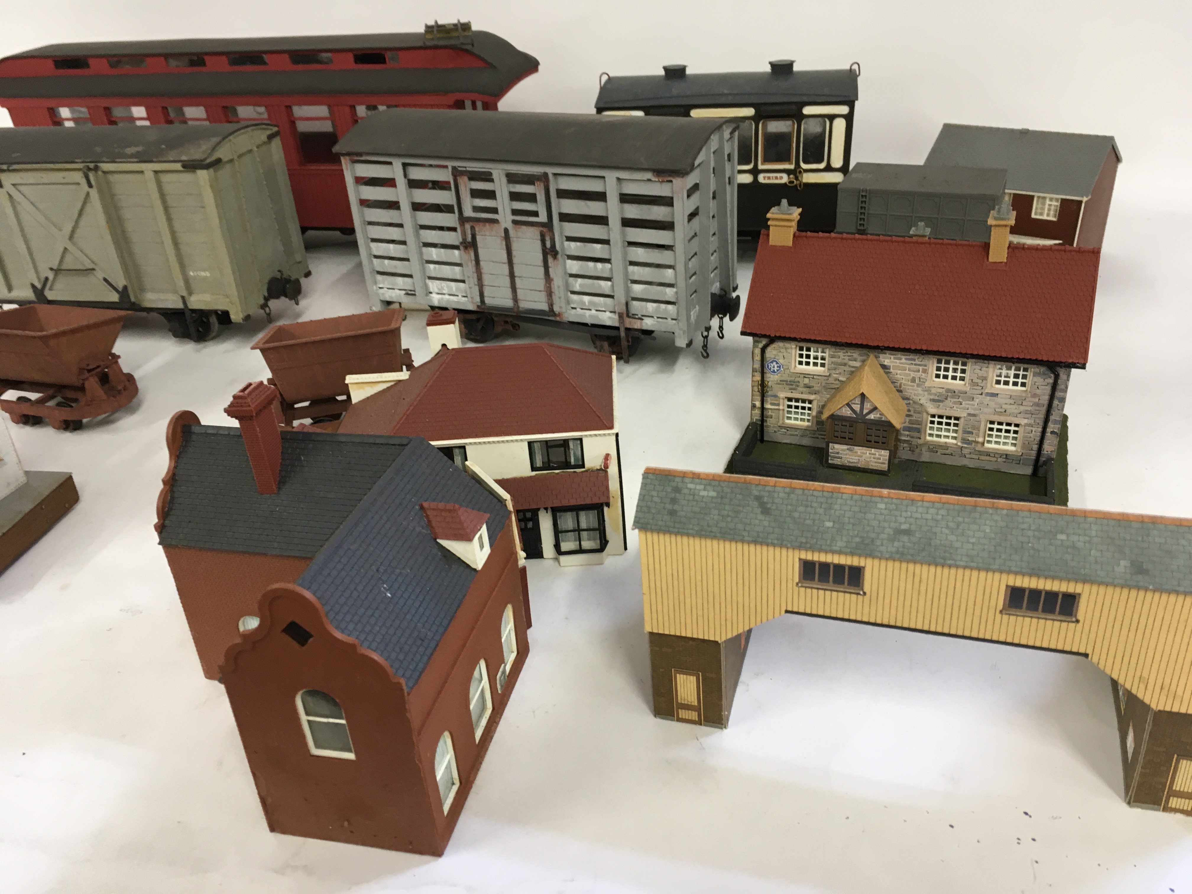 A collection of O gauge railway wagons and coaches plus a number of assembled and painted plastic buildings for scenery. No reserve.