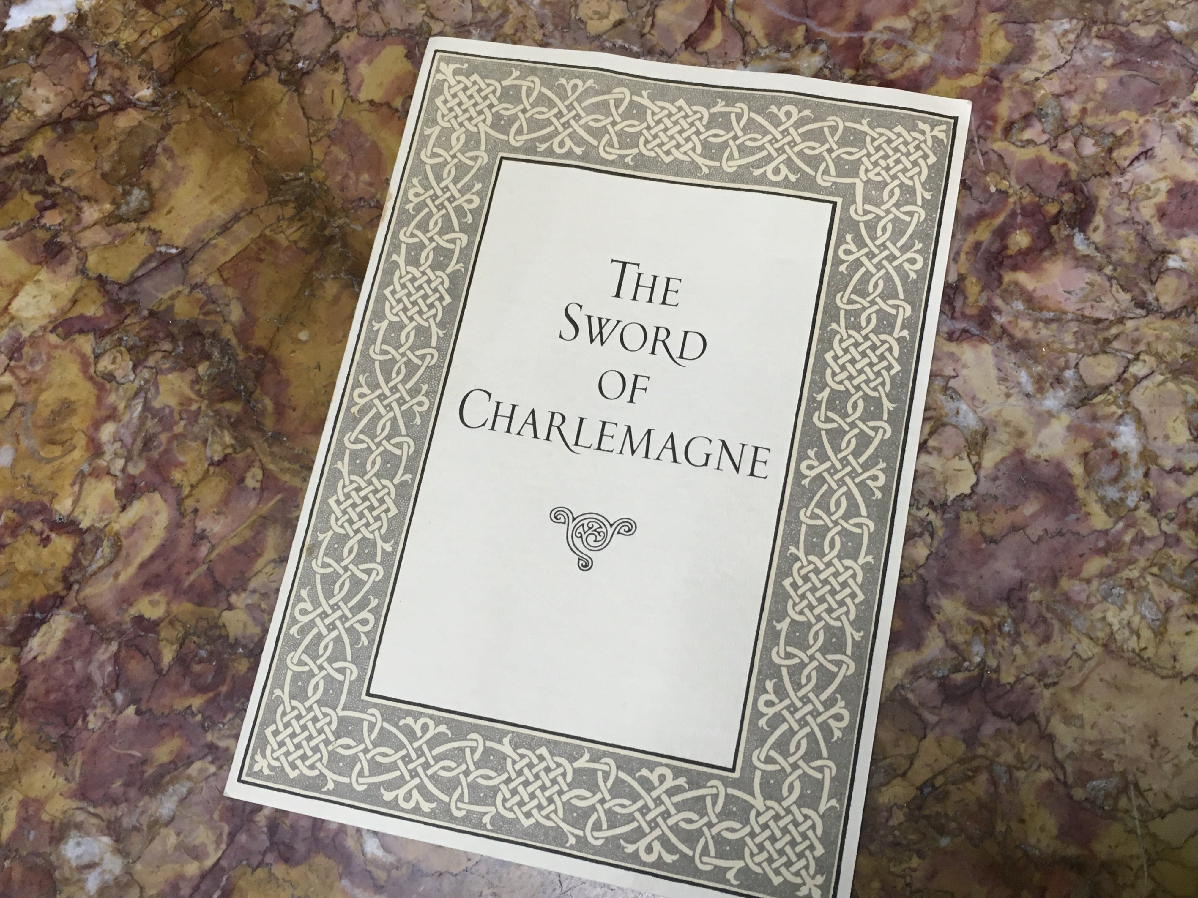A replica Sword of Charlemagne with a wooden display board. With Certificate of authenticity.Sword total length 98cm long. The original sword is a traditional coronation sword of France, once attributed to the great Emperor Charlemagne. This lot cannot be posted