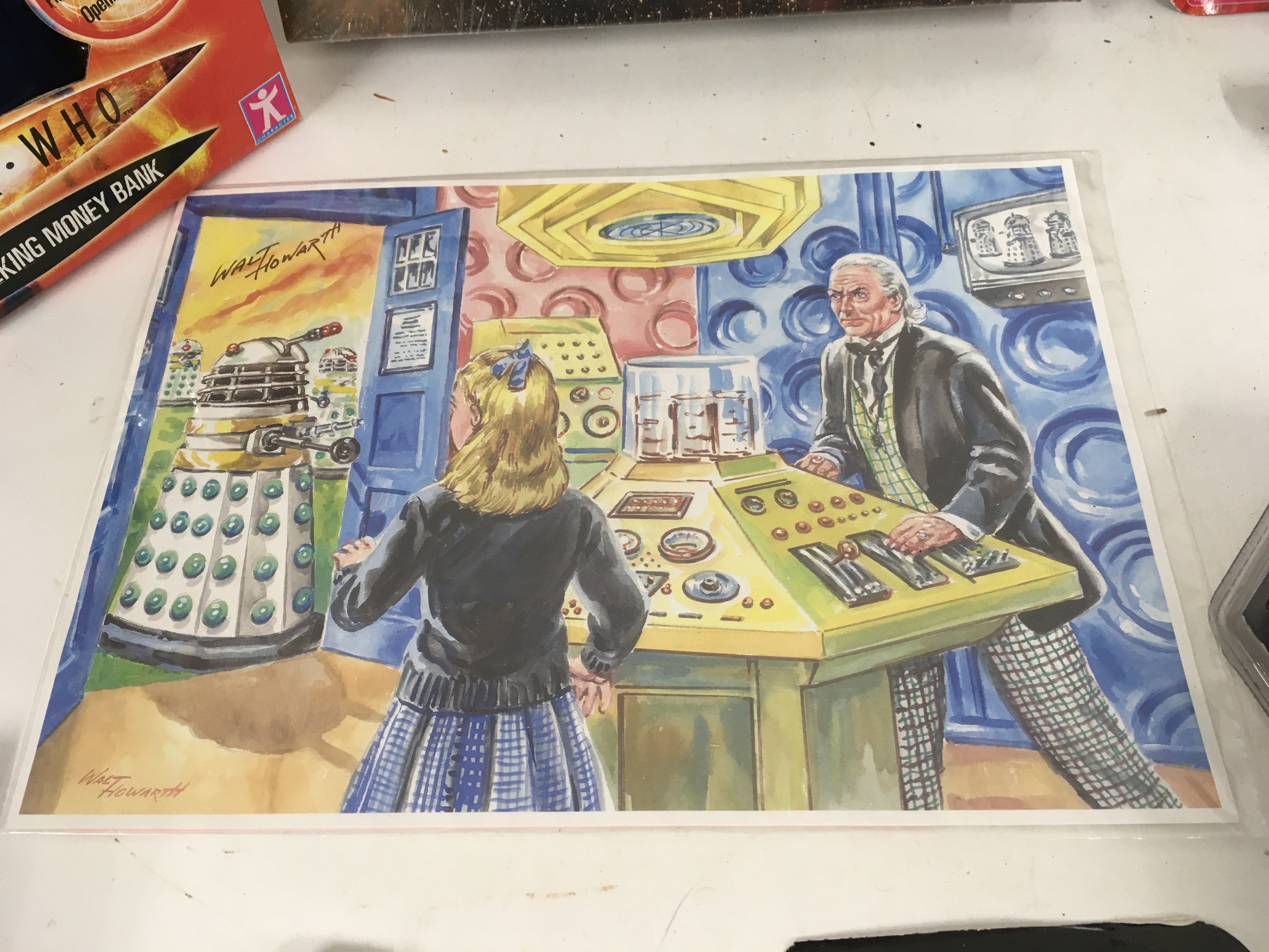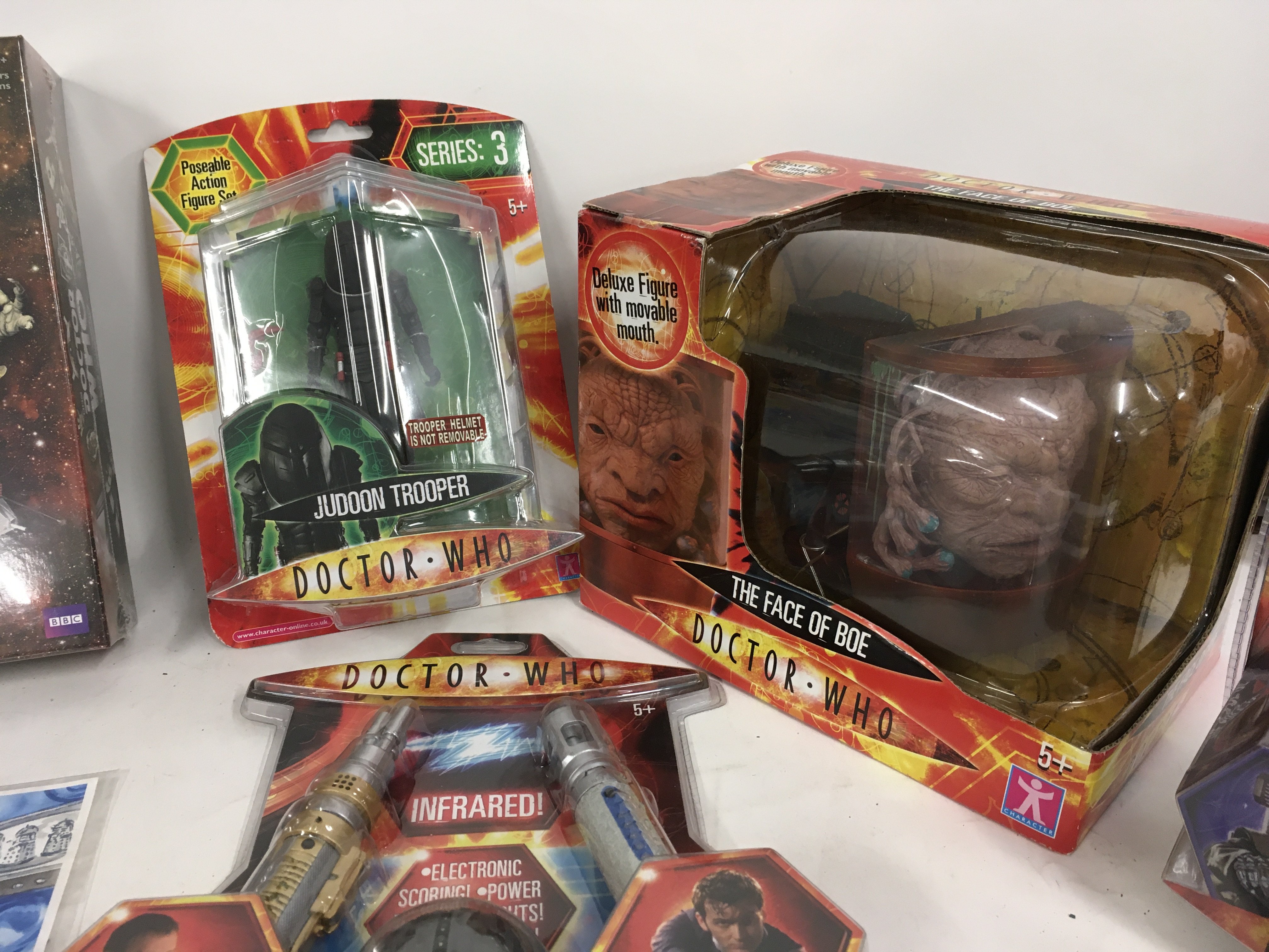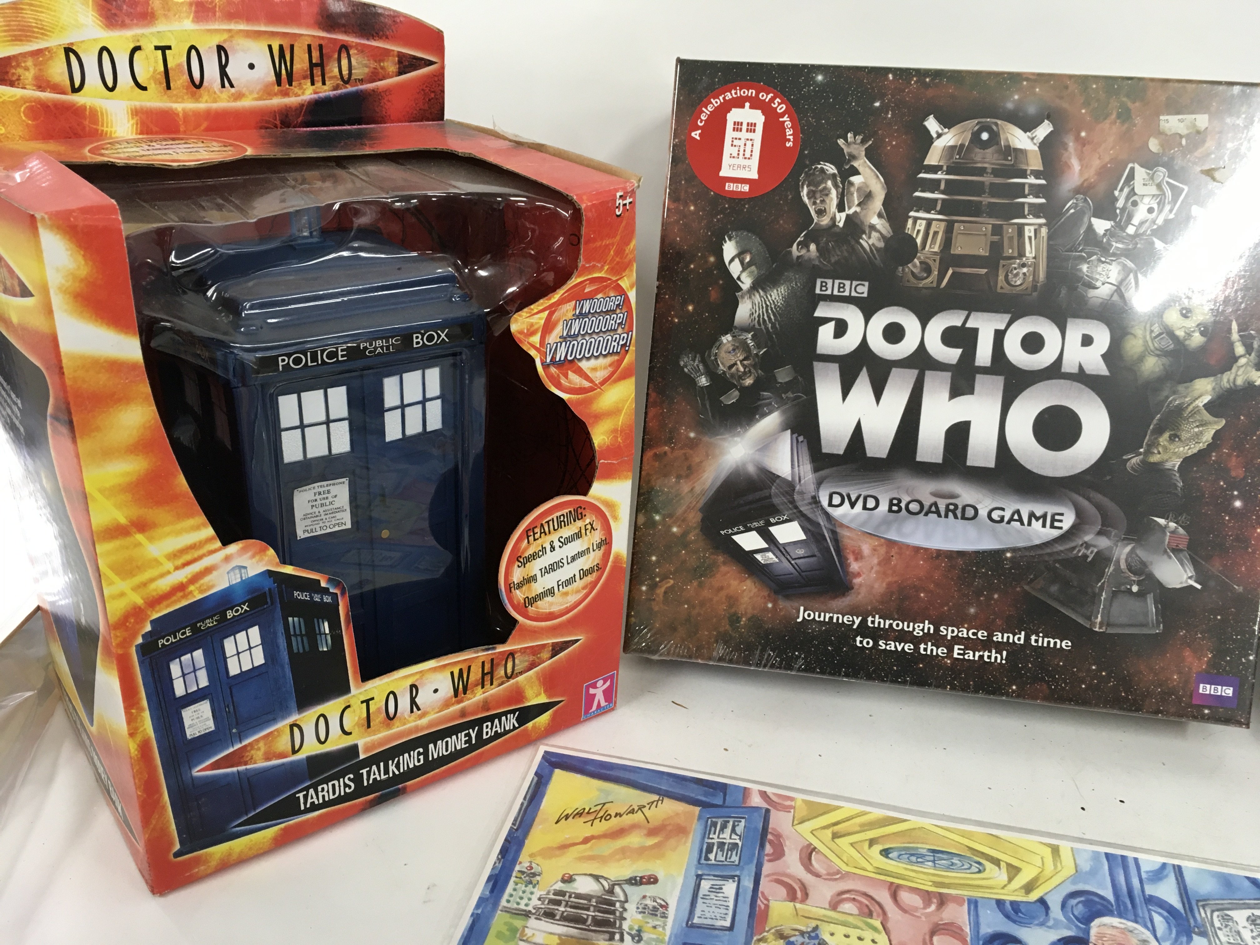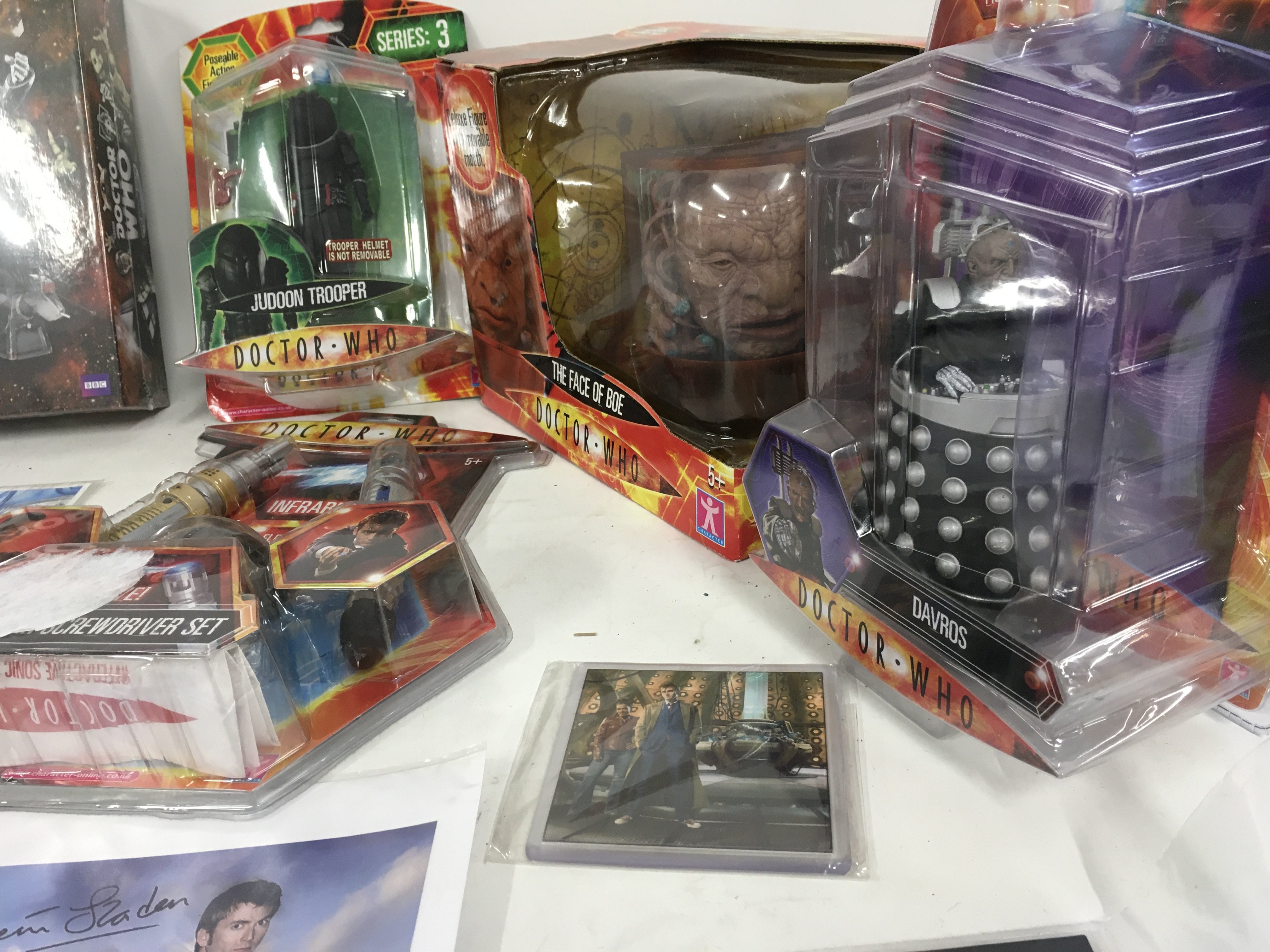 A collection of unopened boxed Dr Who Toys plus other items comprising Tardis Talking Moneybank. The Face of Boe with moveable mouth. Jadson Trooper. Davros. Sonic and Laser Screwdriver set..Dalek Medal..various Doctor stickers. Tardis Operators licence. Collectors edition 2015 calendar. First dat issue stamps The Poison Sky. Signed print featuring Dr who. Sarah Jane and K9. Art print featuring Doctor. Jane and Dalek in Tardis. Signed by Walt Howarth. COA