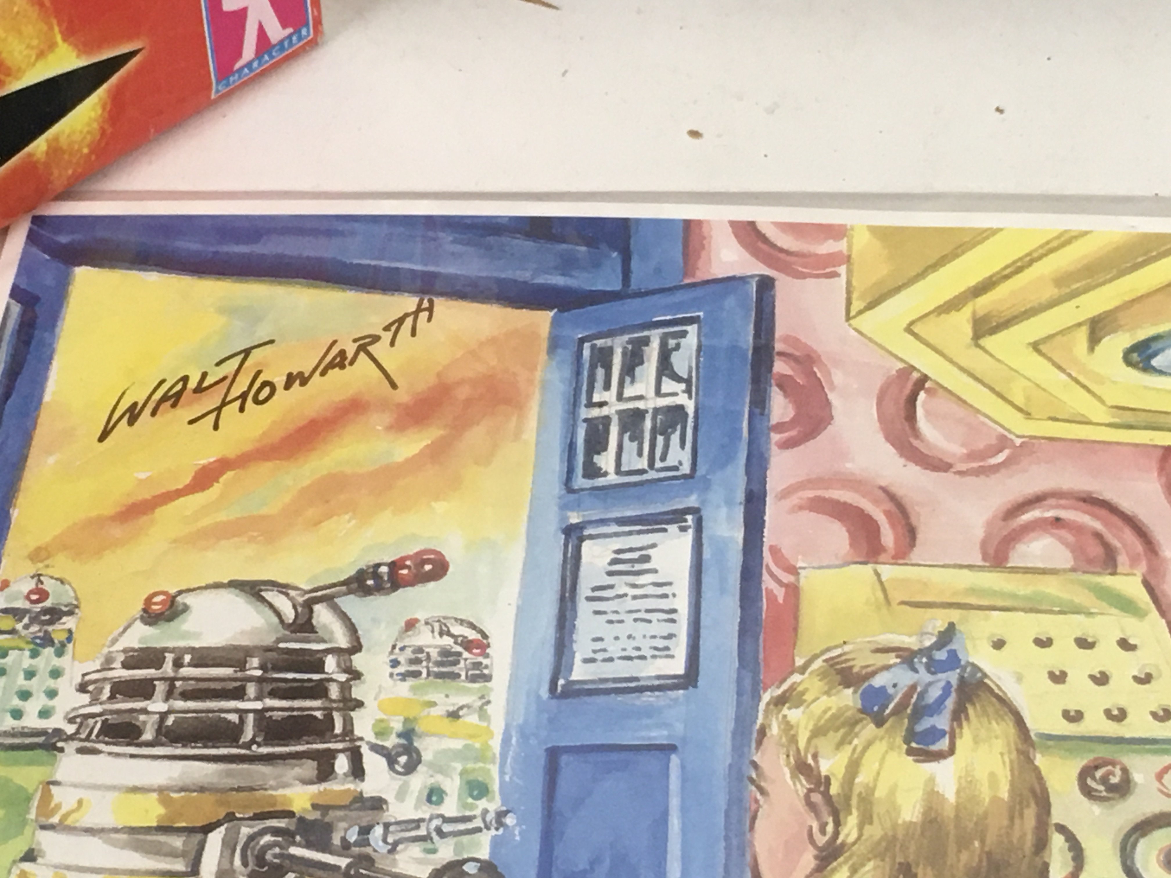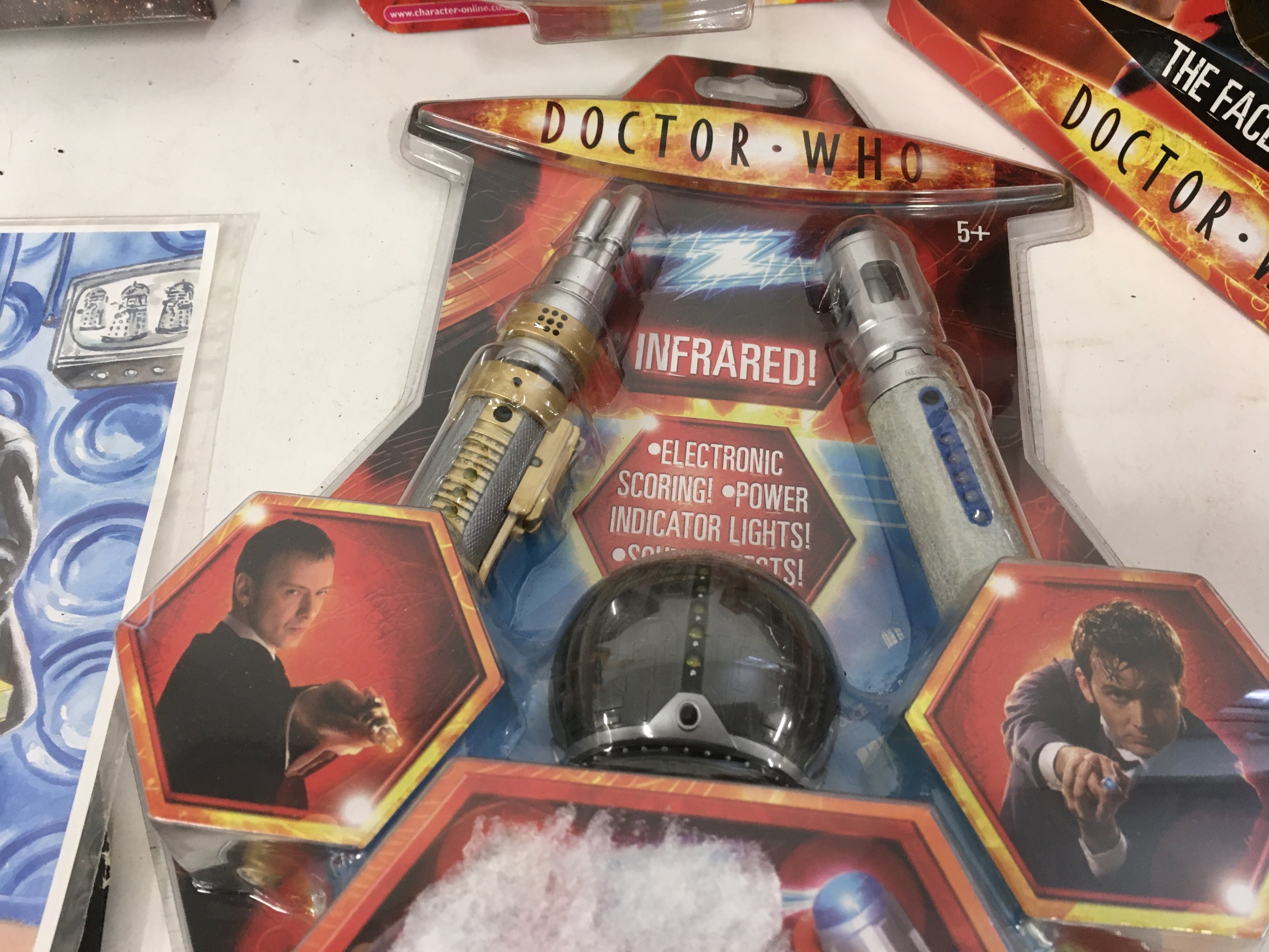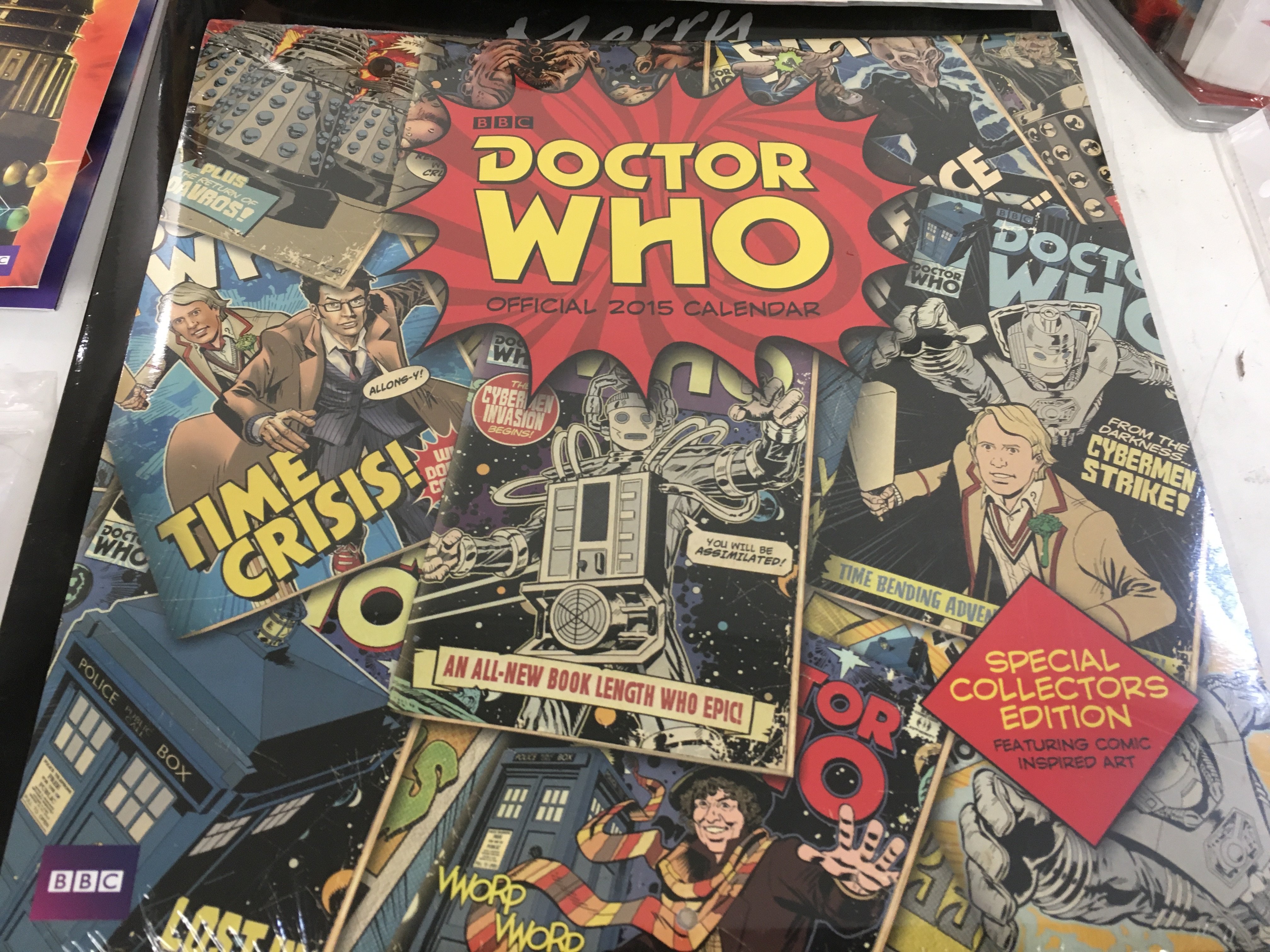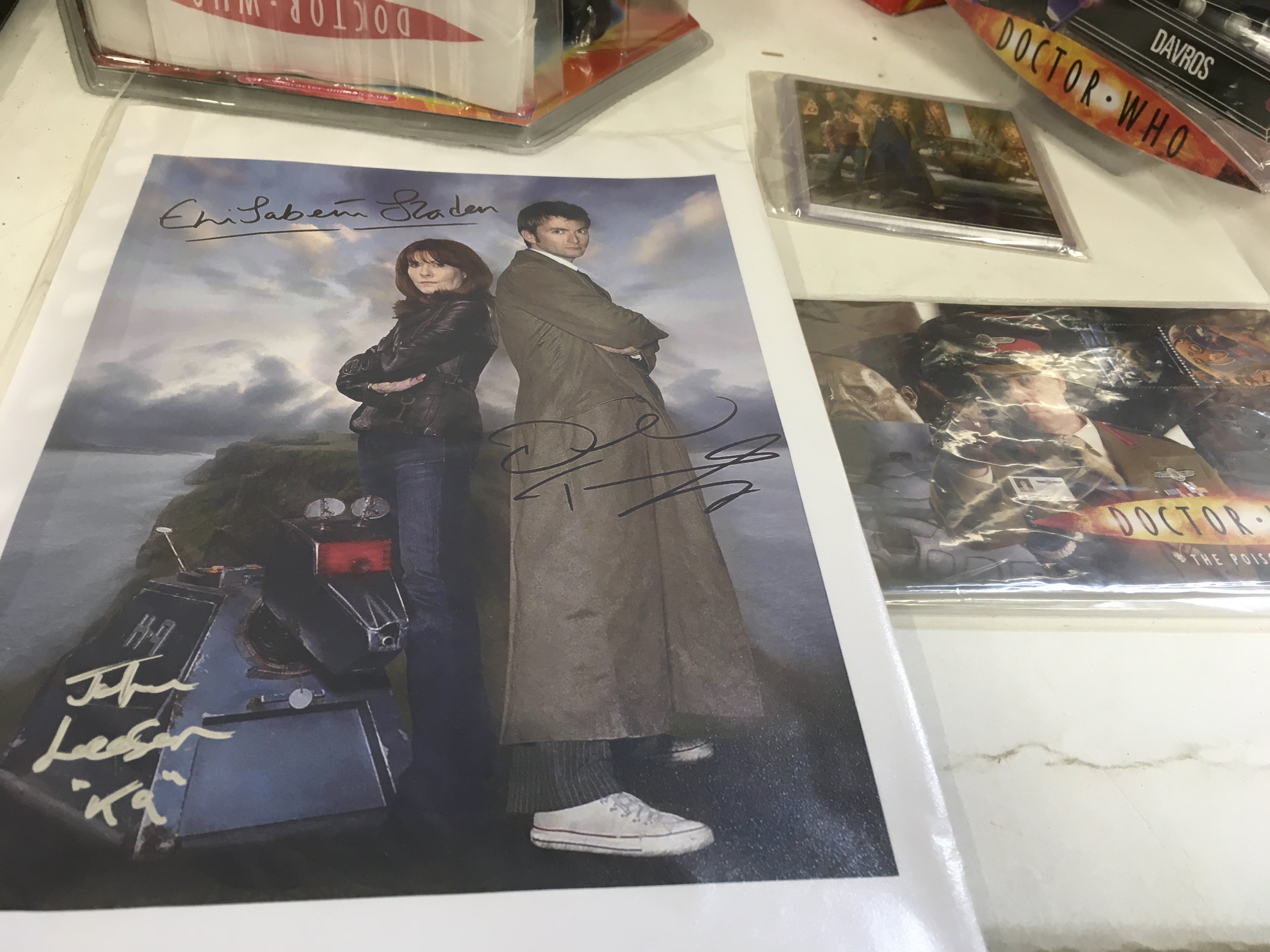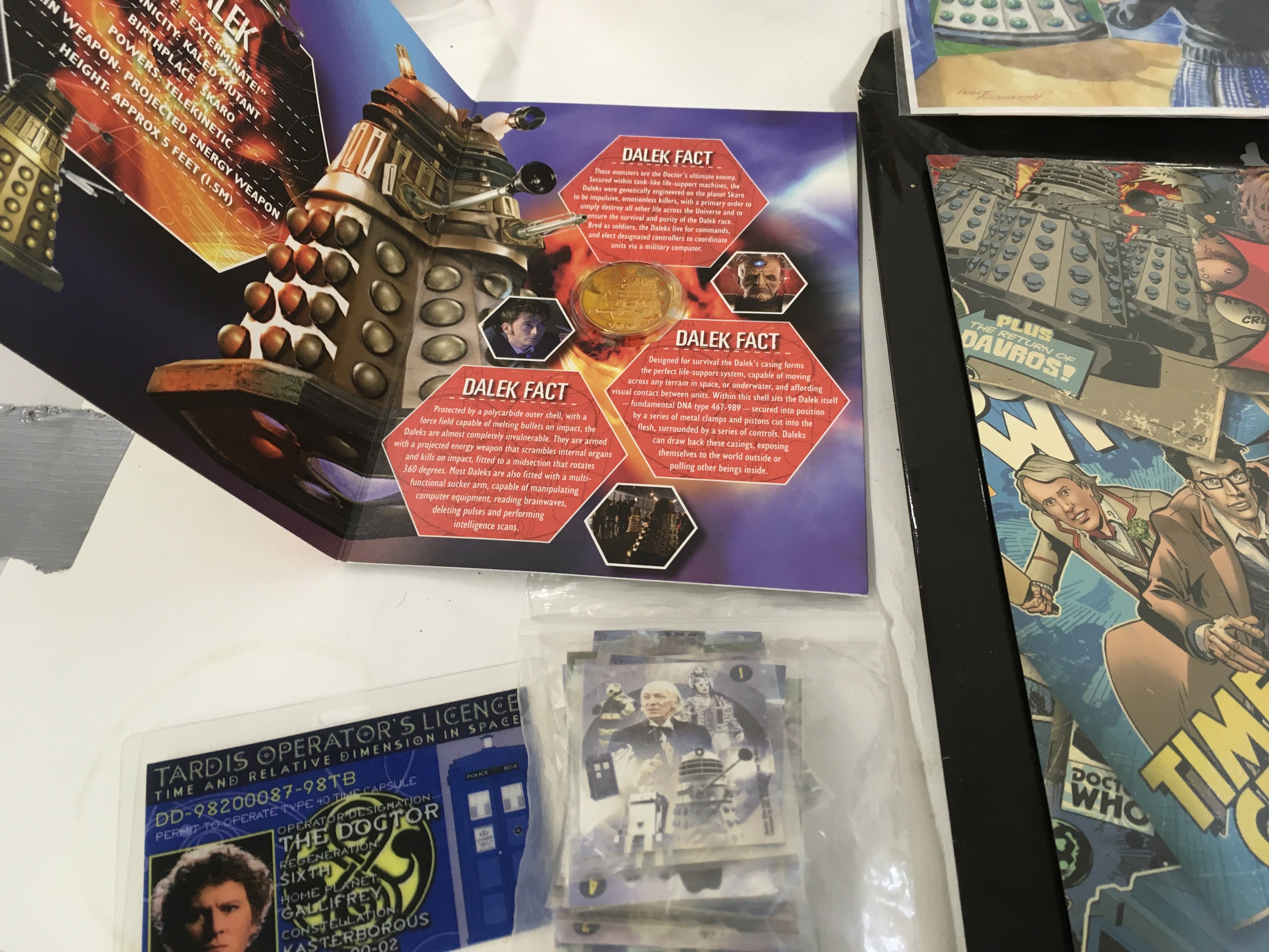 A collection of unopened boxed Dr Who Toys plus other items comprising Tardis Talking Moneybank. The Face of Boe with moveable mouth. Jadson Trooper. Davros. Sonic and Laser Screwdriver set..Dalek Medal..various Doctor stickers. Tardis Operators licence. Collectors edition 2015 calendar. First dat issue stamps The Poison Sky. Signed print featuring Dr who. Sarah Jane and K9. Art print featuring Doctor. Jane and Dalek in Tardis. Signed by Walt Howarth. COA
