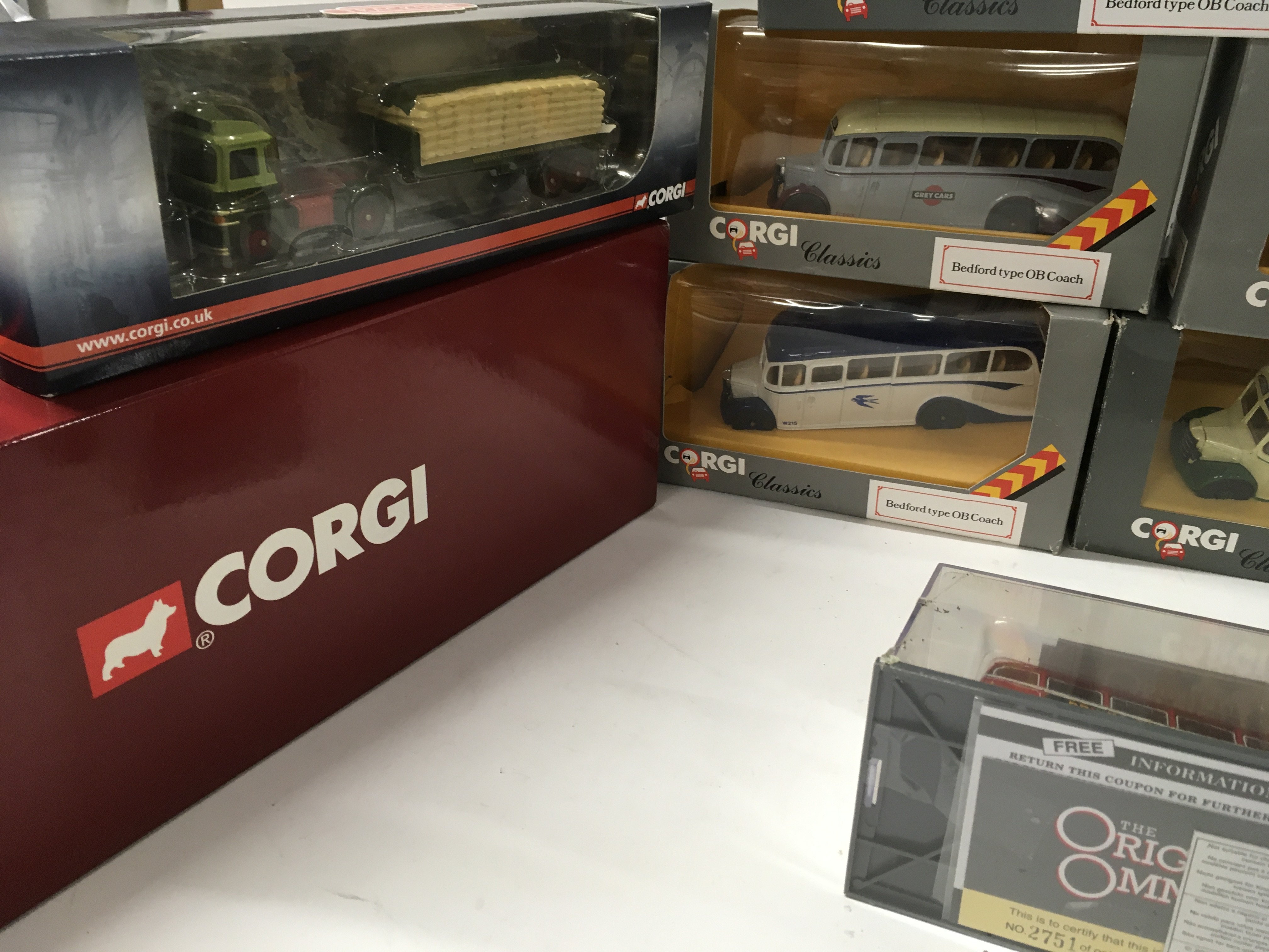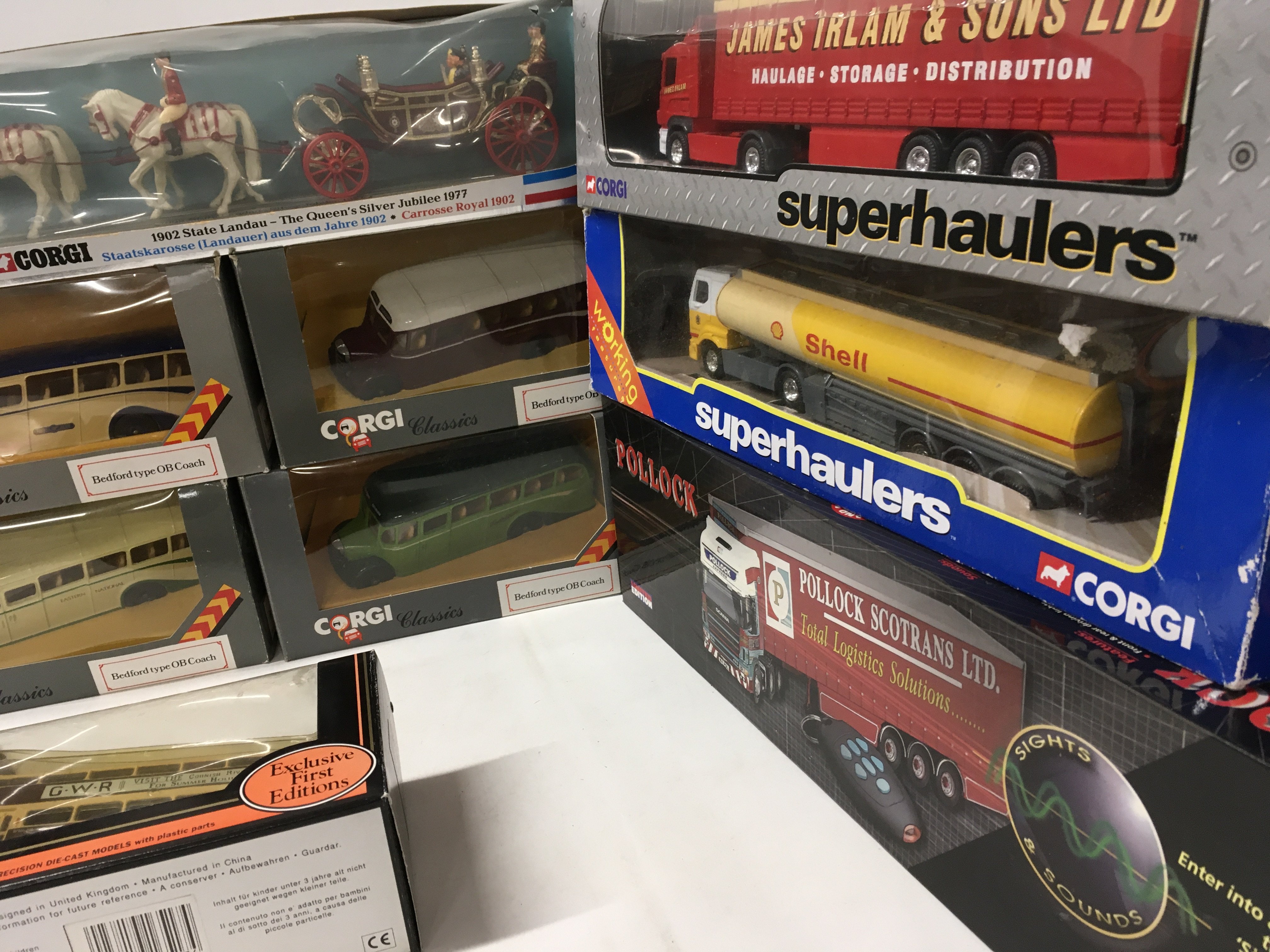 A collection in excess of 10 boxed model diecast vehicles mainly buses. Also includes plastic model of queens jubilee coach with horses. Mostly by Corgi..EFE. No reserve