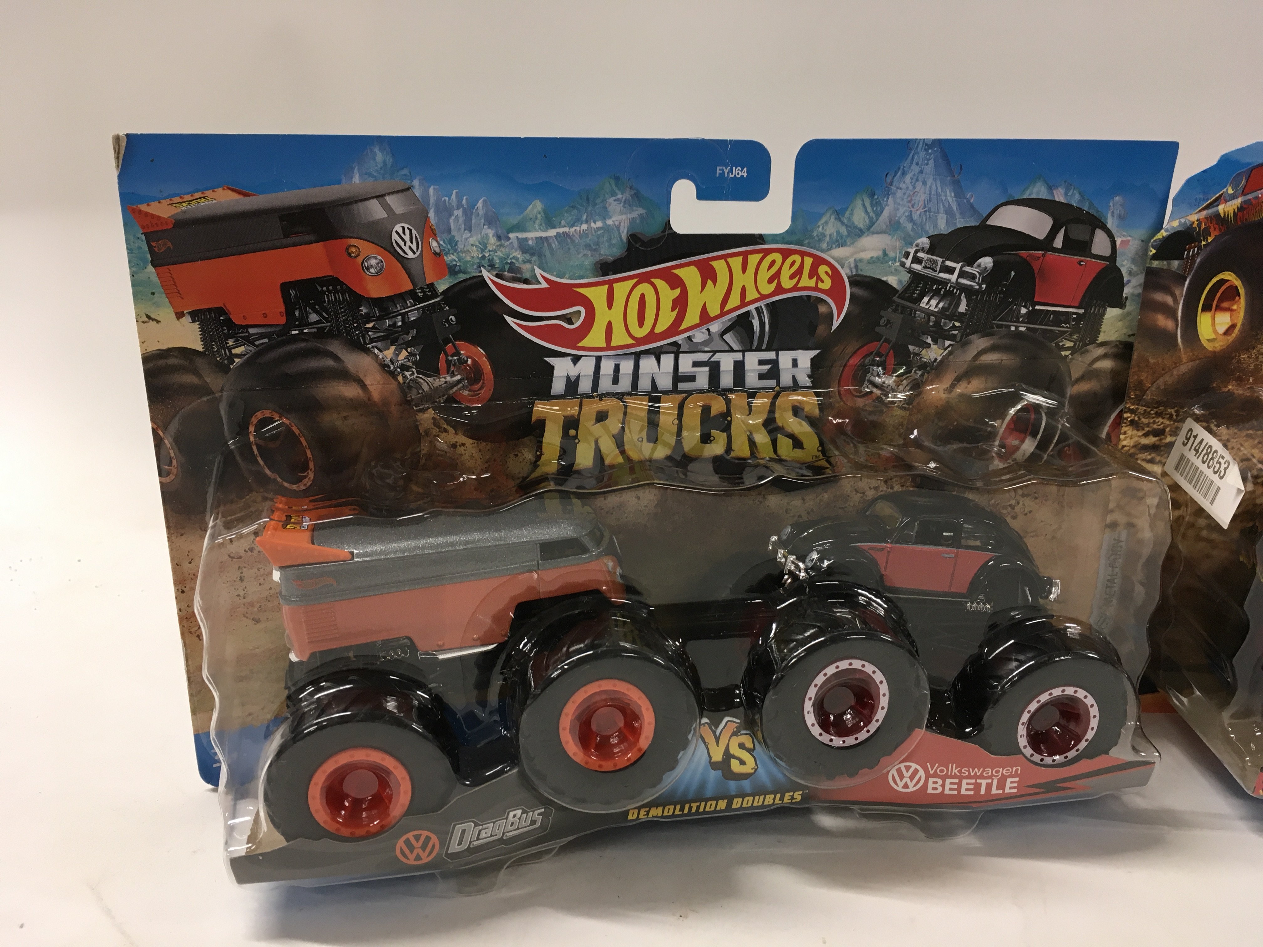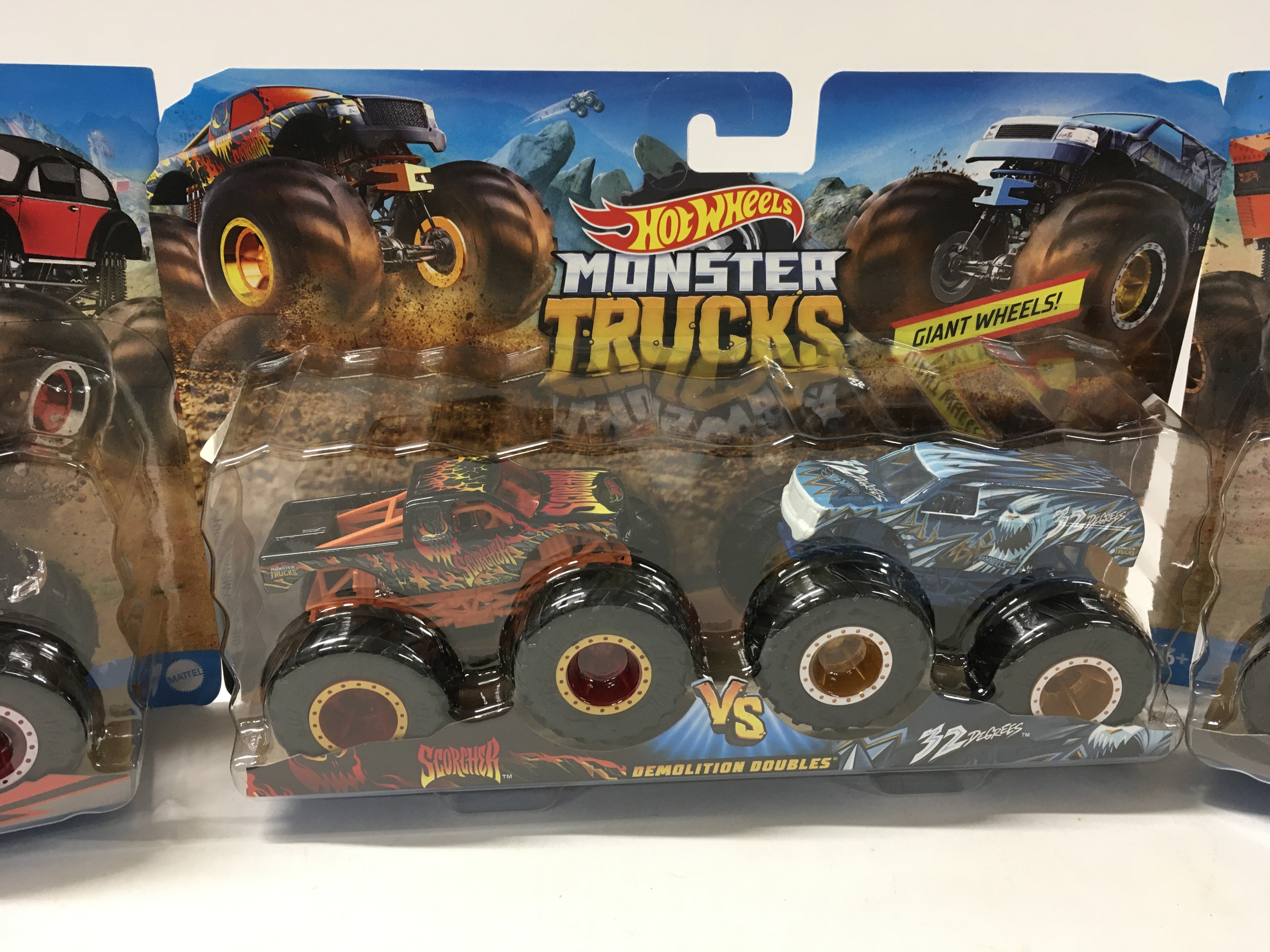 A collection of 6x unopened Hot Wheels Monster Trucks including 3x Demolition Doubles and 3x singles. 1:64 scale. No reserve
