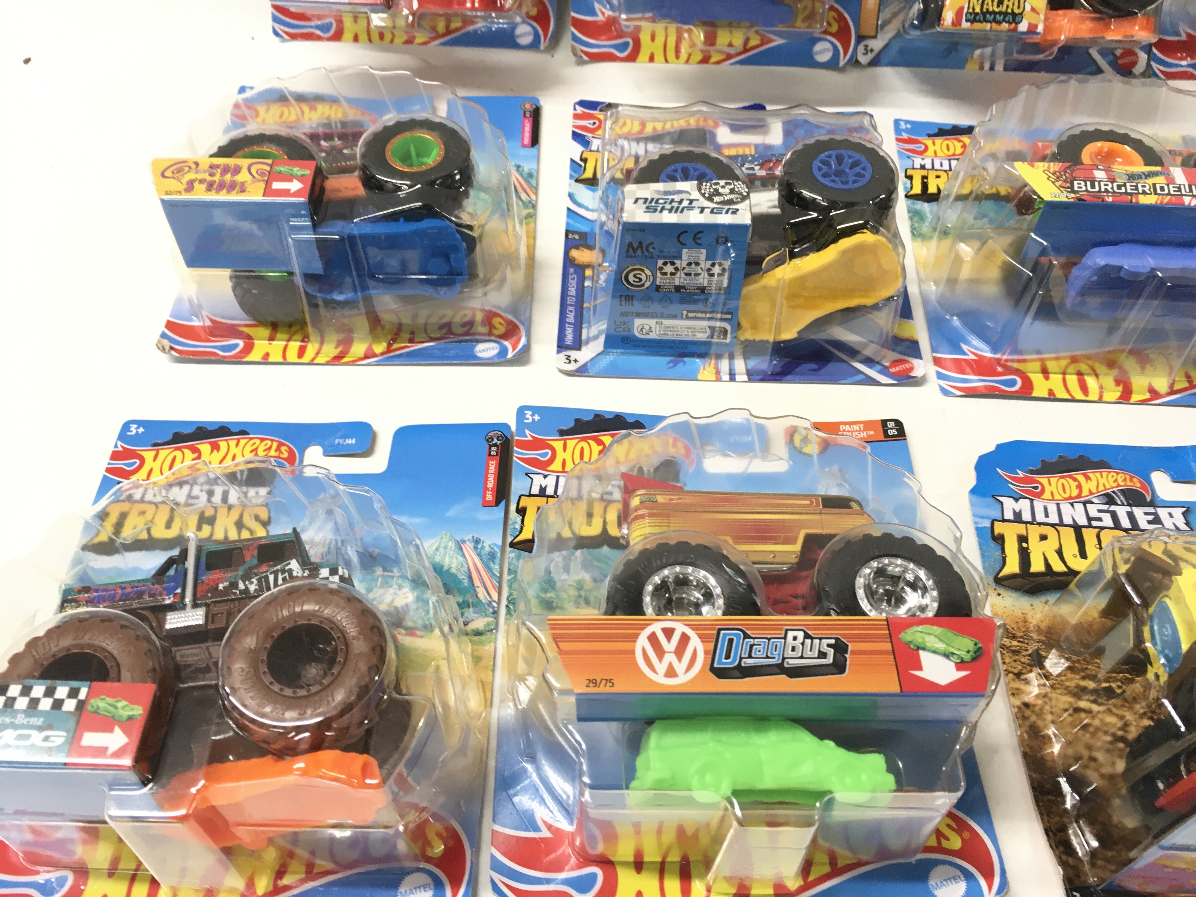 A collection of unopened Hot Wheels Monster Trucks 1:64 scale. Includes SpongeBob SquarePants..Super Mario Bowser plus others. No reserve