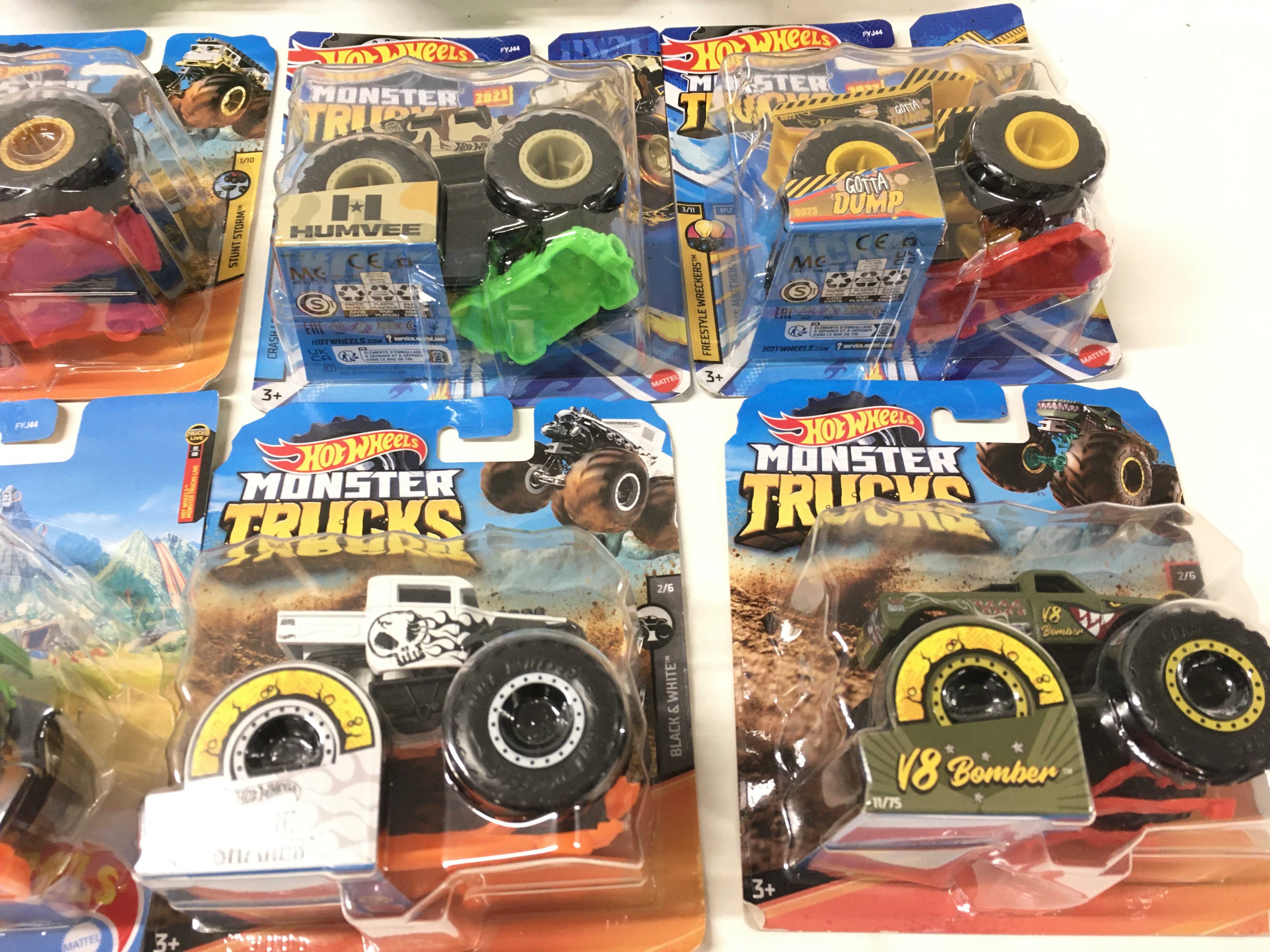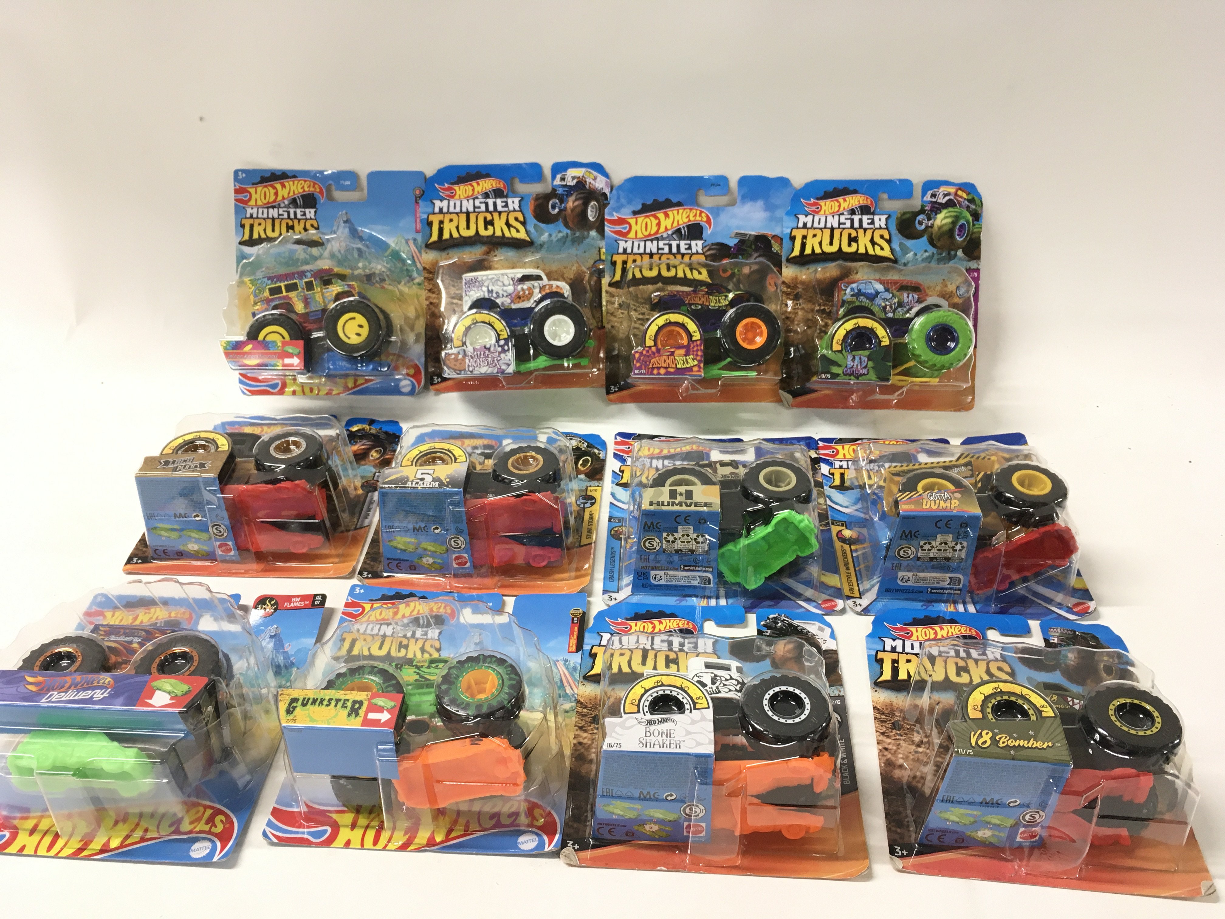 A collection of 12 unopened Hot Wheels Monster Trucks 1:64 scale. Includes Bone Shaker ..Milk Monster plus others. No reserve