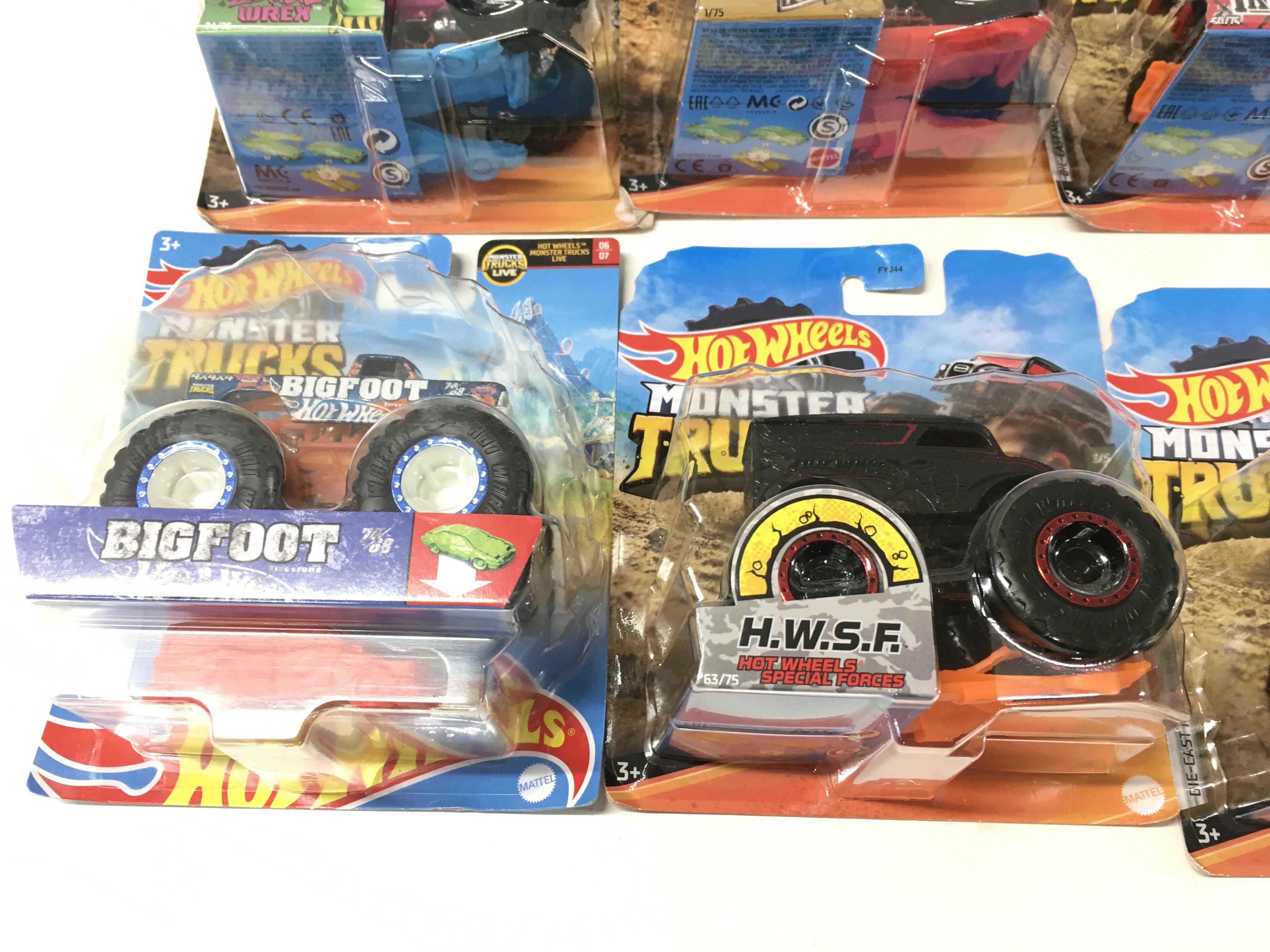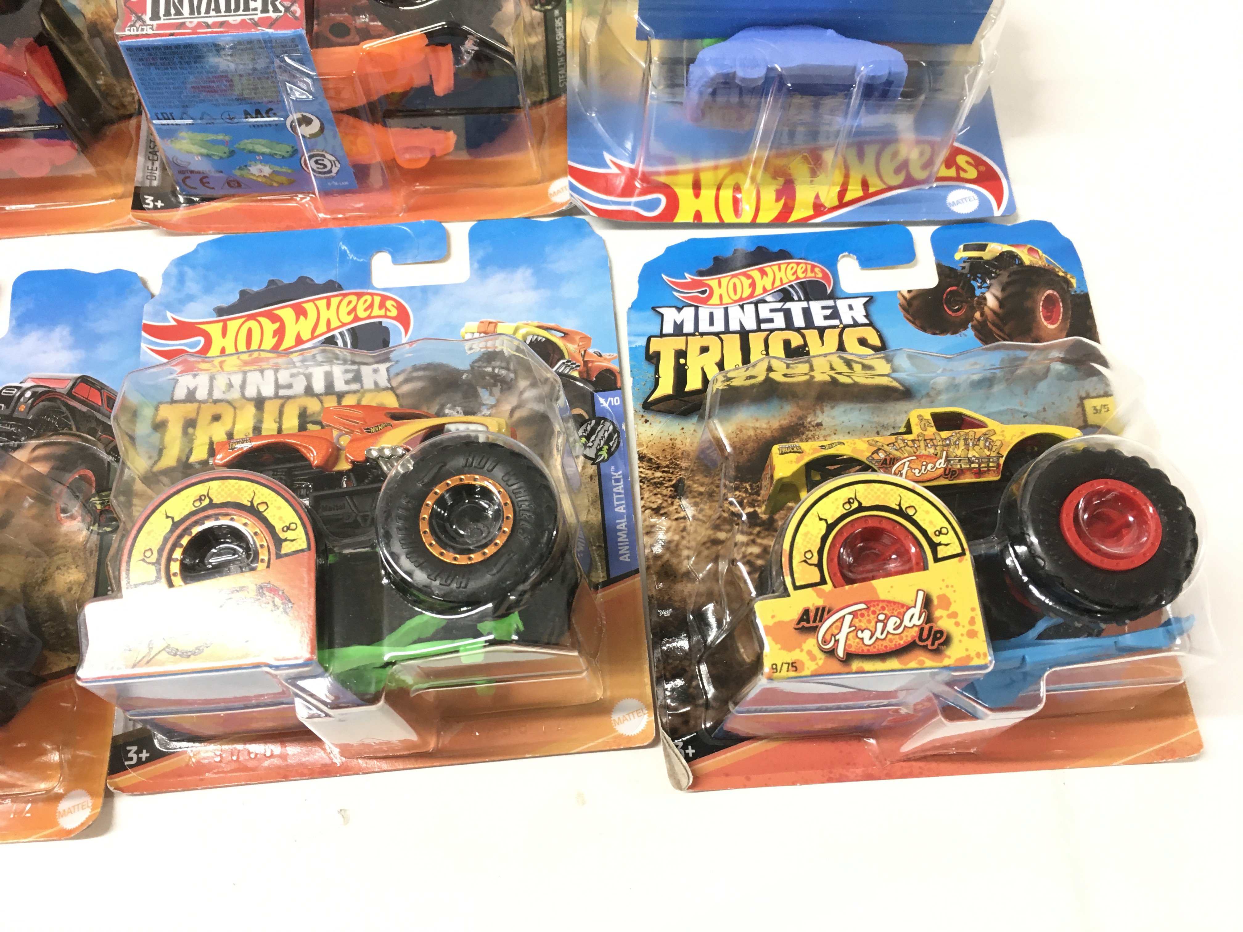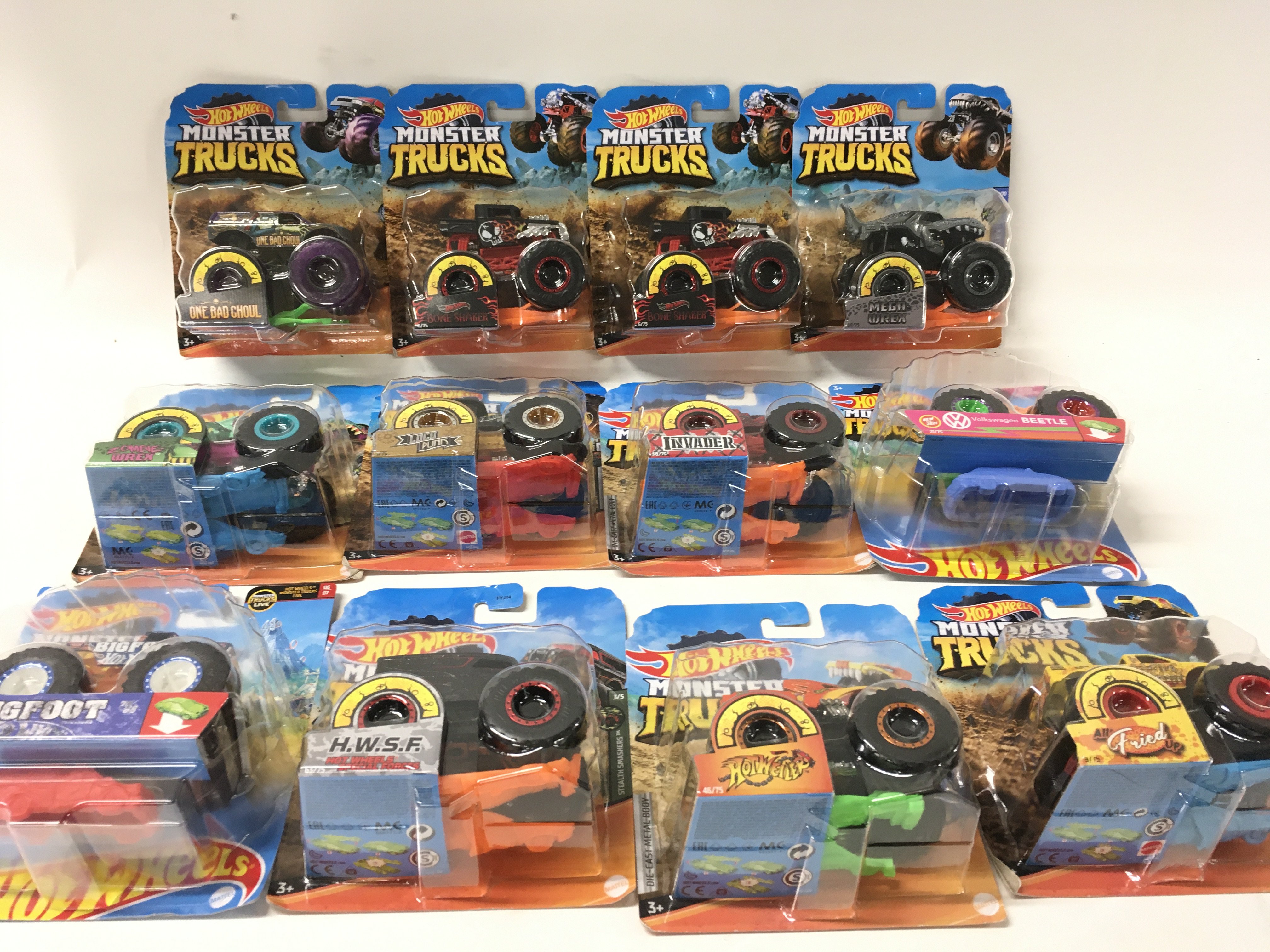 A collection of 12 Hot Wheels Monster Trucks 1:64 scale. Includes All Fried Up..Zombie Wrex..plus others. No reserve