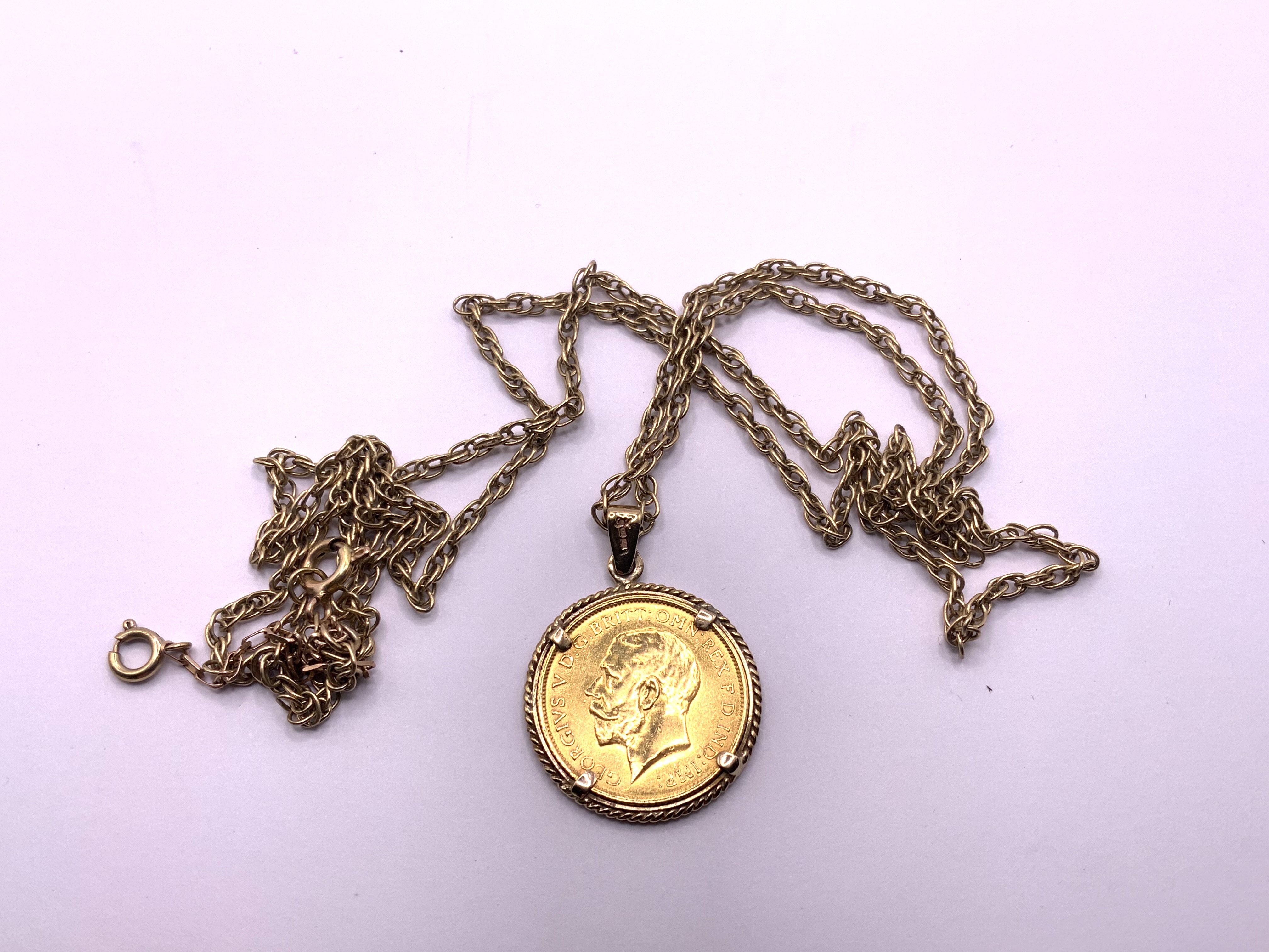 1915 Sydney mint half sovereign with 9ct gold coin mount and chain. 12.15gs (A)