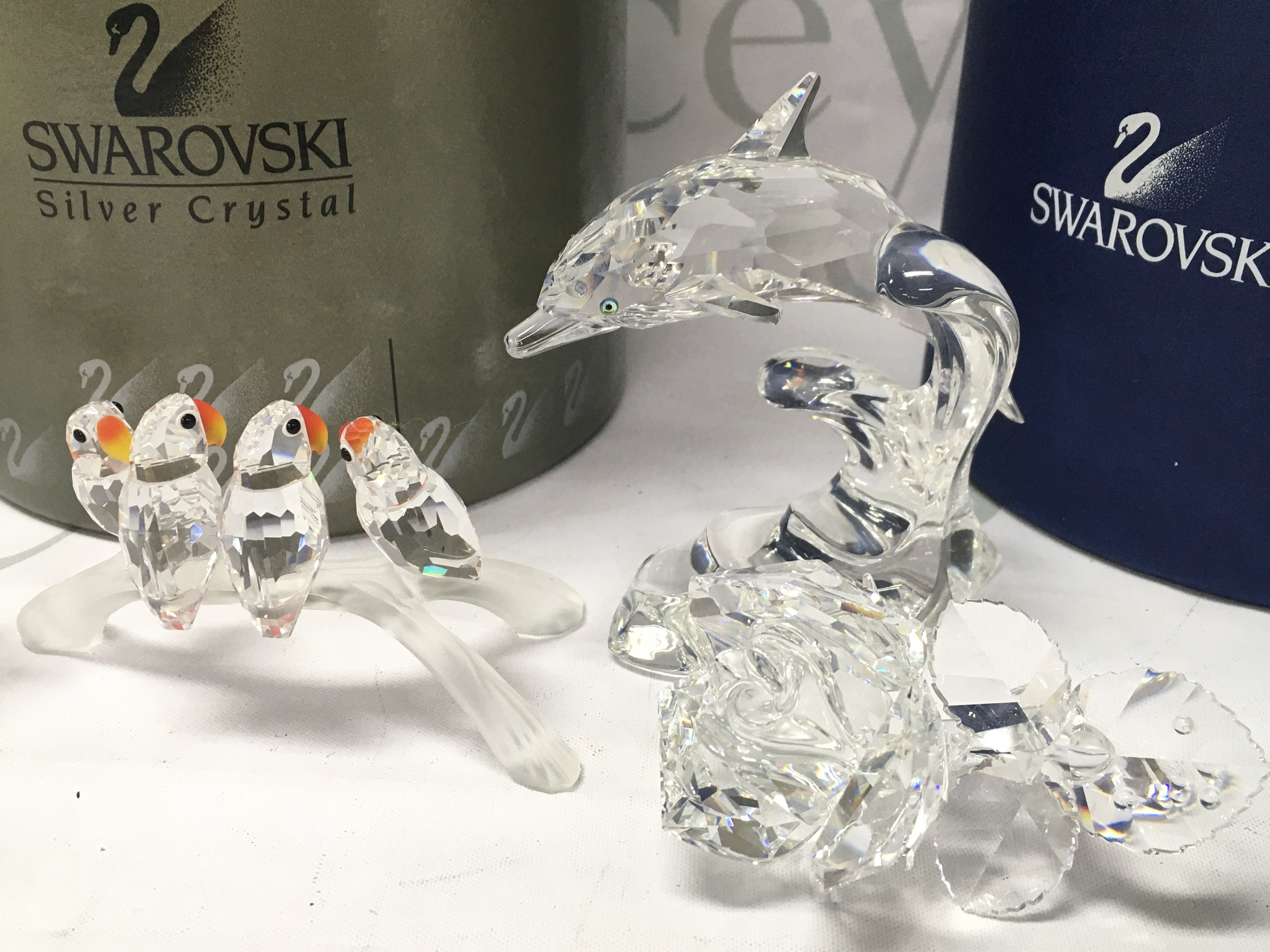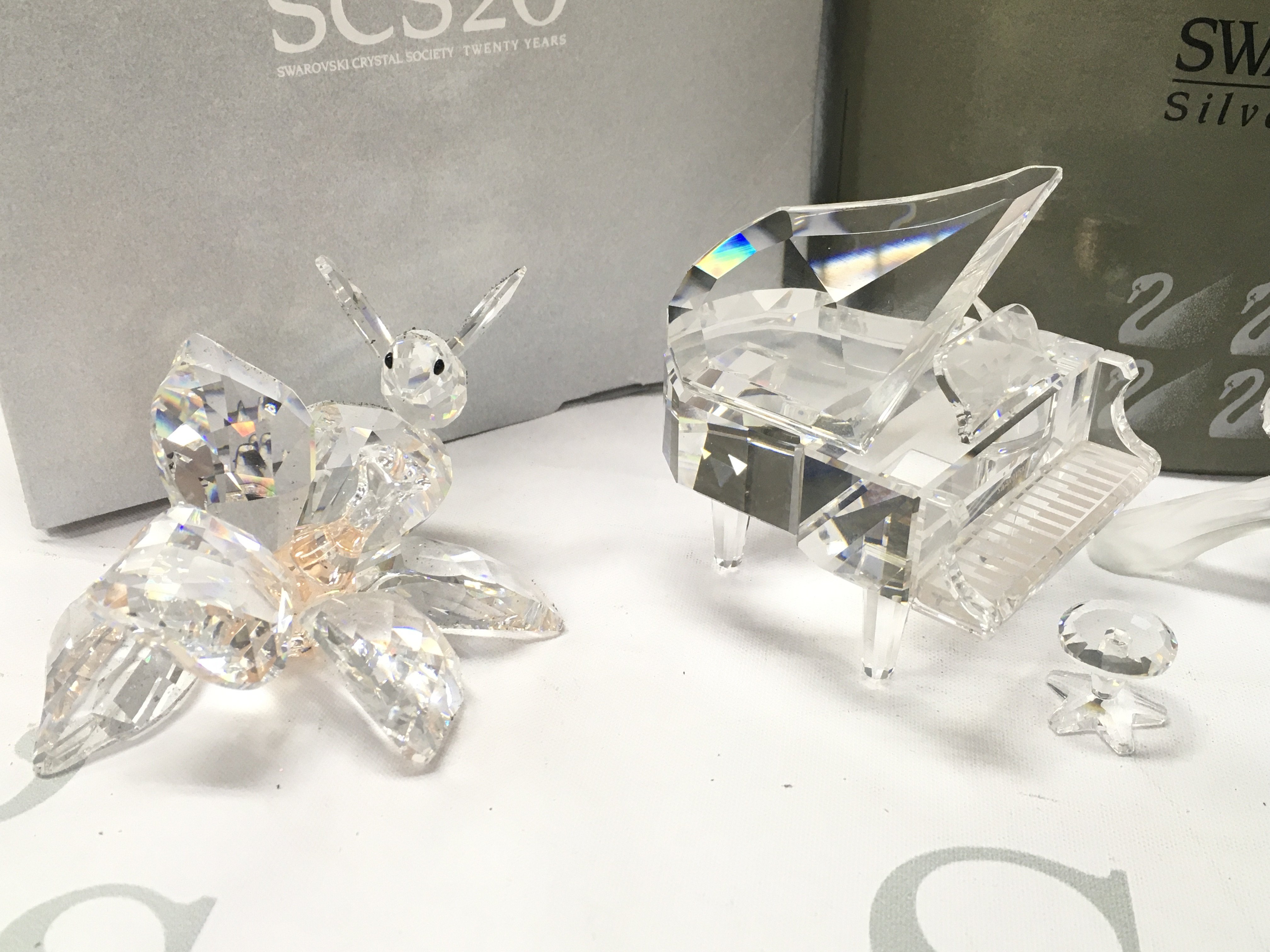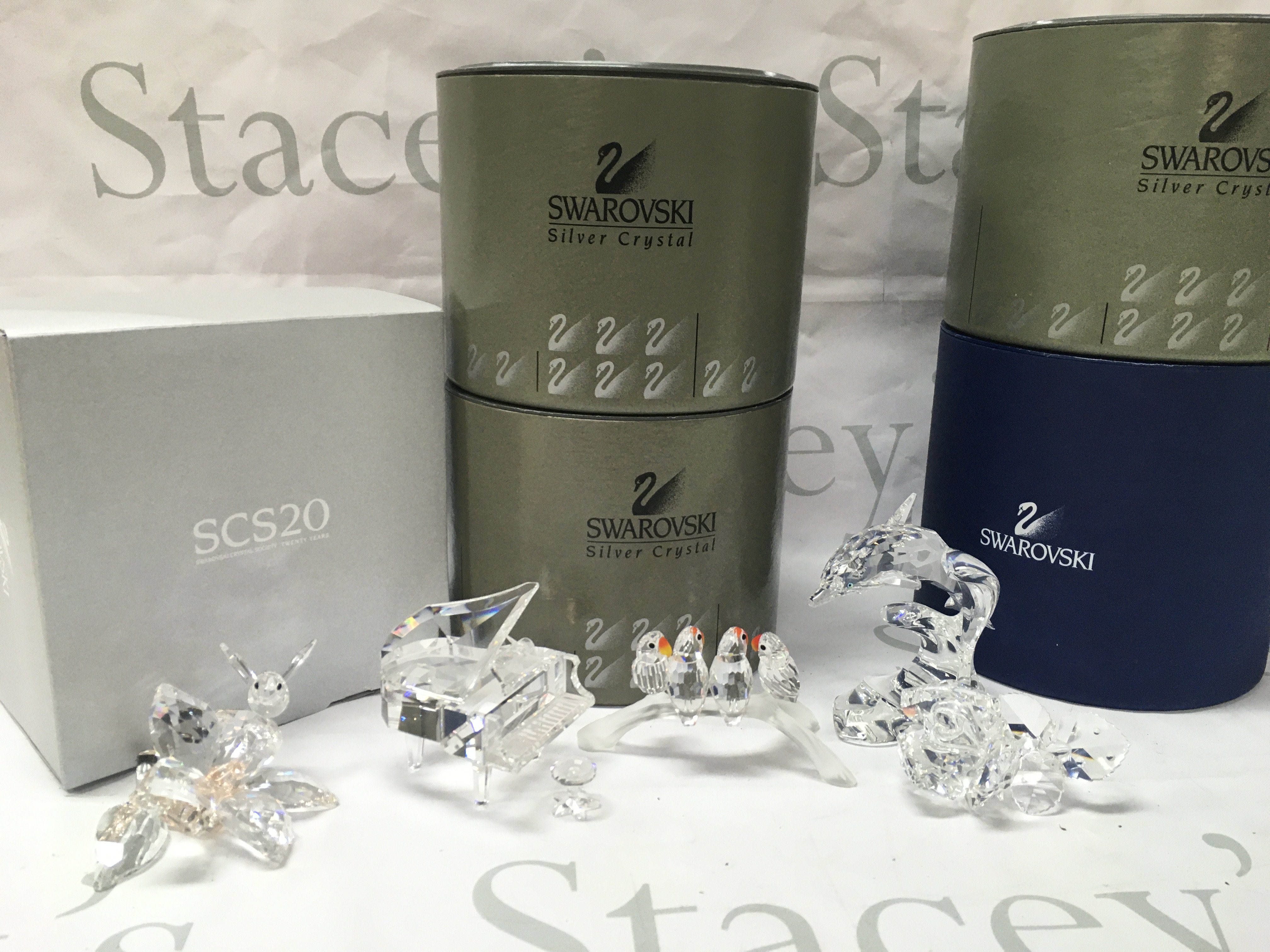 Boxed Swarovski figures including a Dolphin, rose, Bee, Lovebirds, Piano. Postage category C