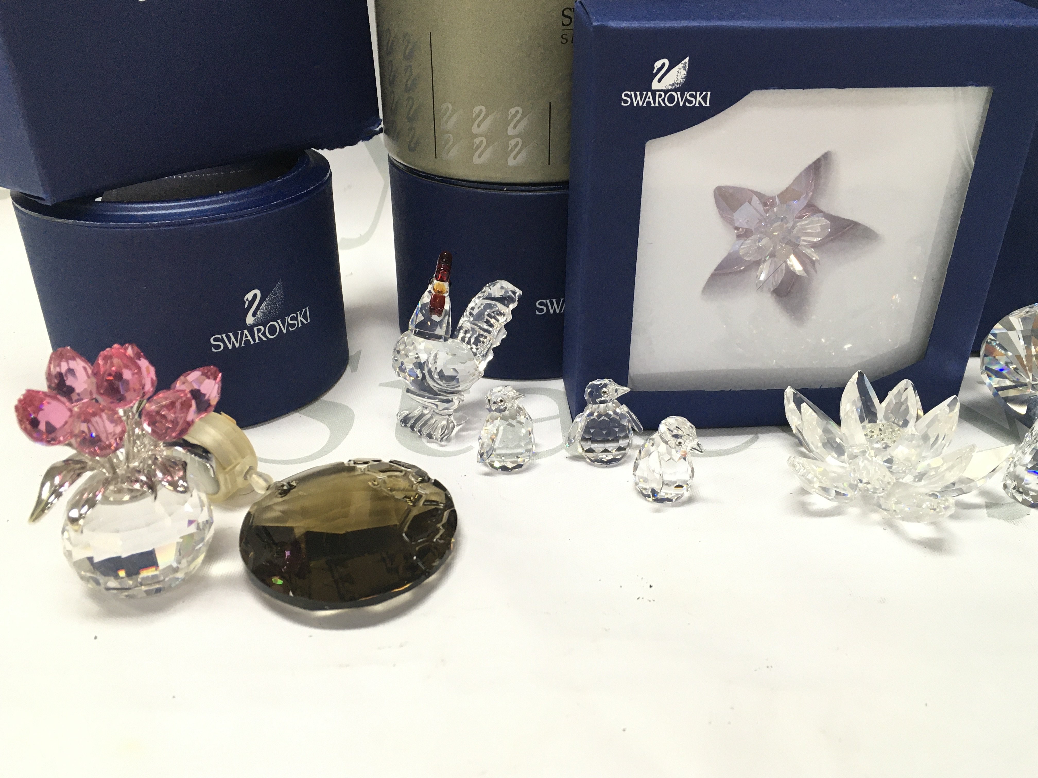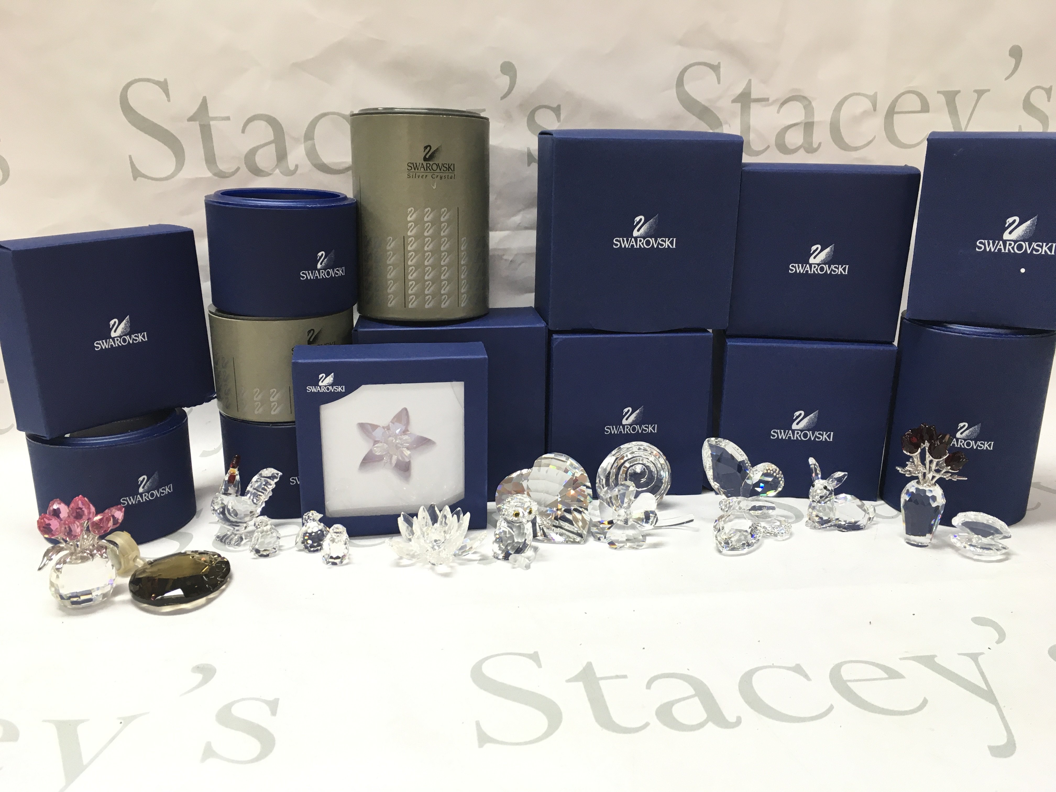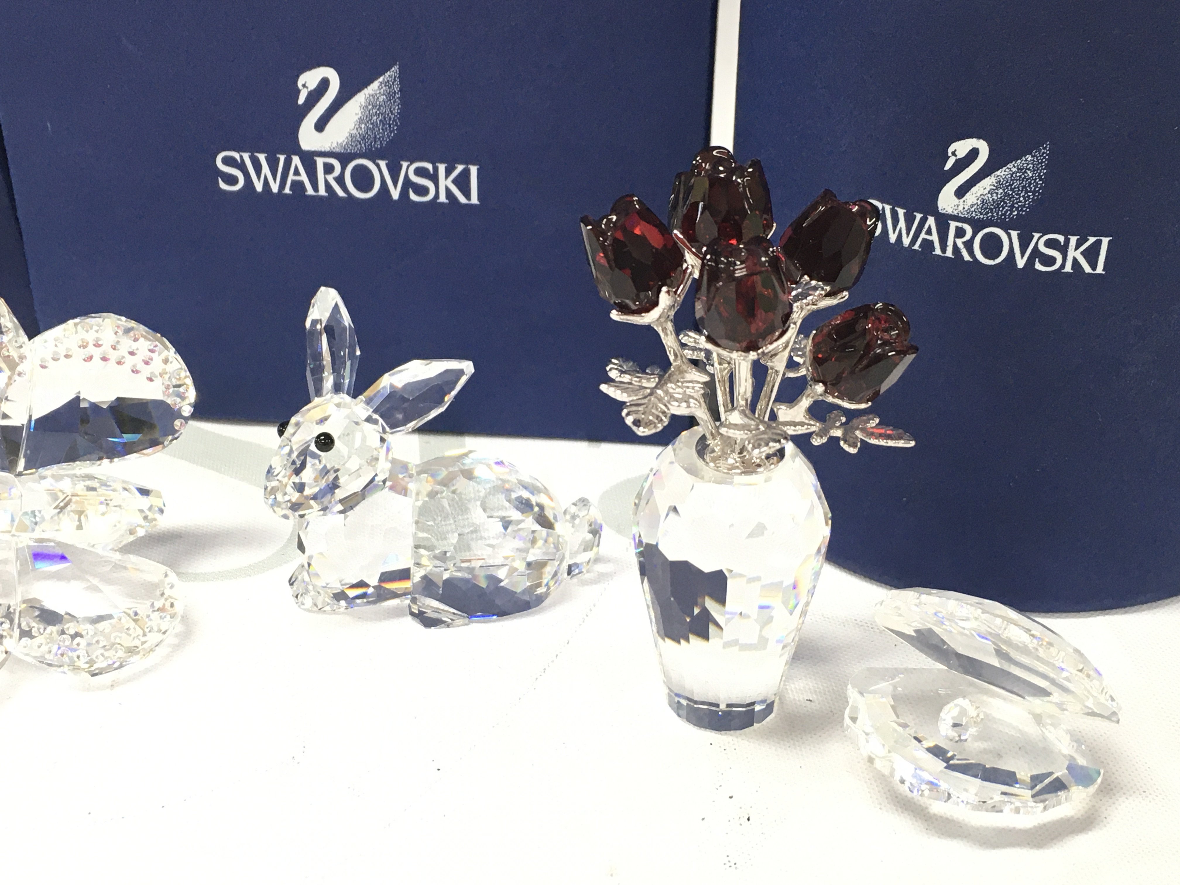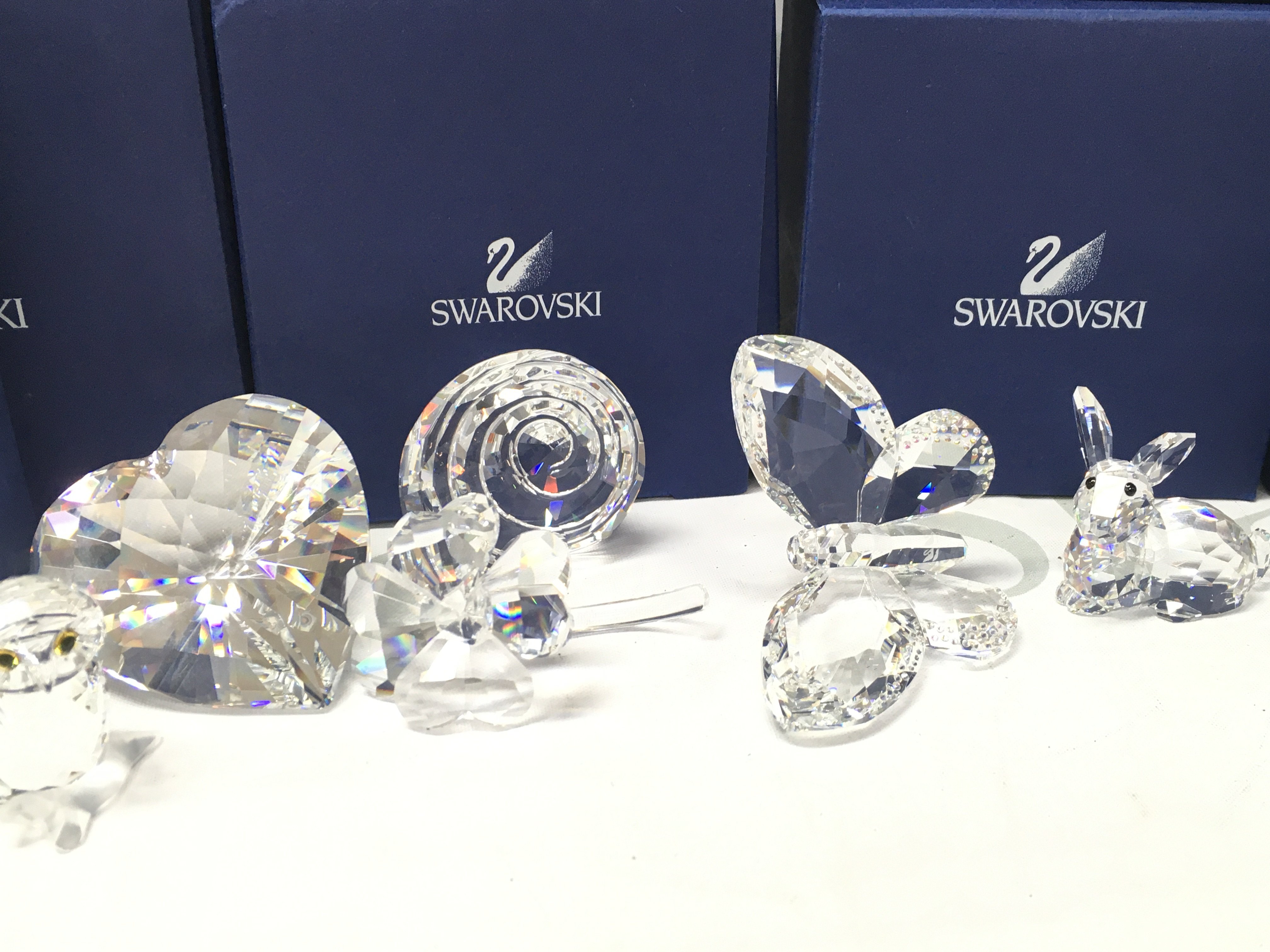 A collection of boxed Swarovski crystal glass figures including butterfly, vase of roses, rabbit, owl, heart etc. postage category C