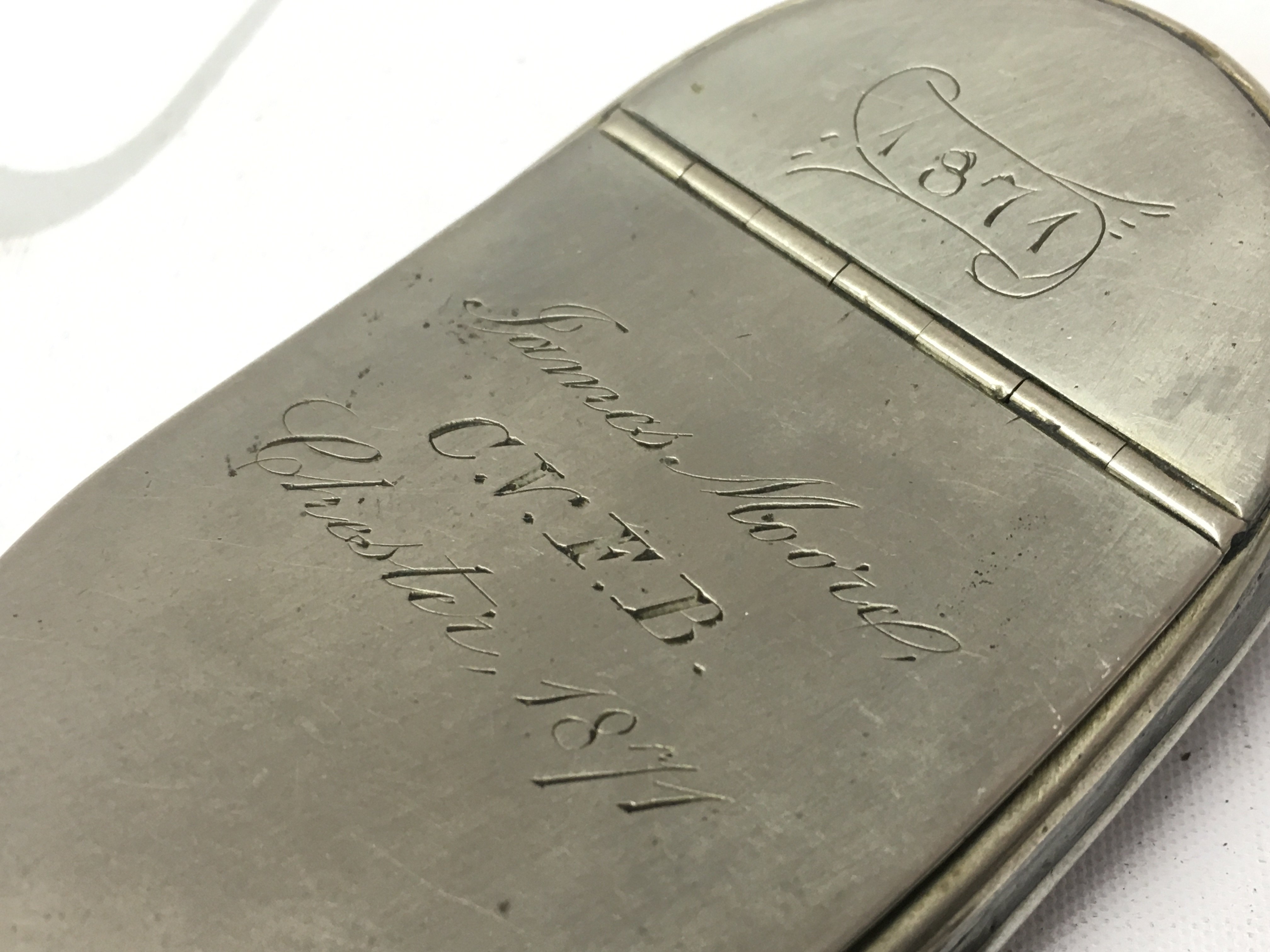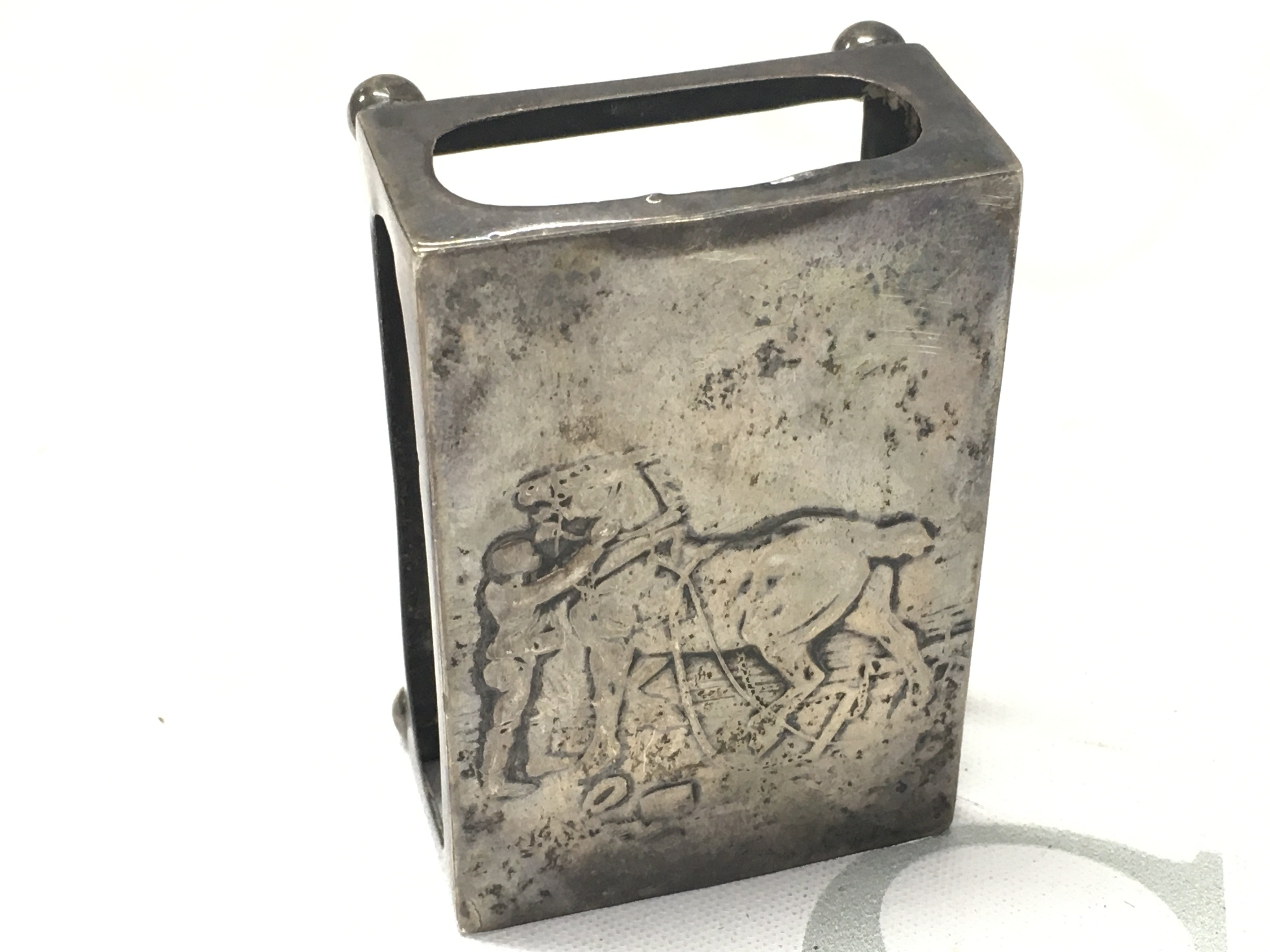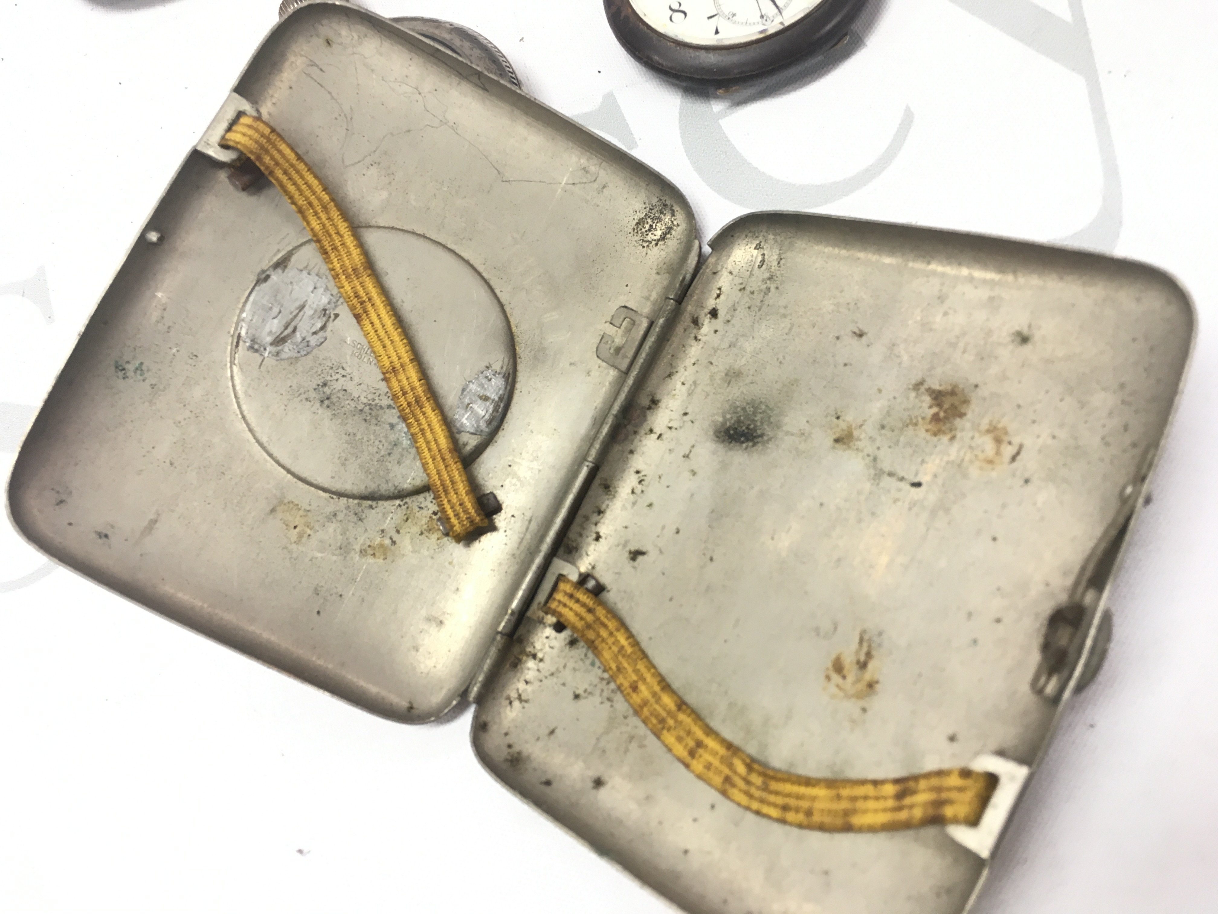 A WW1 British Light Division cigarette case, a late Victorian Snuff box marked 1871 , silver hallmarked horse design matchbox holder, silver match box holder, silver cased pocket watch . Postage category B