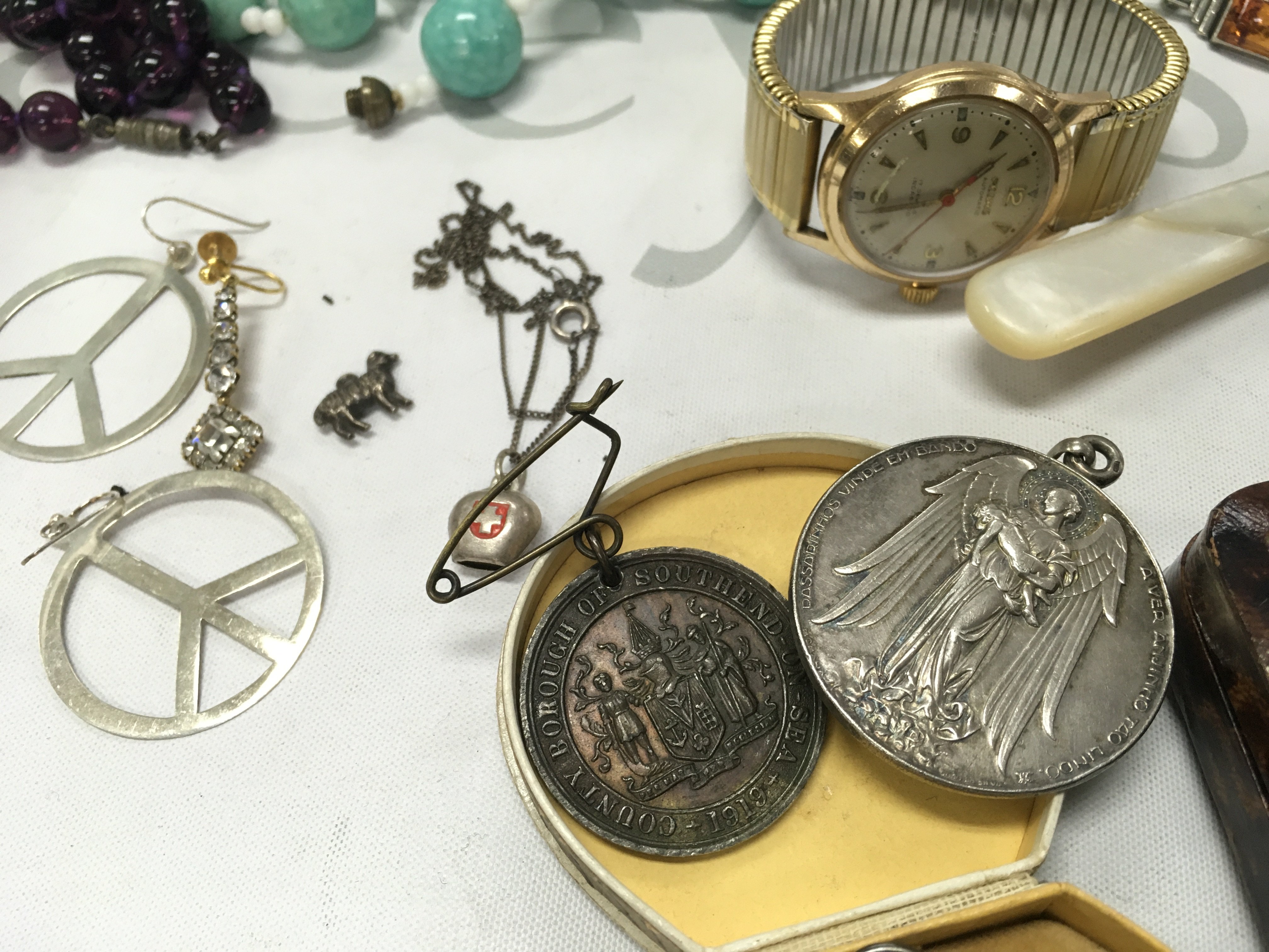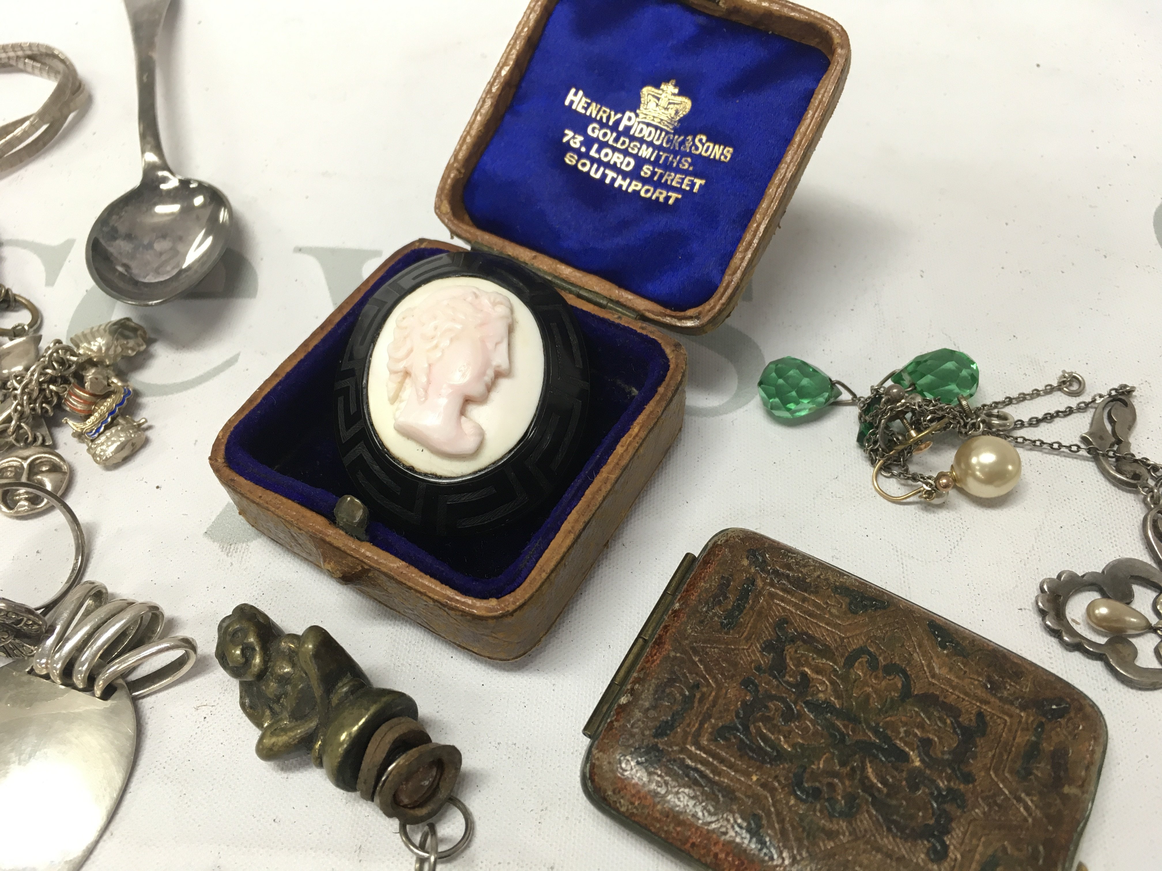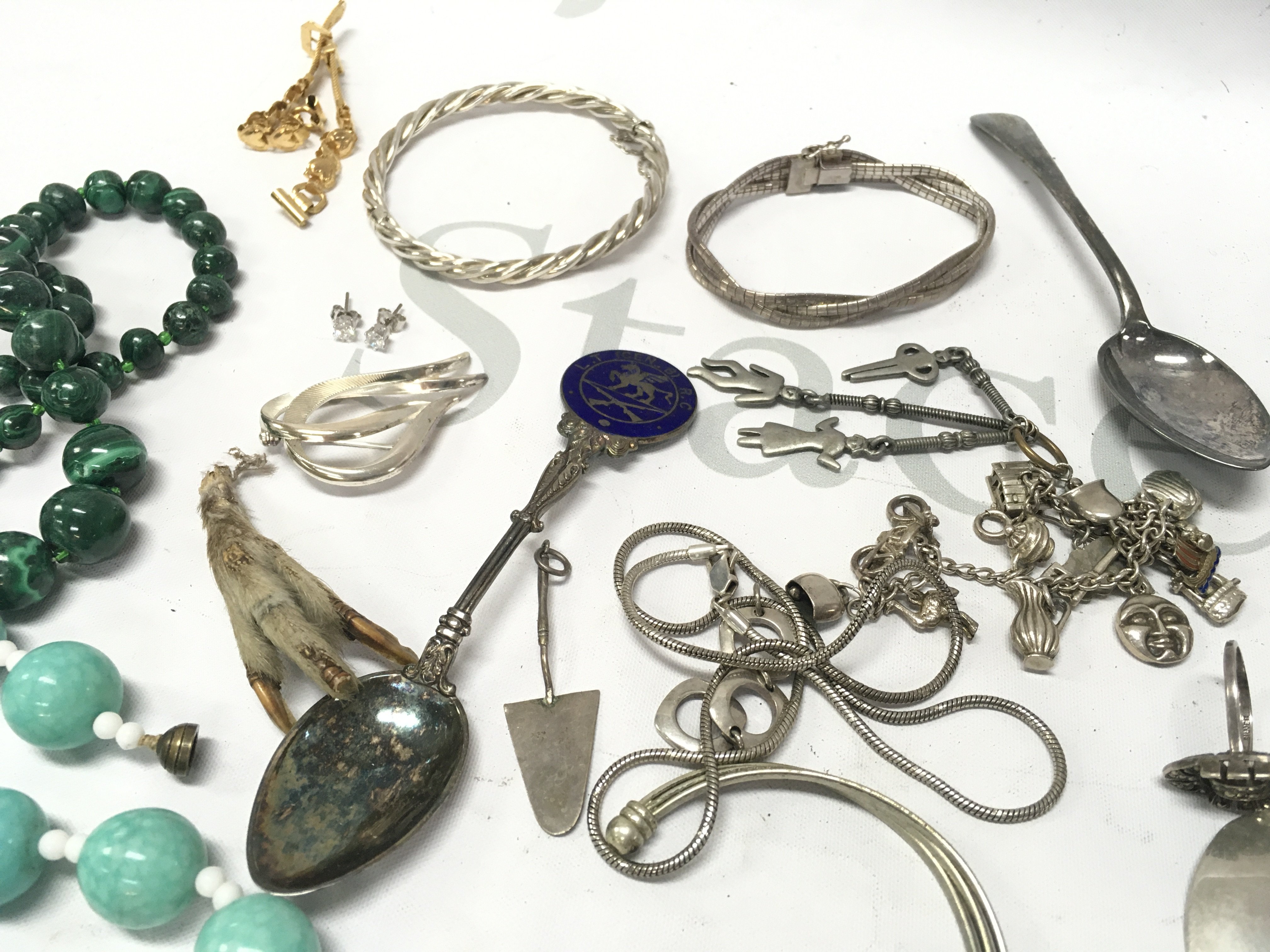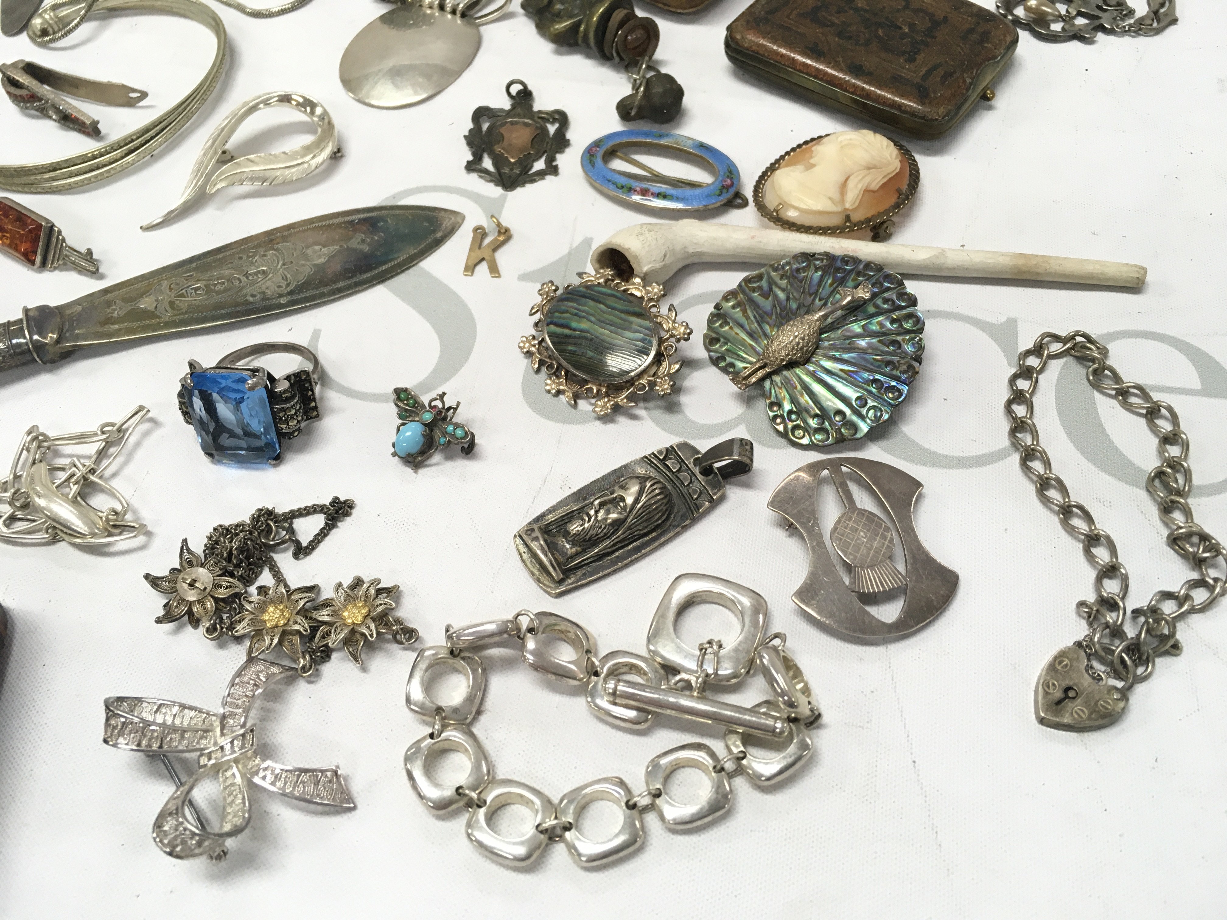 A collection of costume Jewellery including silver pieces such as bracelets, rings , brooches etc , coral jet brooch, 9ct gold K initial pendant, Portuguese medal . Postage category B