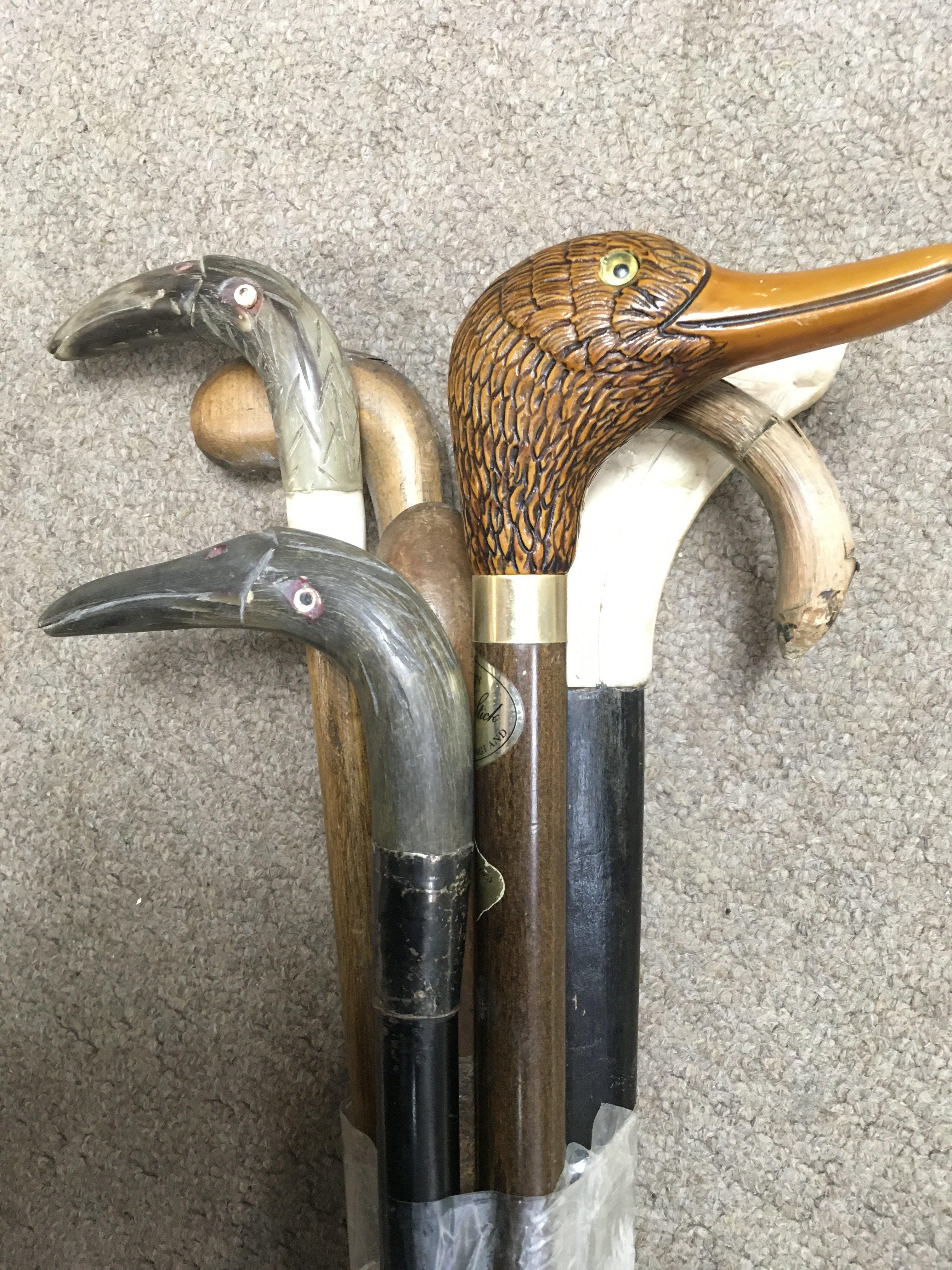 A collection of walking sticks with bird heads.