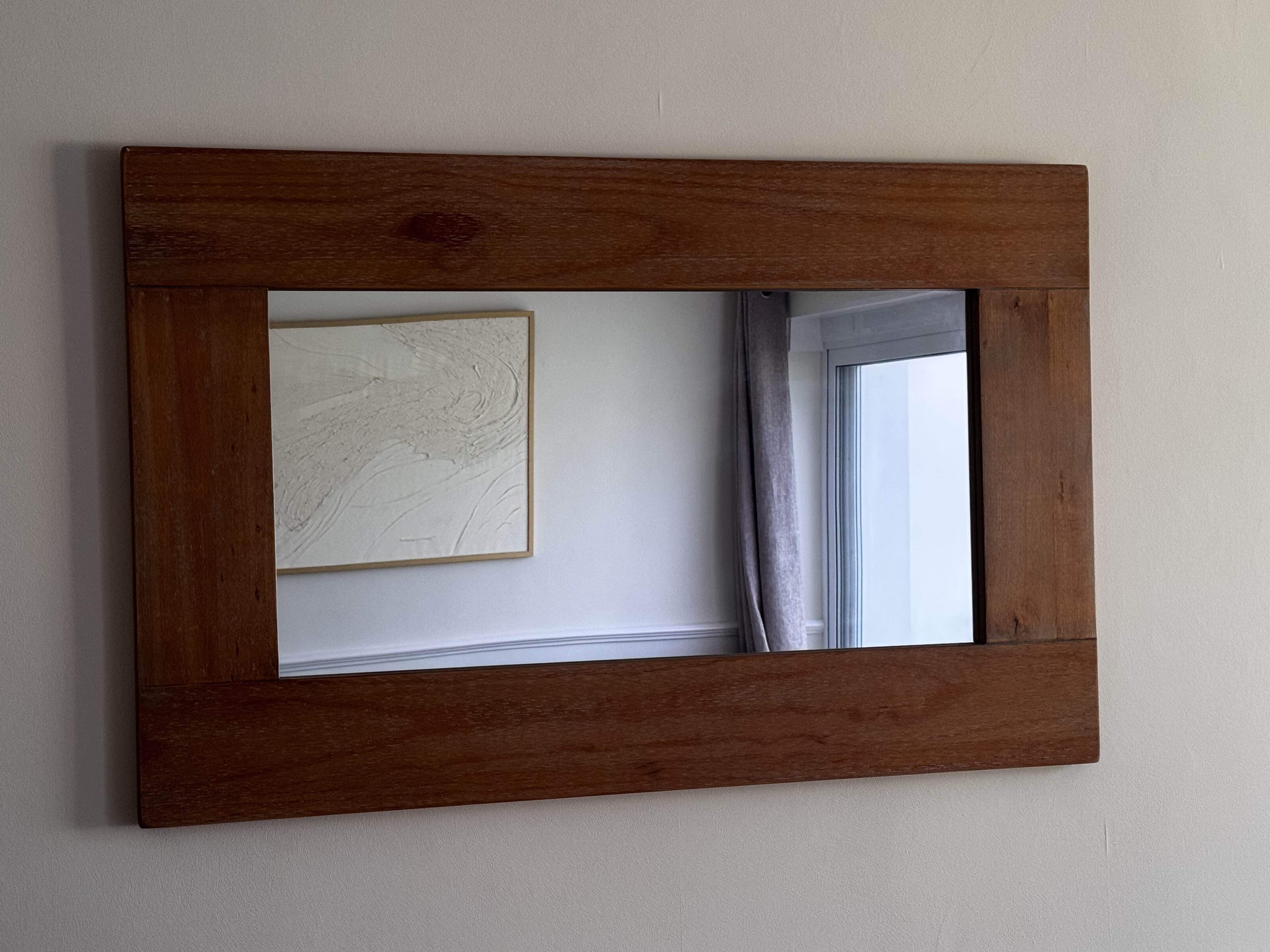 A Modern pitch pine sideboard, cabinet. 98cm x 80cm x 35cm together with a matching wall mirror. 110cm x 70cm.