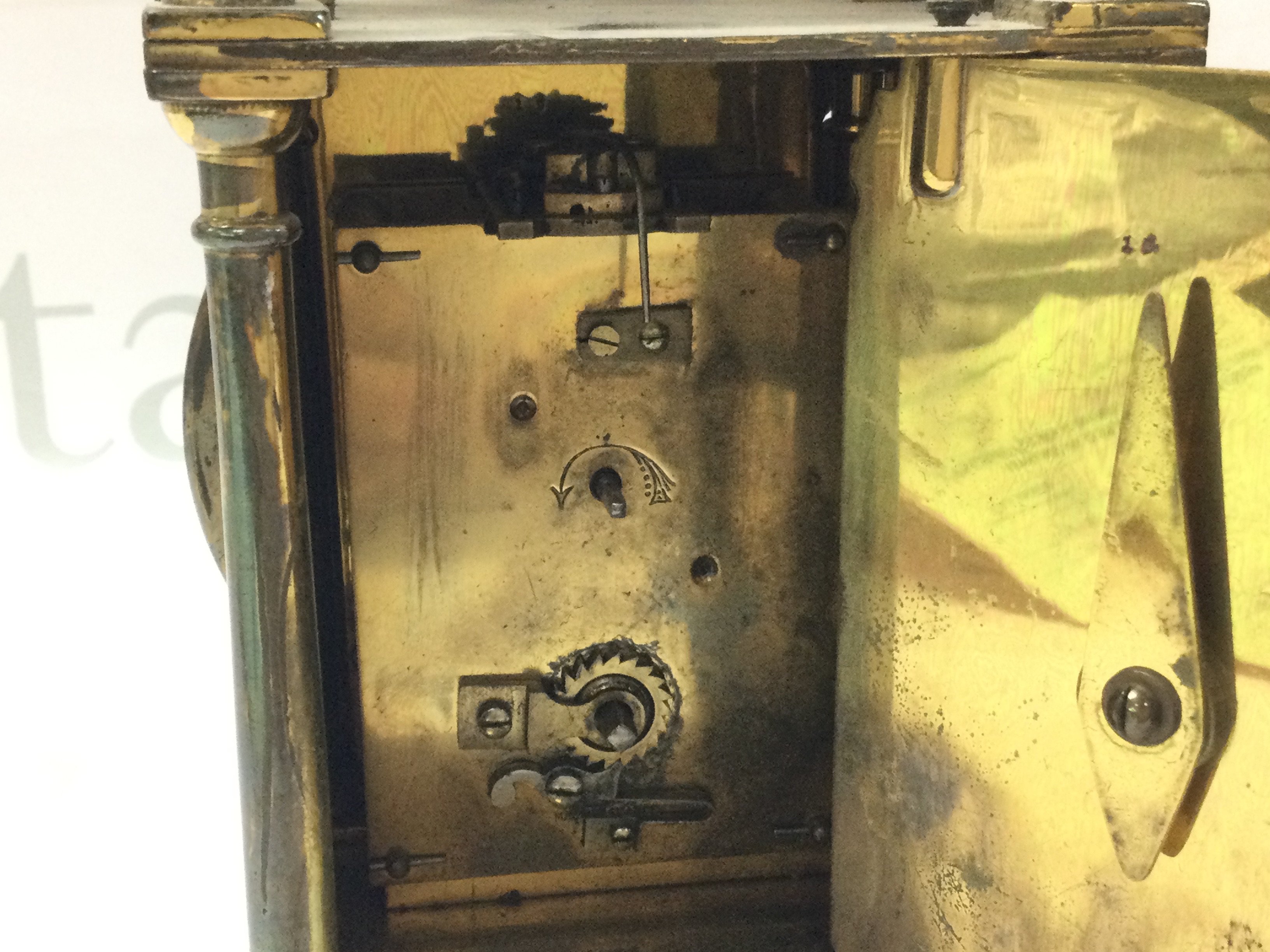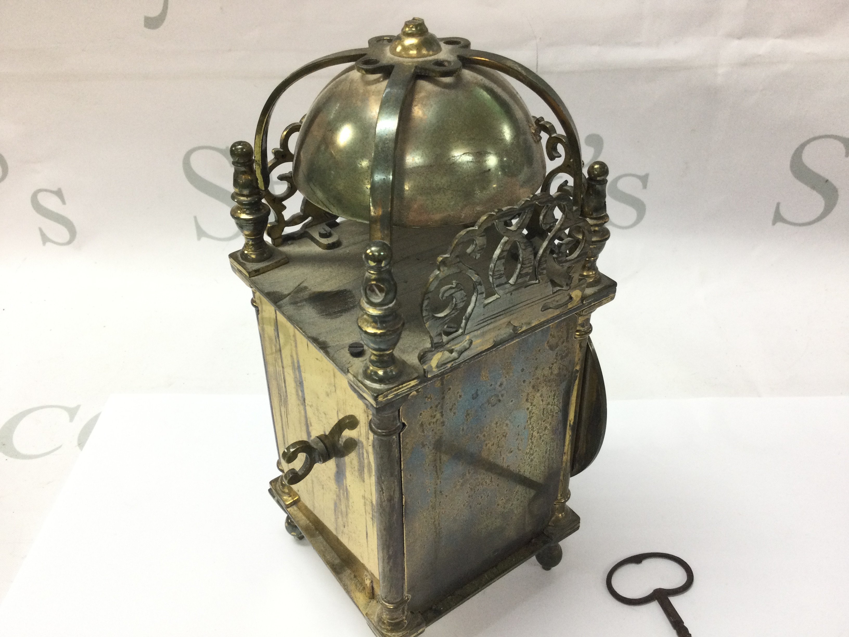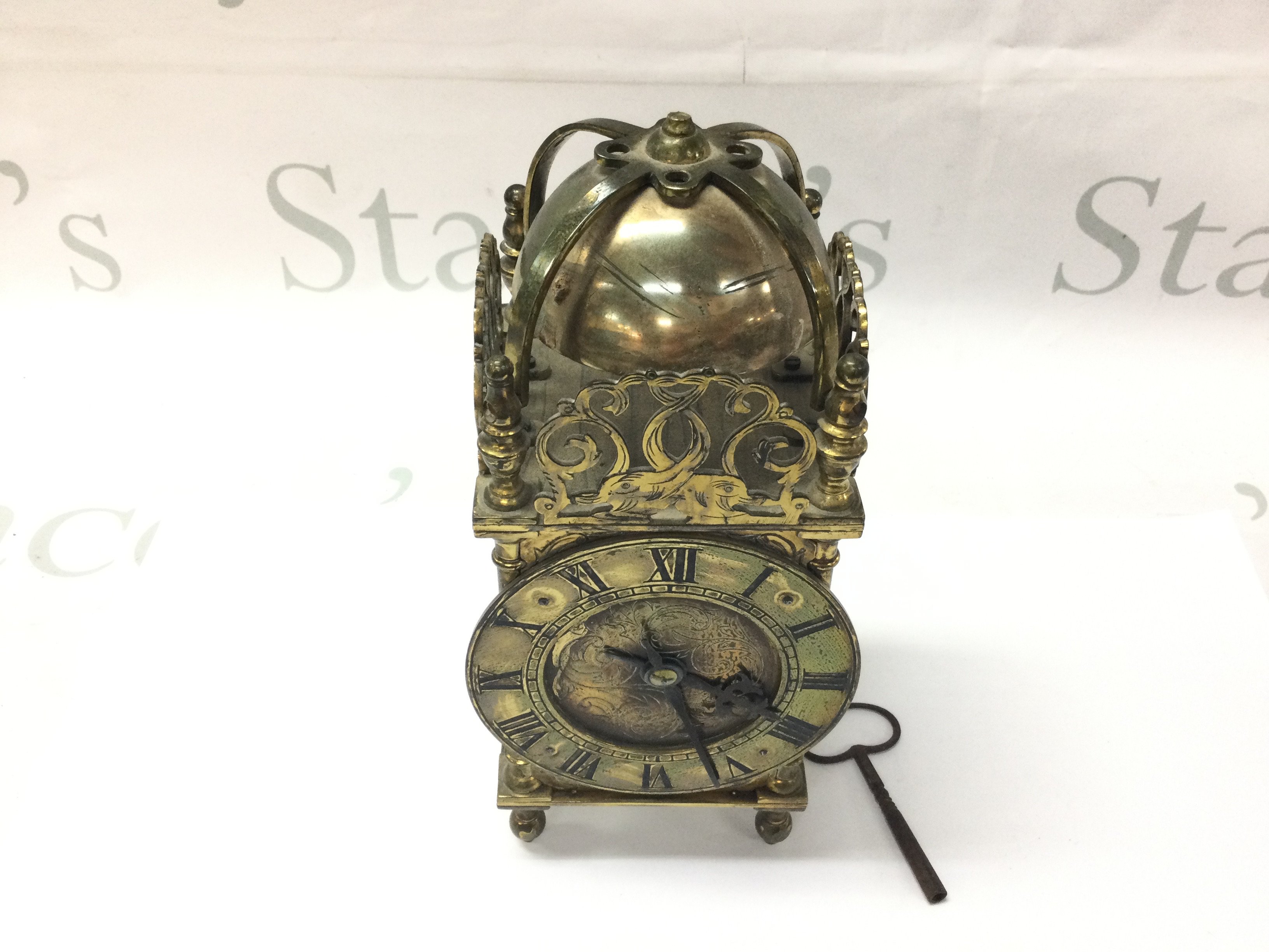 A brass lantern clock. Winds and runs. Approximately 21cm tall.