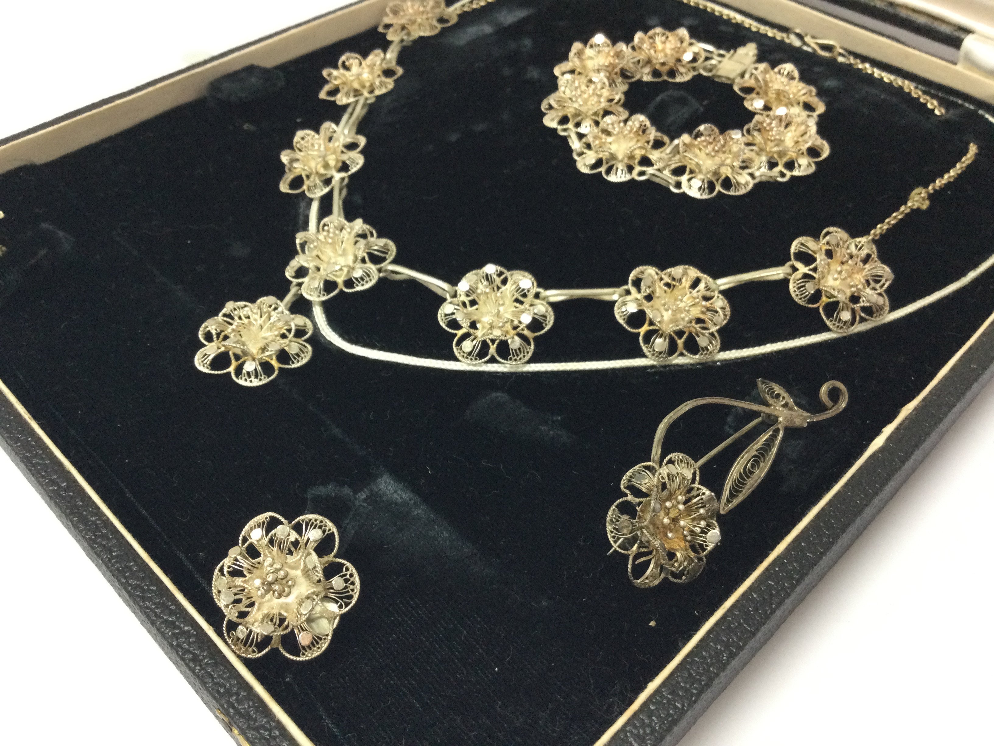 A silver filigree jewellery set including necklace earrings brooch and bracelet. Postage B