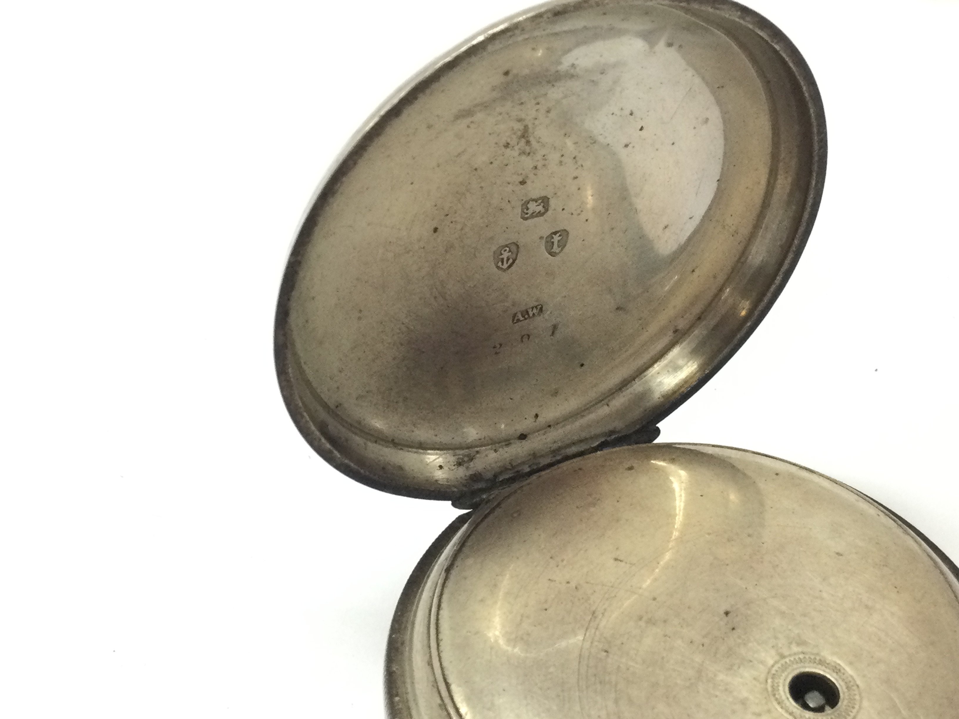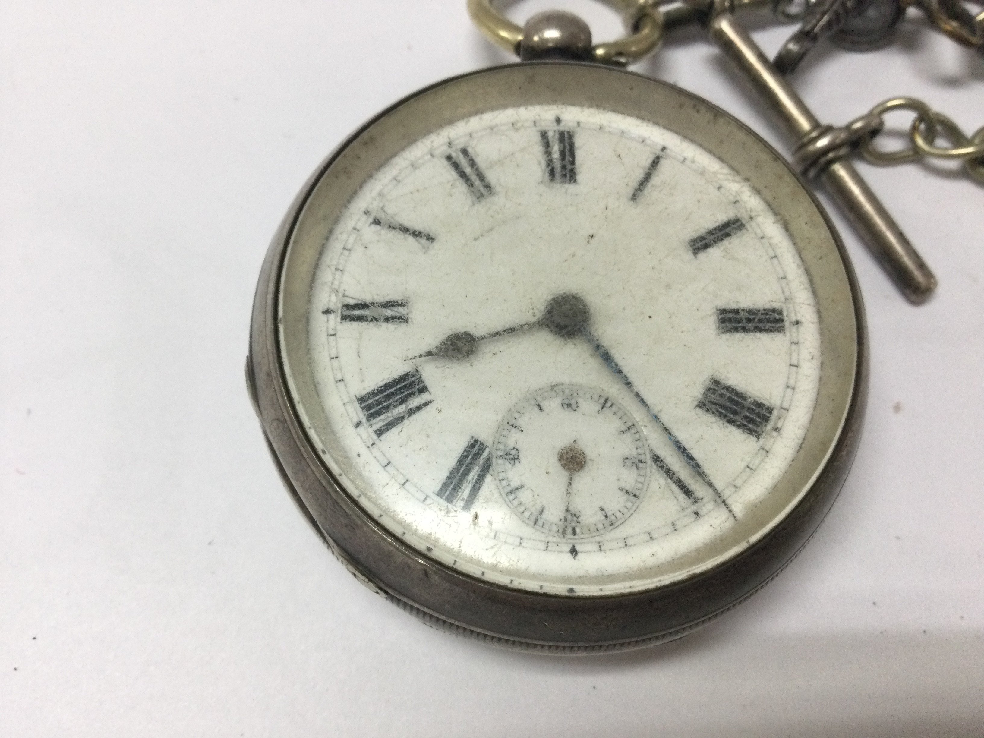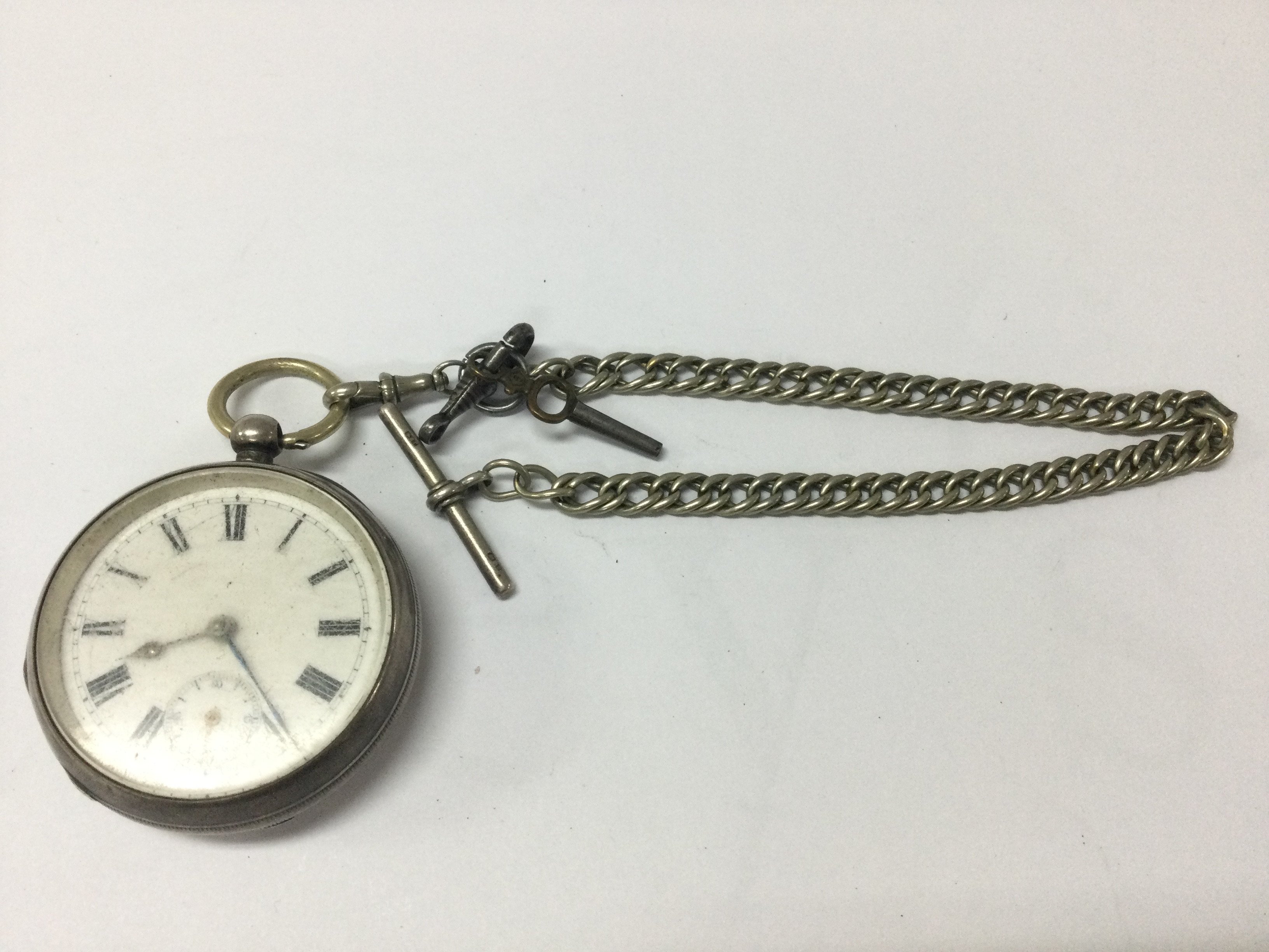 A silver cased pocket watch with silver chain. Not seen running. 154g approx